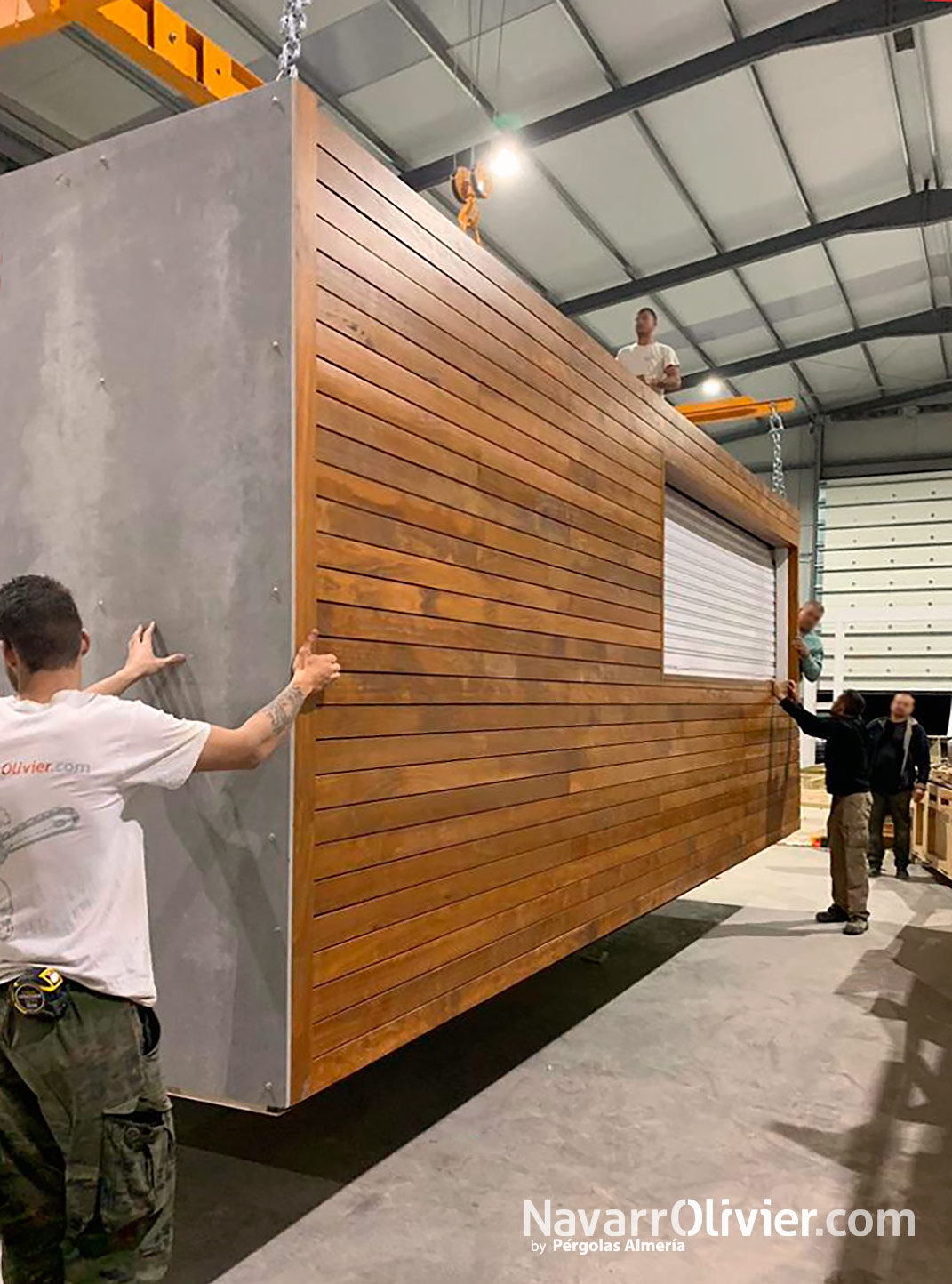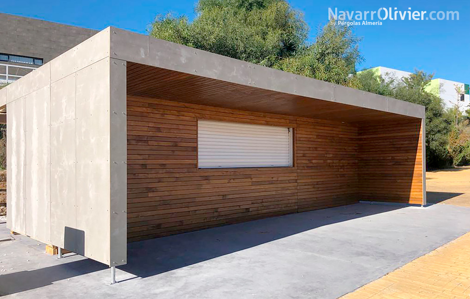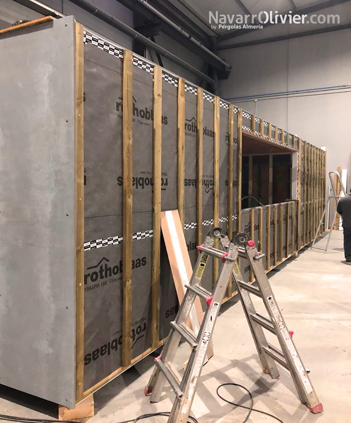 Construcción de cafetería en módulos transportables prefabricados. Construcciín en madera estructural, muros en entramado ligero con aislamiento térmico y acústico.