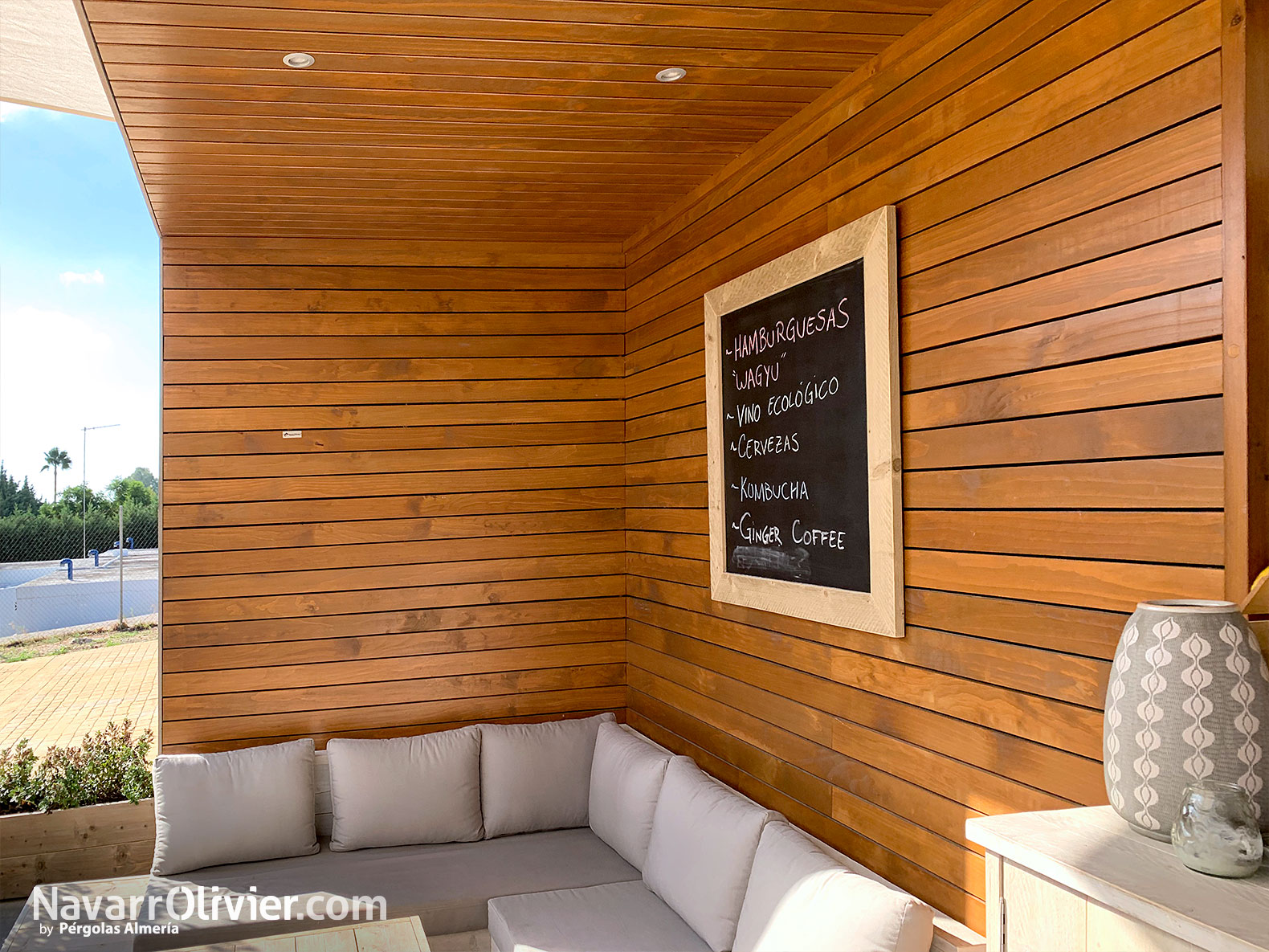 La edificación se divide en 2 módulos que incluyen la zona de barra y cocina vista con un espacio dedicado al almacenaje y aseo accesible. El diseño del local dedicado ha la restauración es de estilo contemporáneo con muros provistos de aislamiento térmico mediante lana de roca con fachada ventilada que reduce la transmitencia térmica, para el revestimiento exterior de los módulos y la zona de terraza cubierta se opto por un bardage de madera tratada y paneles de cemento-madera Viroc®.