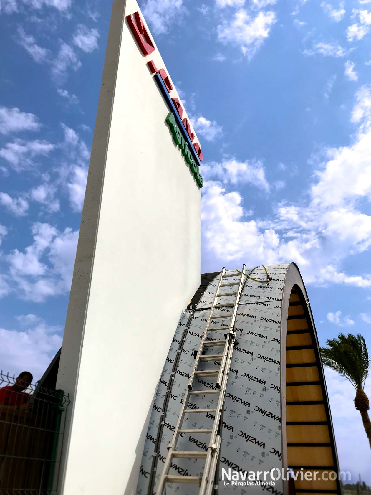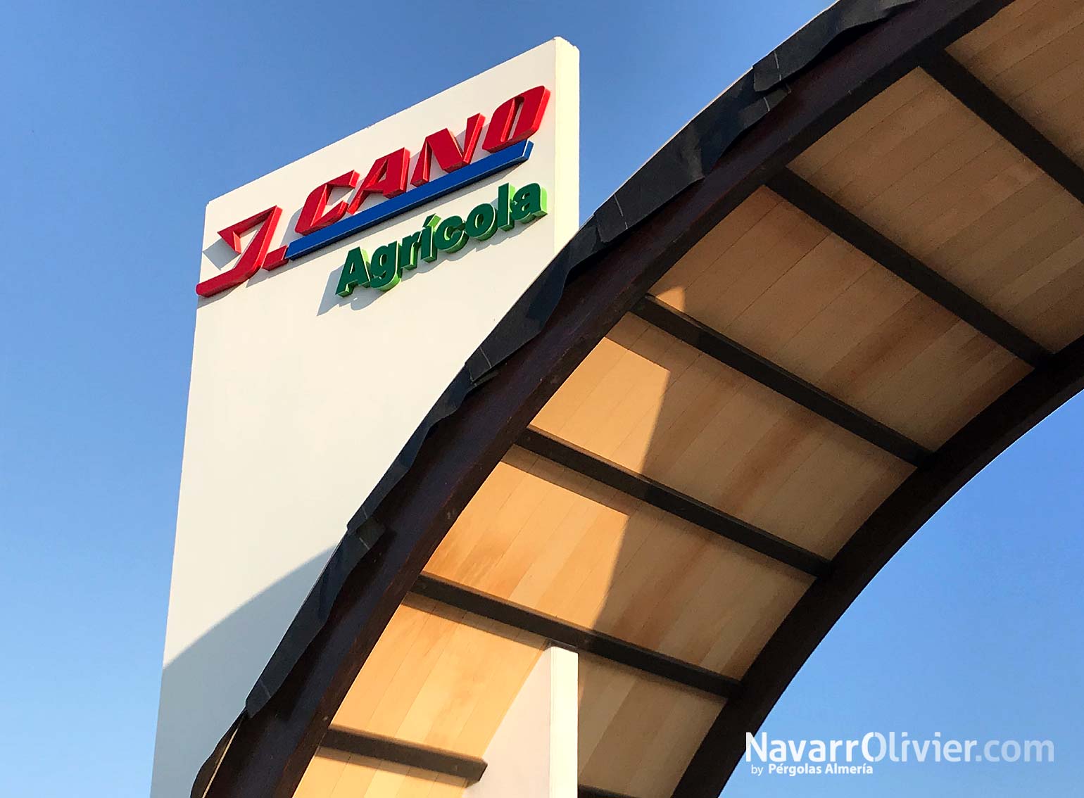 Para el tratamiento de la madera se utilizaron pigmentos naturales y barniz al agua de poro abierto que garantizan la protección y bajo mantenimiento de la instalación. El arco de acceso a la finca agrícola J. Cano se encuentra en Vera, Almería