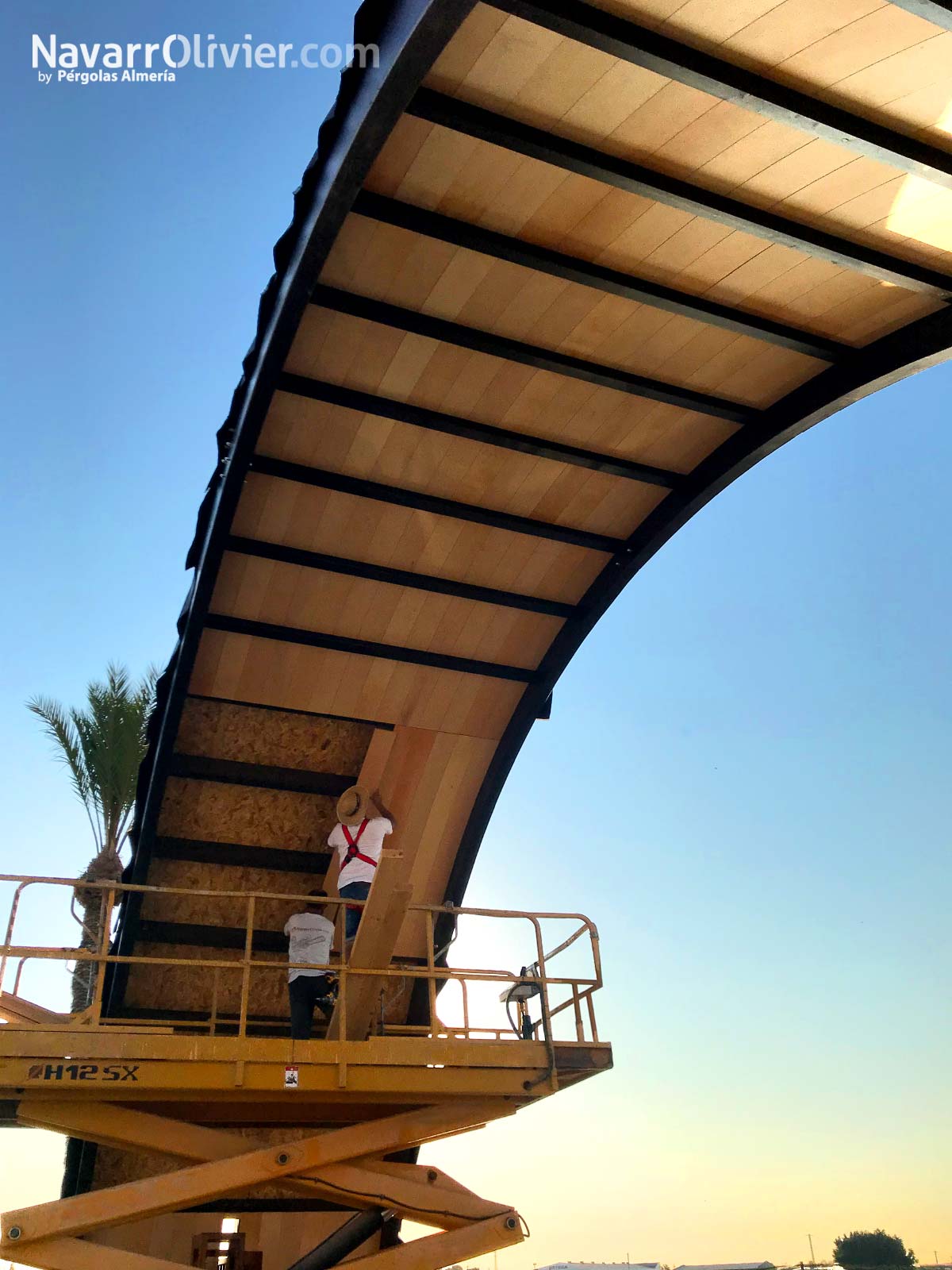 El arco esta fijado a las zapatas de cimentación con anclajes de acero galvanizado soldado, la cubierta exterior se realizó en tablero estructural OSB, impermeabilizado con tela tyvek y rematado en chapa de zinc, para recubrimiento interior se utilizó tablero fenólico de abedul mecanizado.