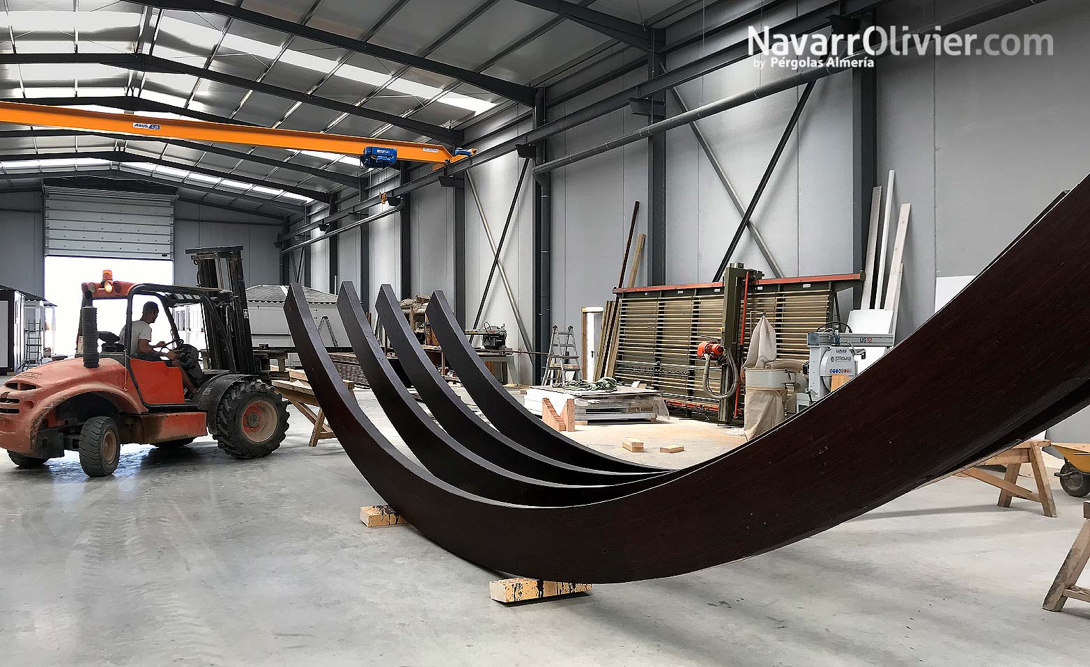 La construcción consta de 2 pórticos de 12 m de luz con una altura de 6,5 m en el interior, las vigas laminadas curvas se fijan entre si mediante uniones mecánicas en estribos ocultos de aluminio con pernios pasantes.