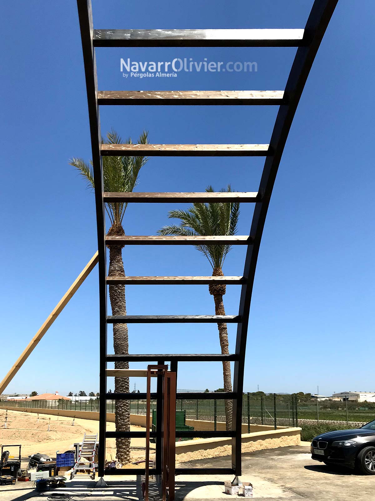 Estructura de madera laminada en abeto Douglas de sección longitudinal curva formando un arco de acceso a la propiedad.