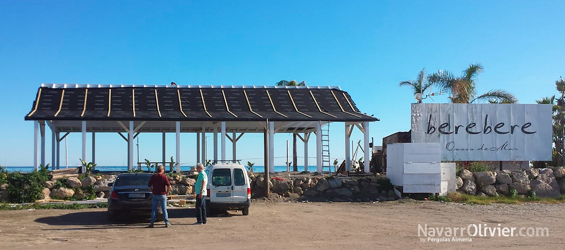 Berebere Oasis de Mar cuenta además con un terraza chillout con suelo en tarima autoclave, zona de terraza con pérgola con cubierta en toldos de palilleria deslizantes y zona de sombraje con red de camuflaje en color beige.
