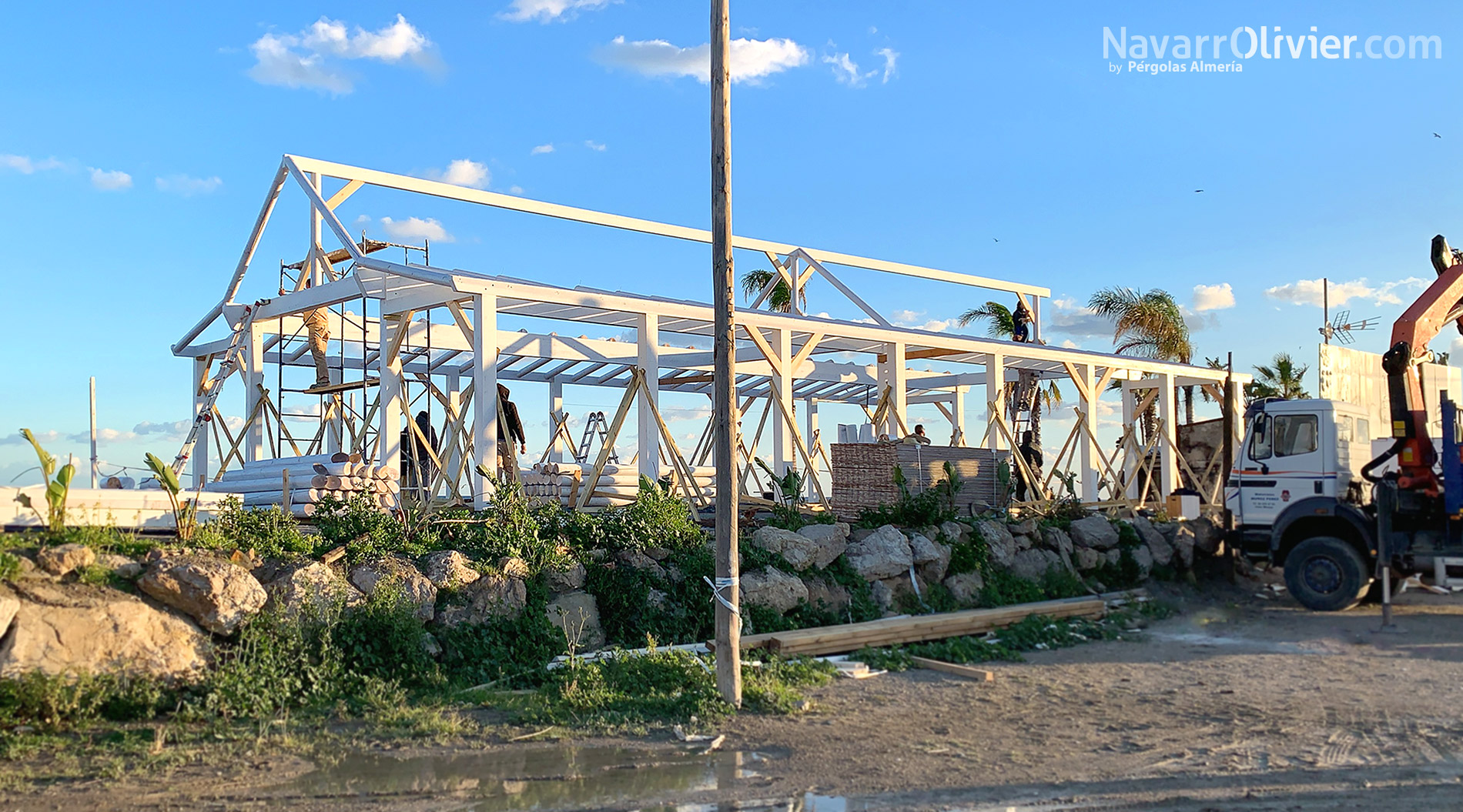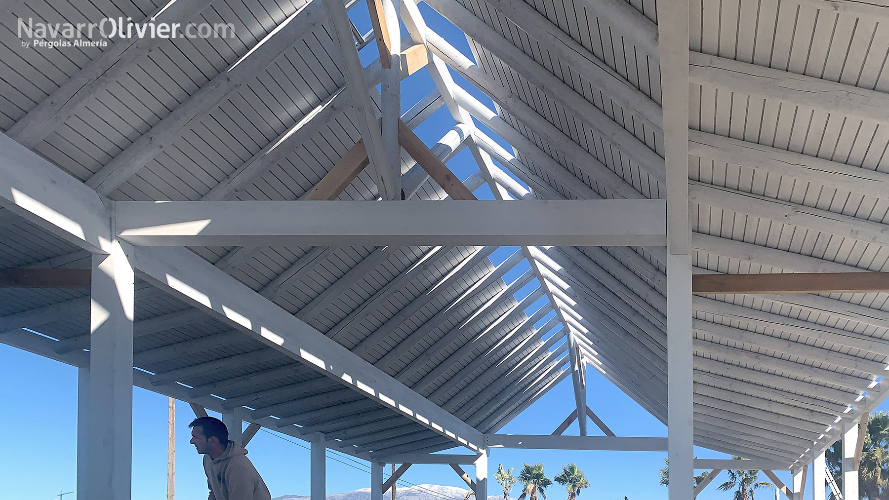 En la construcción del proyecto se optó por el color blanco como acabado de la madera para exterior combinado con texturas naturales como el cañizo de bambú interior que cubre el friso de contrachapado fenólico de la cubierta.