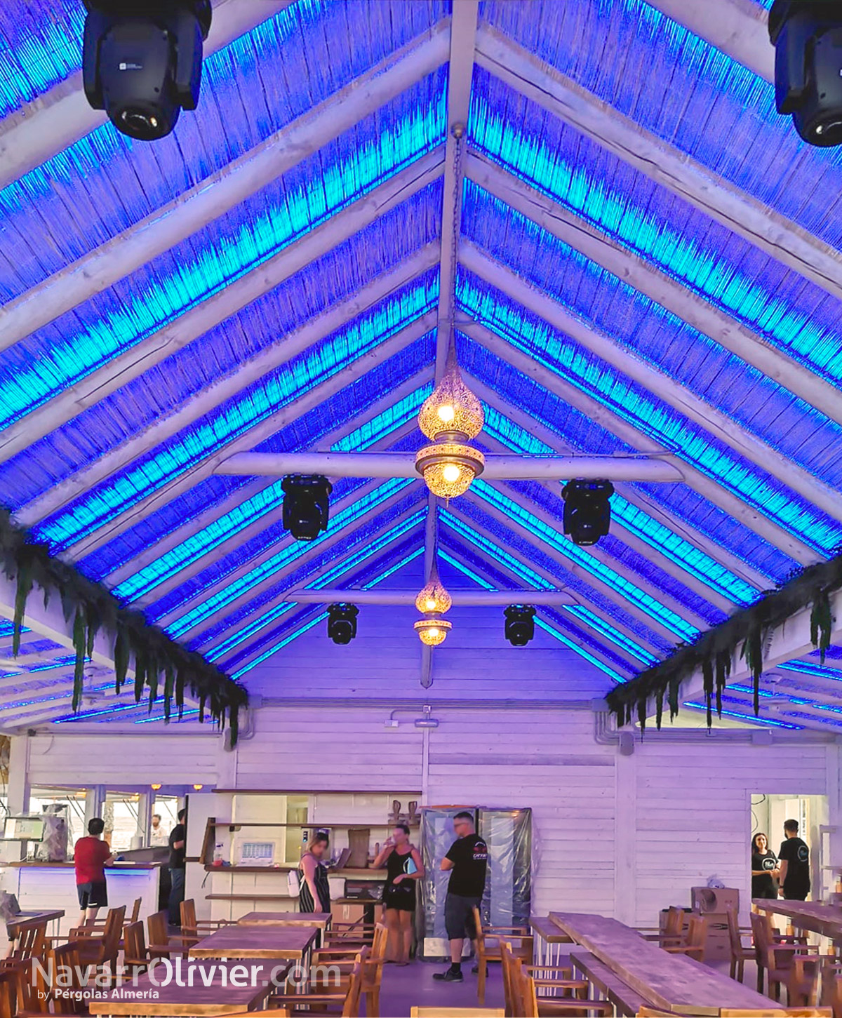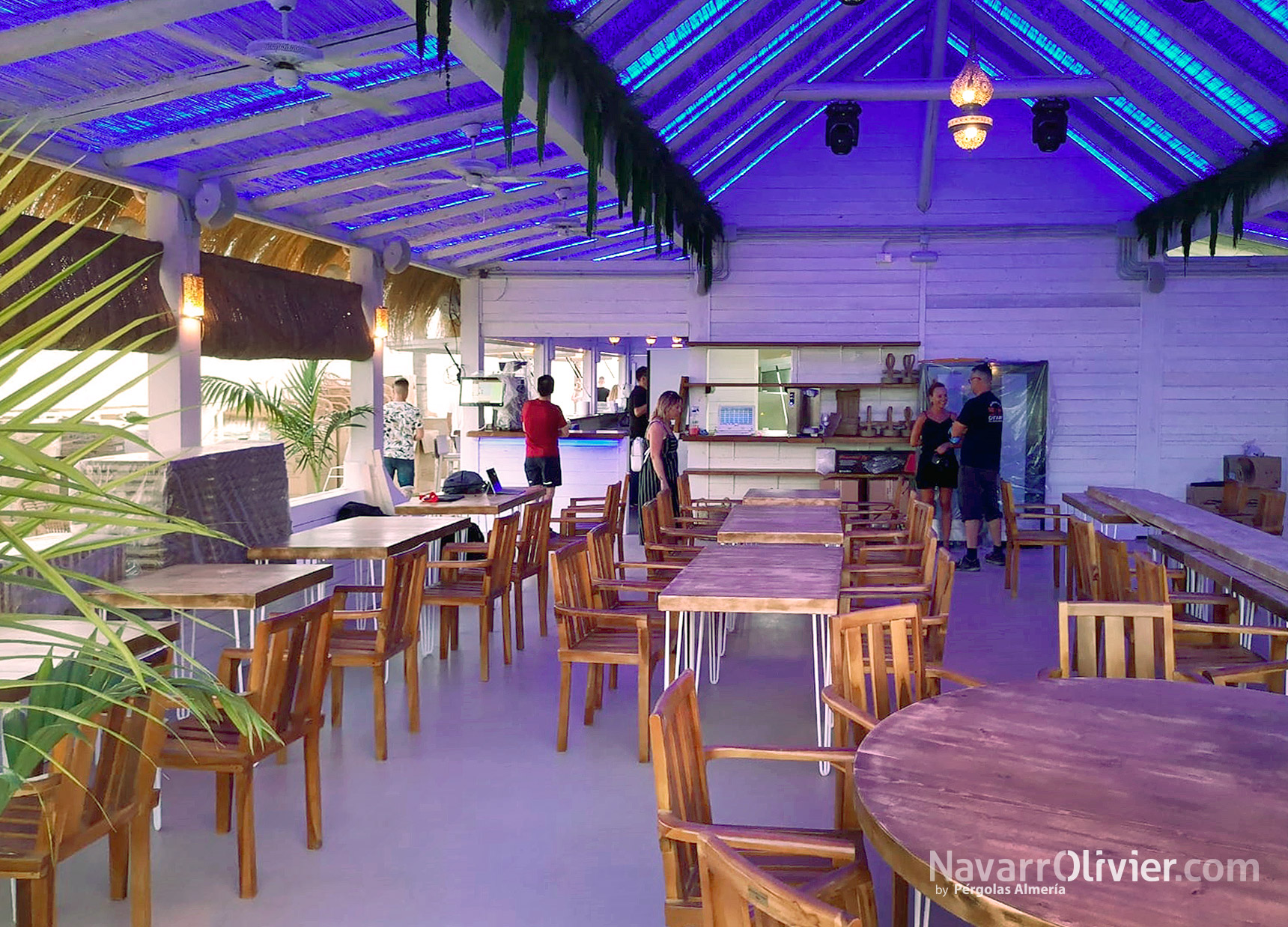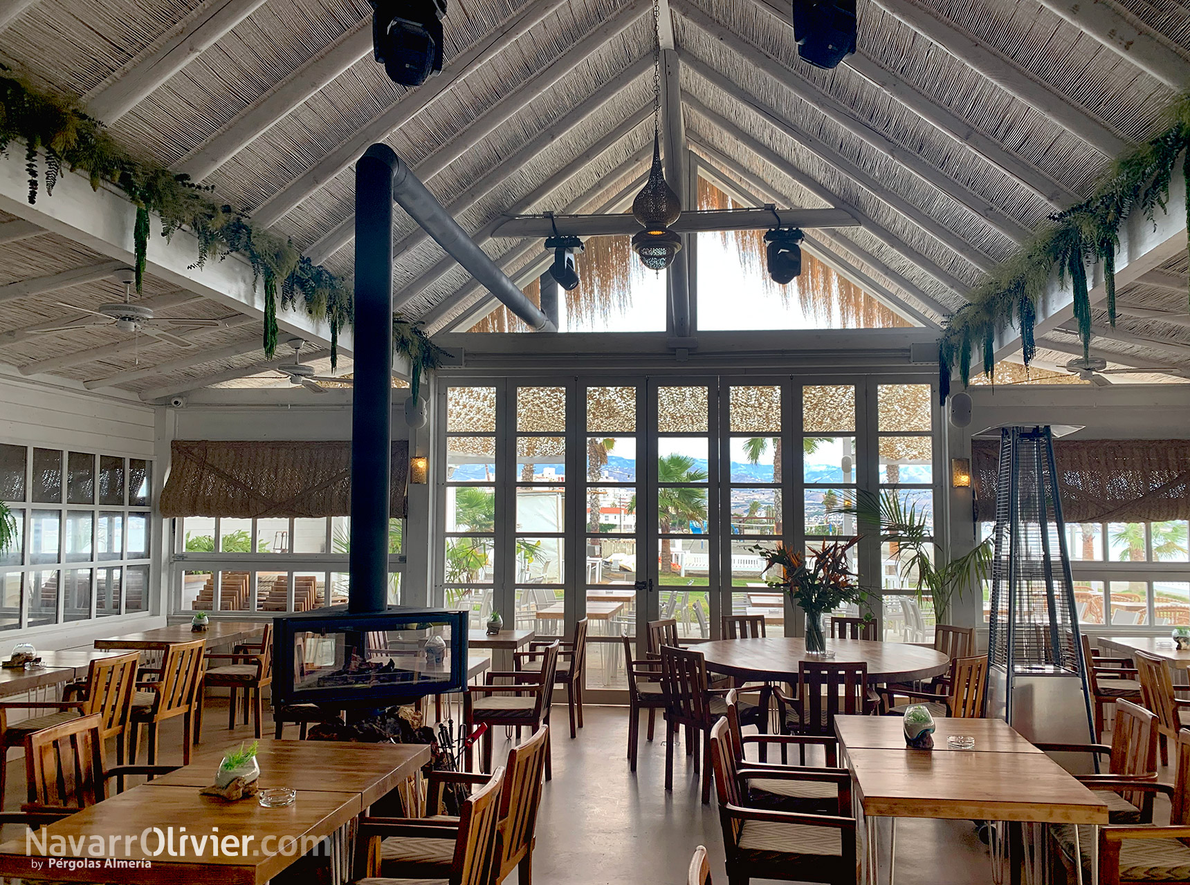 El chiringuito cuenta con grandes portalones de madera con cristal repartido abatibles con pistones de gas para facilitar su apertura y cierre permitiendo además que la luz natural bañe el interior de la zona de restaurante.