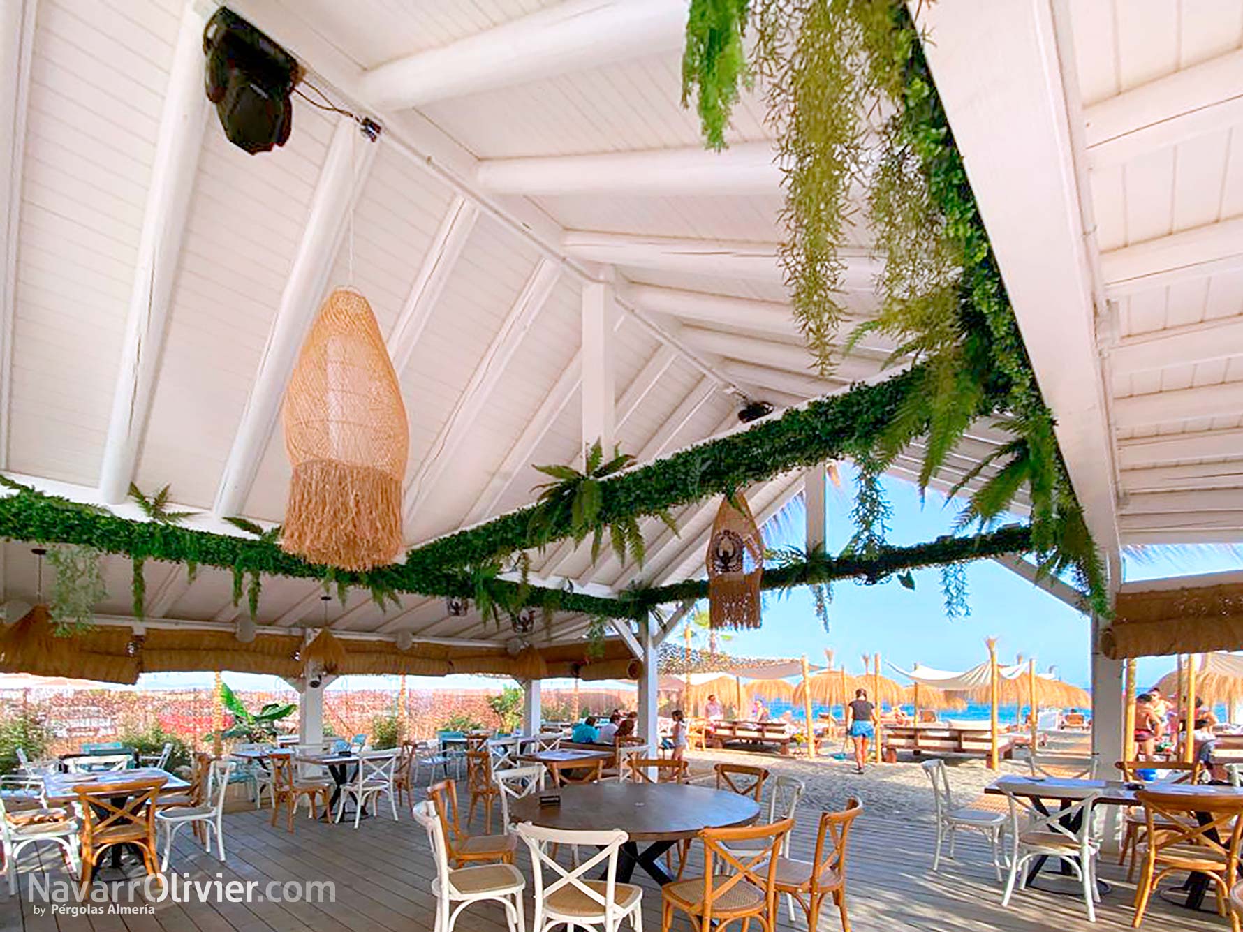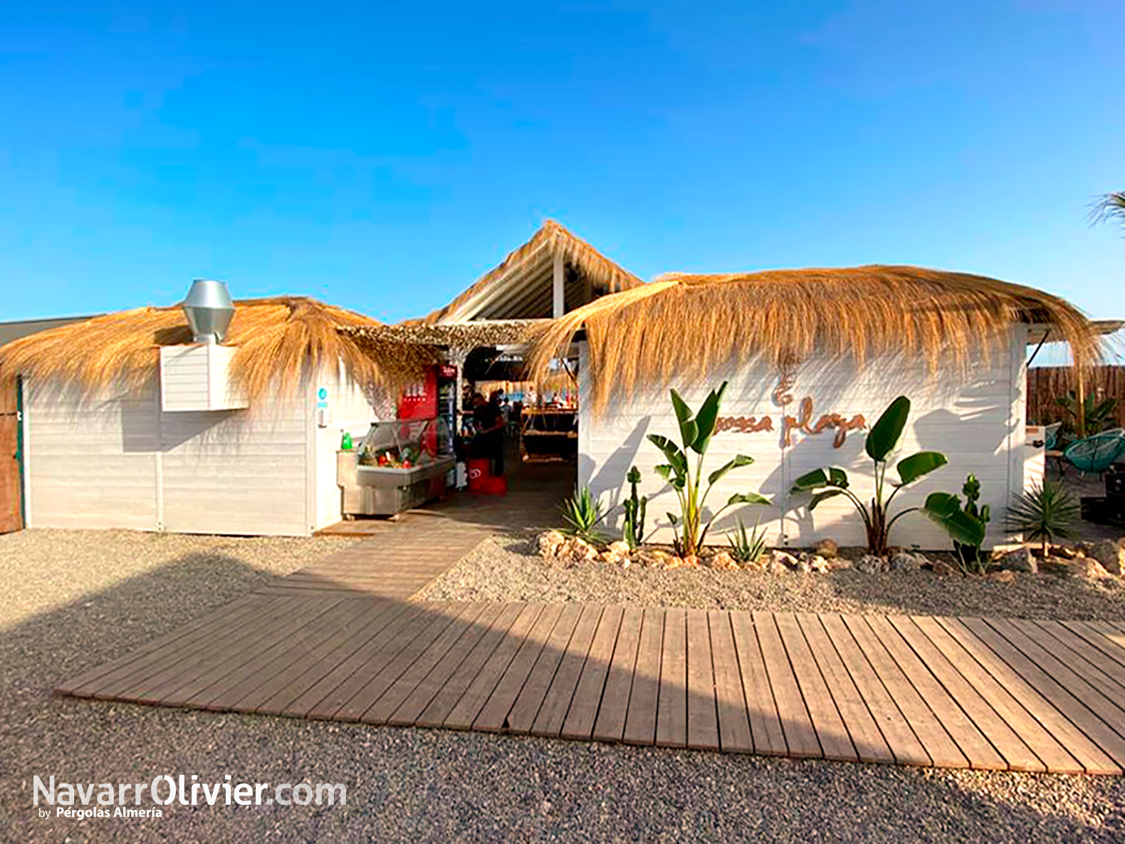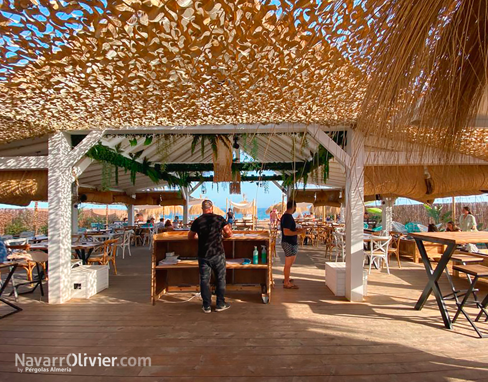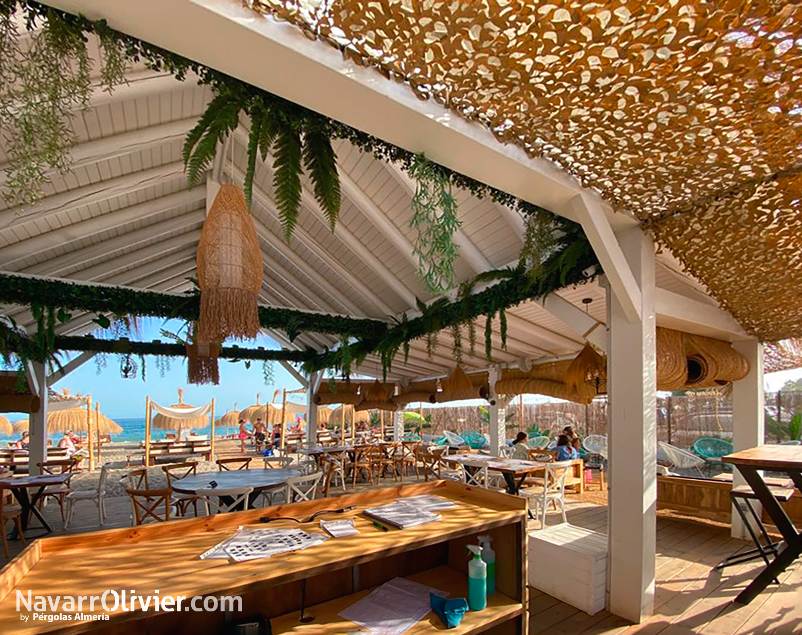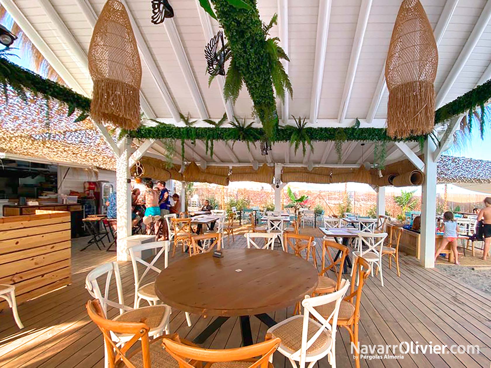 La pérgola sirve como zona de bar y comedor y cuenta con un suelo de tarima en madera autoclave ranurada que se extiende hasta la zona de barra, aseos y acceso al área de sombrillas.