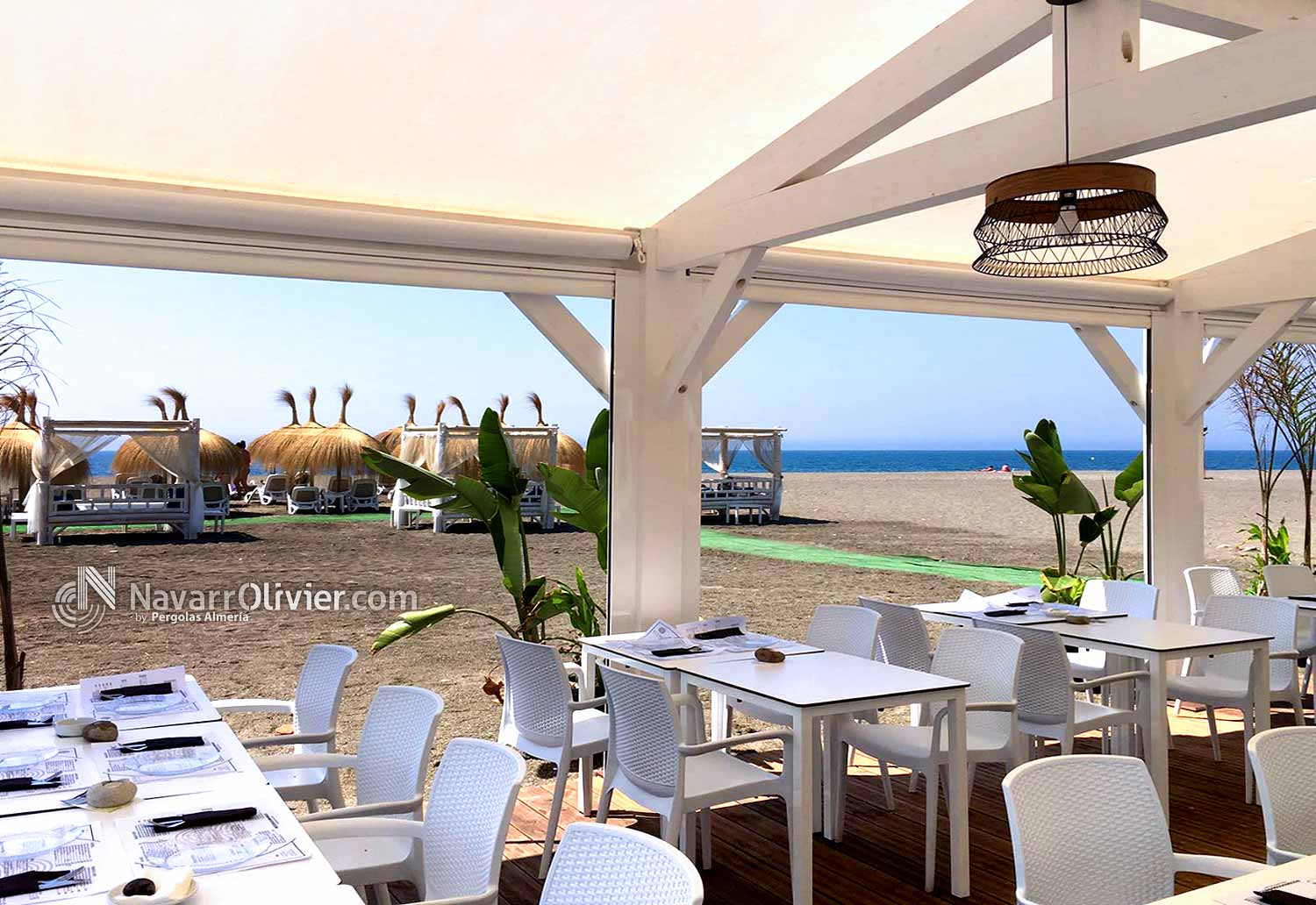 Terraza con pérgola desmontable para sombraje en madera para exterior acabado en blanco neutro, suelo en tarima autoclave clase IV con ranurado antideslizante acabado en marrón (tanatone), cubierta en pvc ignífugo y toldos corta viento enrollables con zona transparente sobre guías de aluminio.