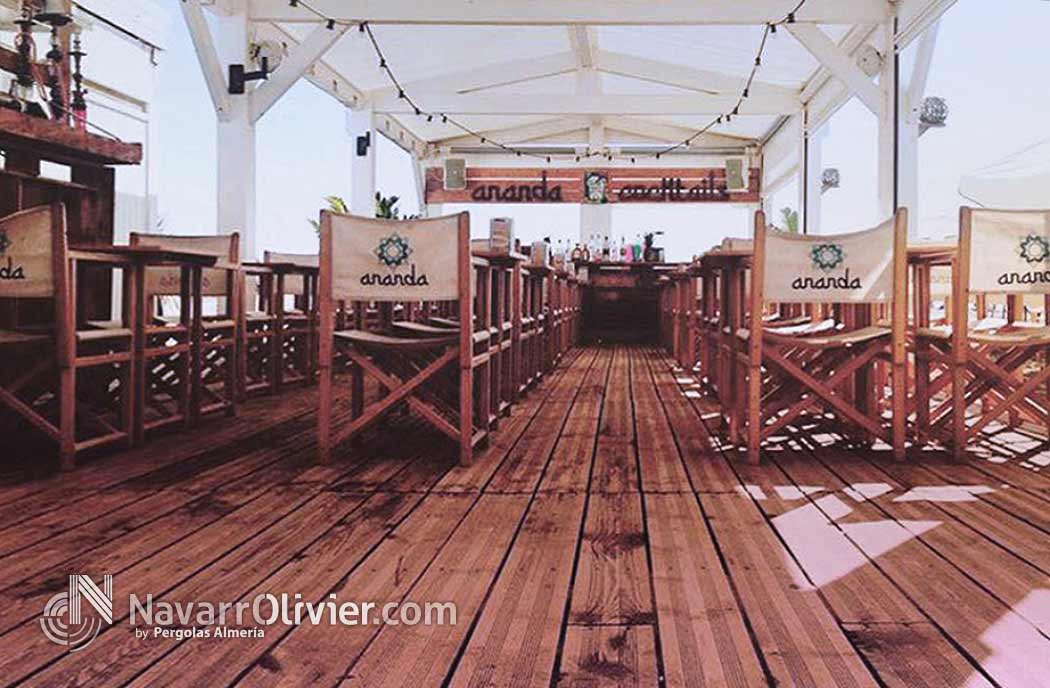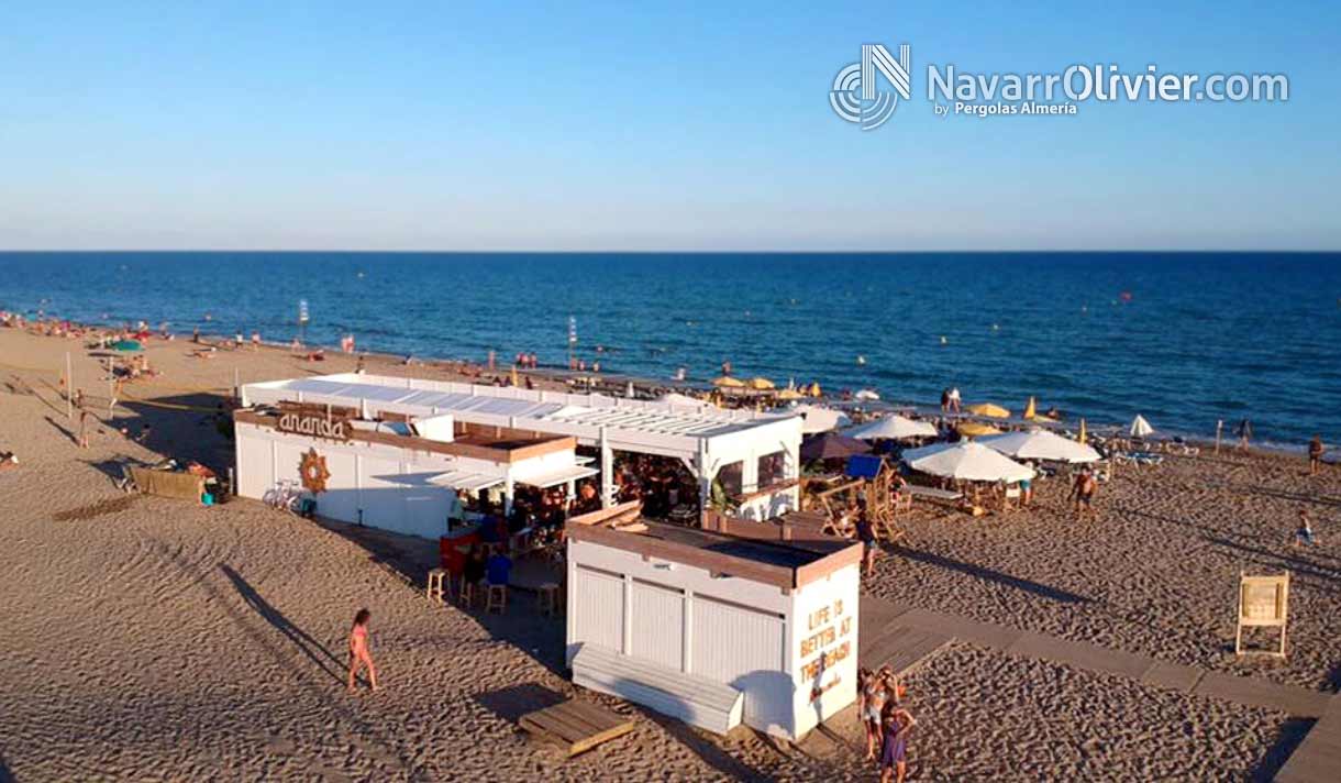 Las instalaciones desmontables construidas por NavarrOlivier constan de diferentes módulos fabricados en madera para exterior, entre los que se incluyen: chiringuito modelo Castelldefels configurado con zona de bar y cocina de 20 m2, módulo de aseos dobles accesibles con ventilación forzada, pérgola de sombraje en madera tratada con cubierta de pvc a 2 aguas equipada con toldos corta viento con guías de aluminio, pasarela y tarima tratada en autoclave clase IV.