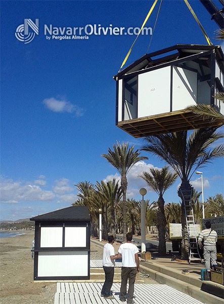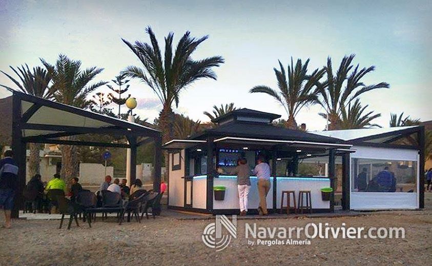 Chiringuito modular de 20 m2 a cuatro aguas modelo Mojácar by NavarrOlivier acabado en color blanco y wengue.