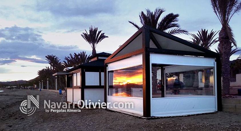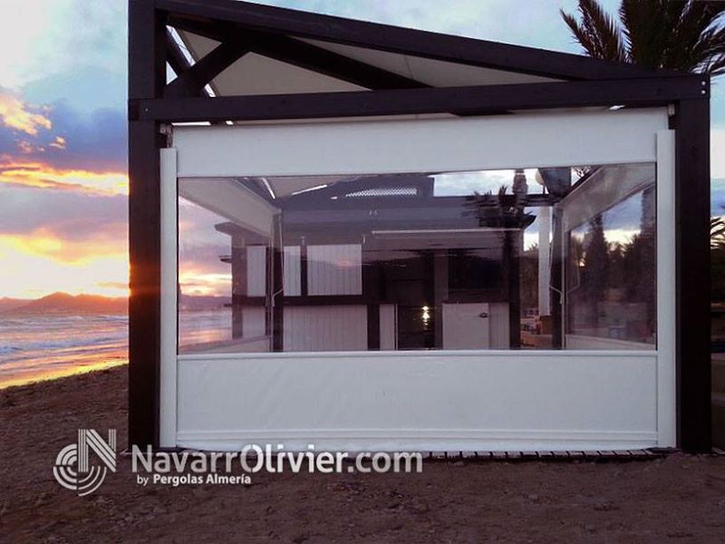 Dada la escasa superficie de la playa la configuración del establecimiento se completa con 2 pérgolas con pendiente a 2 aguas sobre la diagonal, con toldos enrollables corta viento con una gran superficie transparente que permite apreciar los fantásticos atardeceres junto al mar.