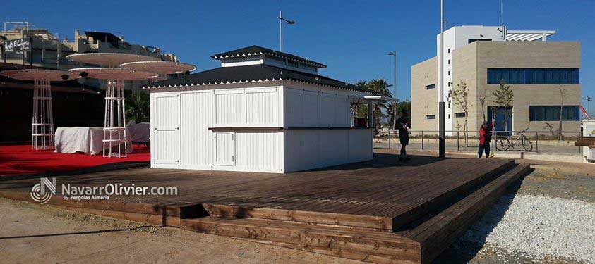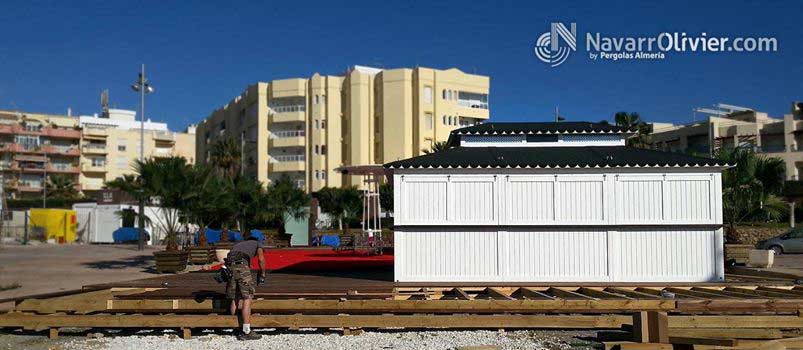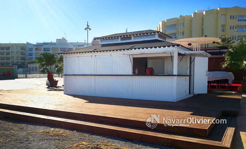 La instalación modular consta de un chiringuito modelo Mojácar configurado en 30 m2, manteniendo las cuatro aguas del diseño original y el campañil de ventilación.
