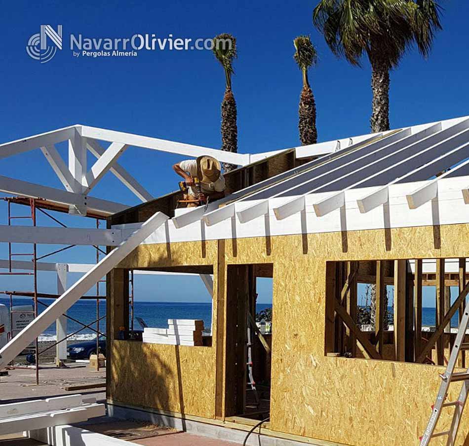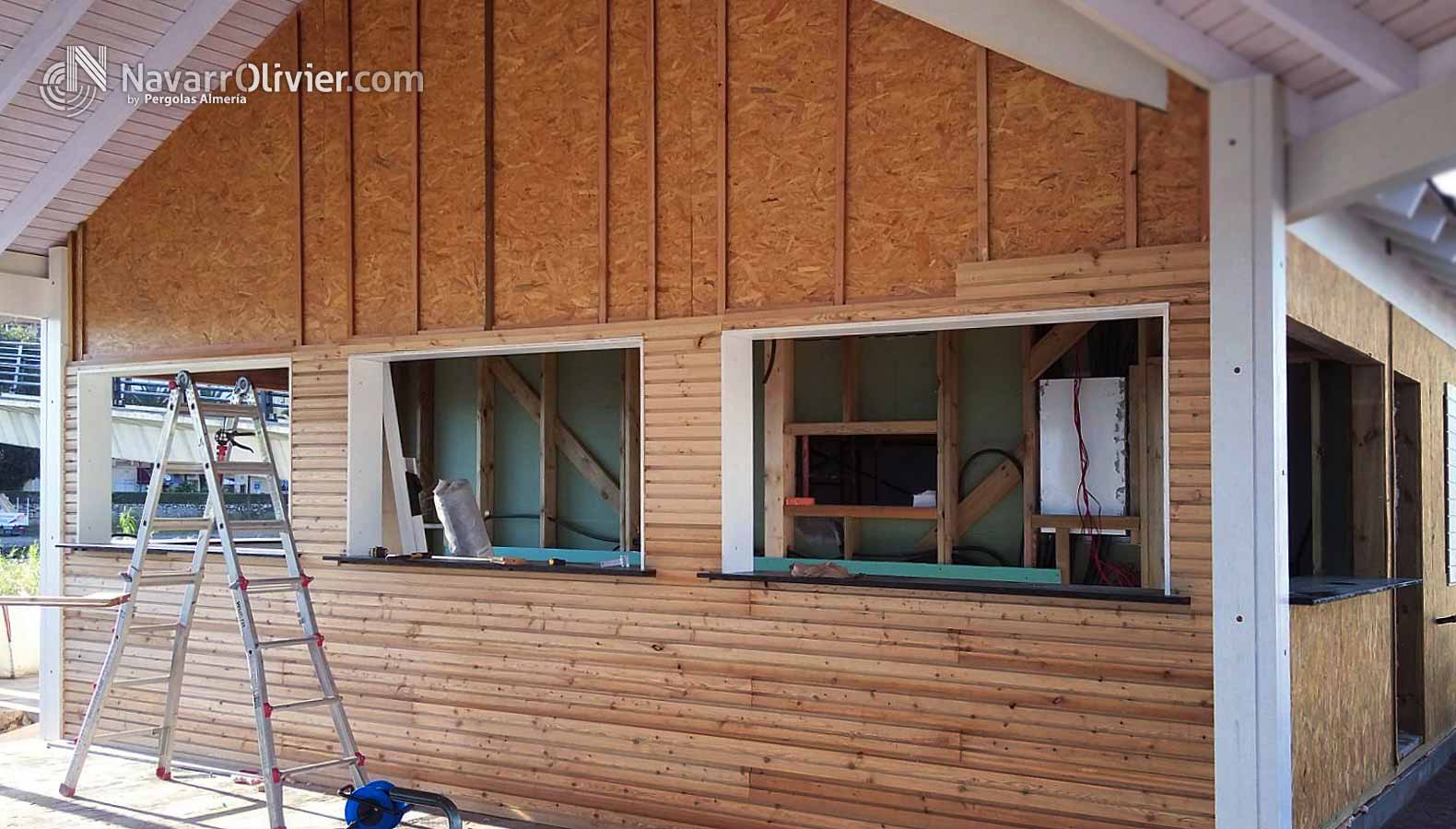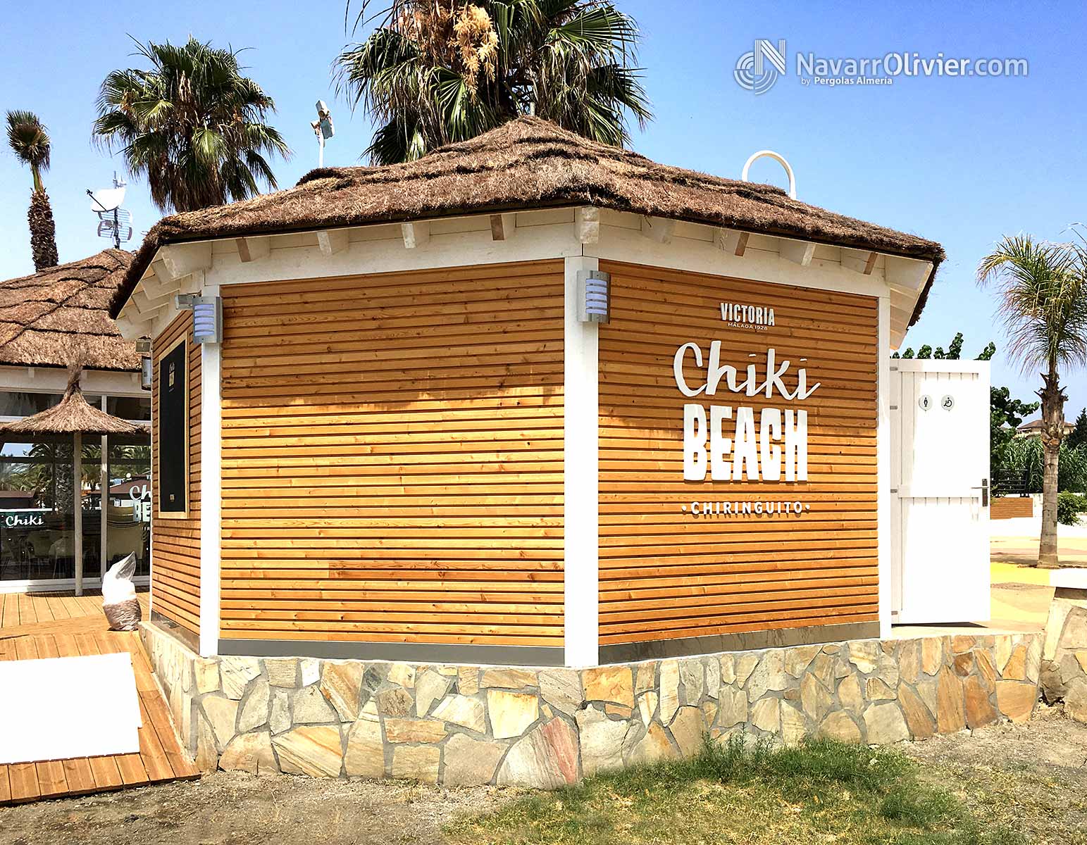 Chiringuito Restaurante Bio Chiki Beach es una construcción fija de estructura poligonal en entramado pesado con fachada ventilada acabado exterior en bardage de alerce, aislamiento en lana de roca piel interior en pladur hidrófugo, alicatado en sector de cocina.