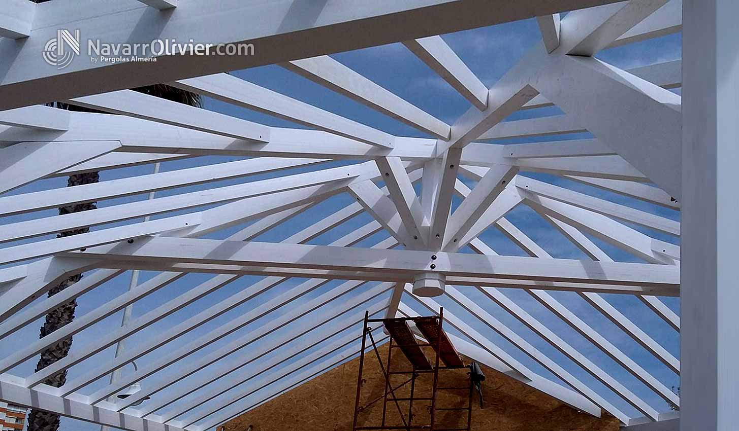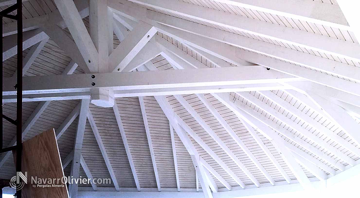 Estructura principal de cubierta y zona de terraza en vigas de madera laminada con correas en madera maciza, friso en tablero fenólico ranurado.