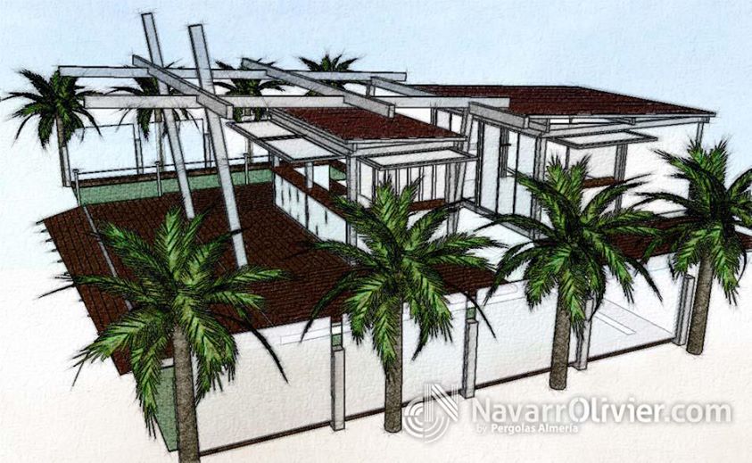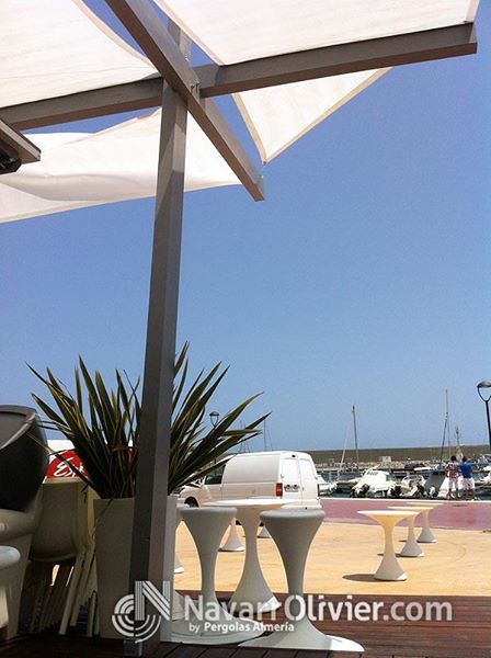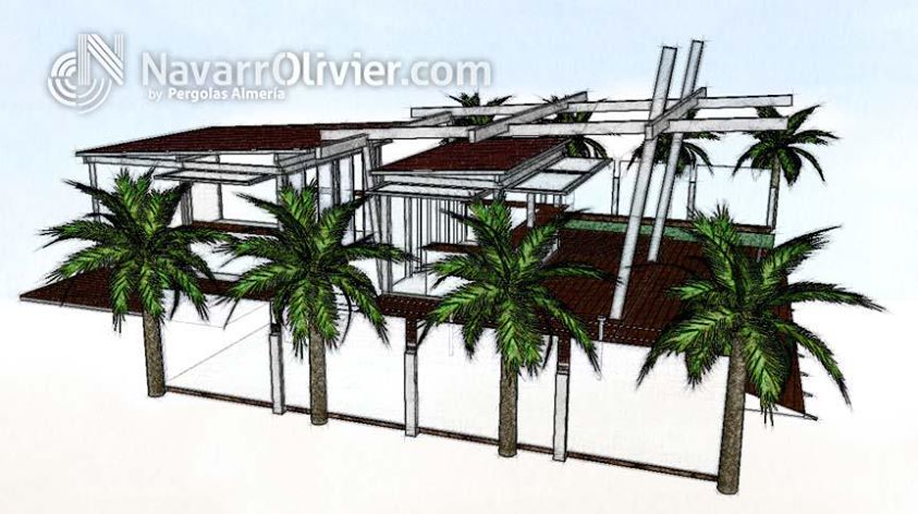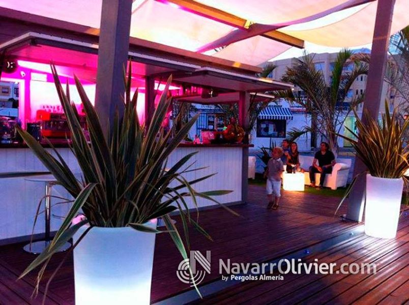 El montaje consta de un chiringuito de 10 m2 modelo Campello con pérgola extraplamada y cubierta en material micro perforado ignífugo.