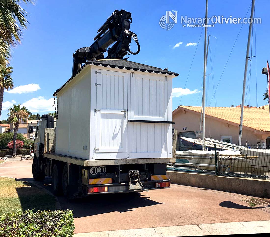 La construcción se transporta equipada con la instalación eléctrica sujeta a normativa lista para funcionar. El quiosco cuenta con una pérgola adosada construida en madera laminada con pilares extra plomados con cubierta en pvc micro perforado.