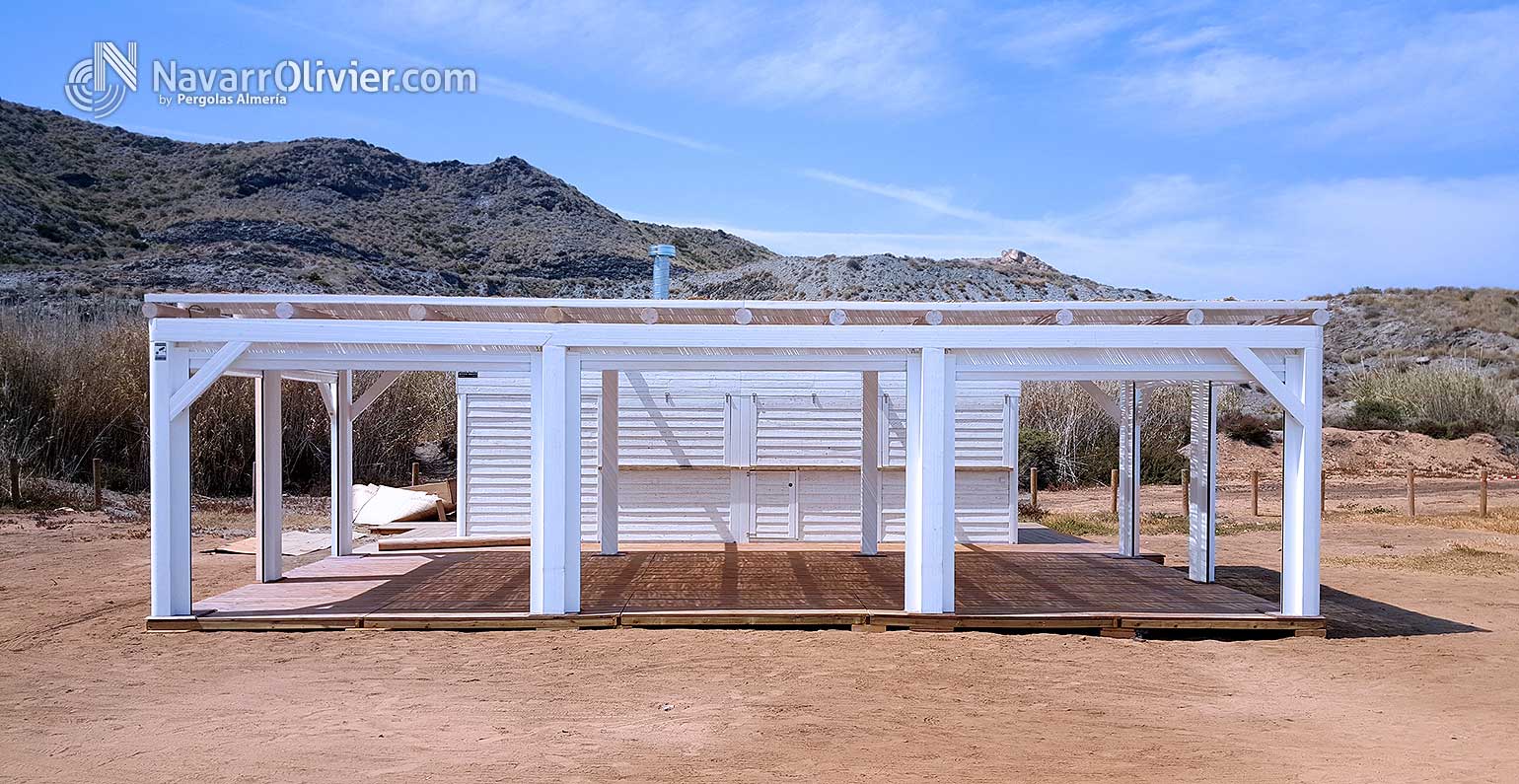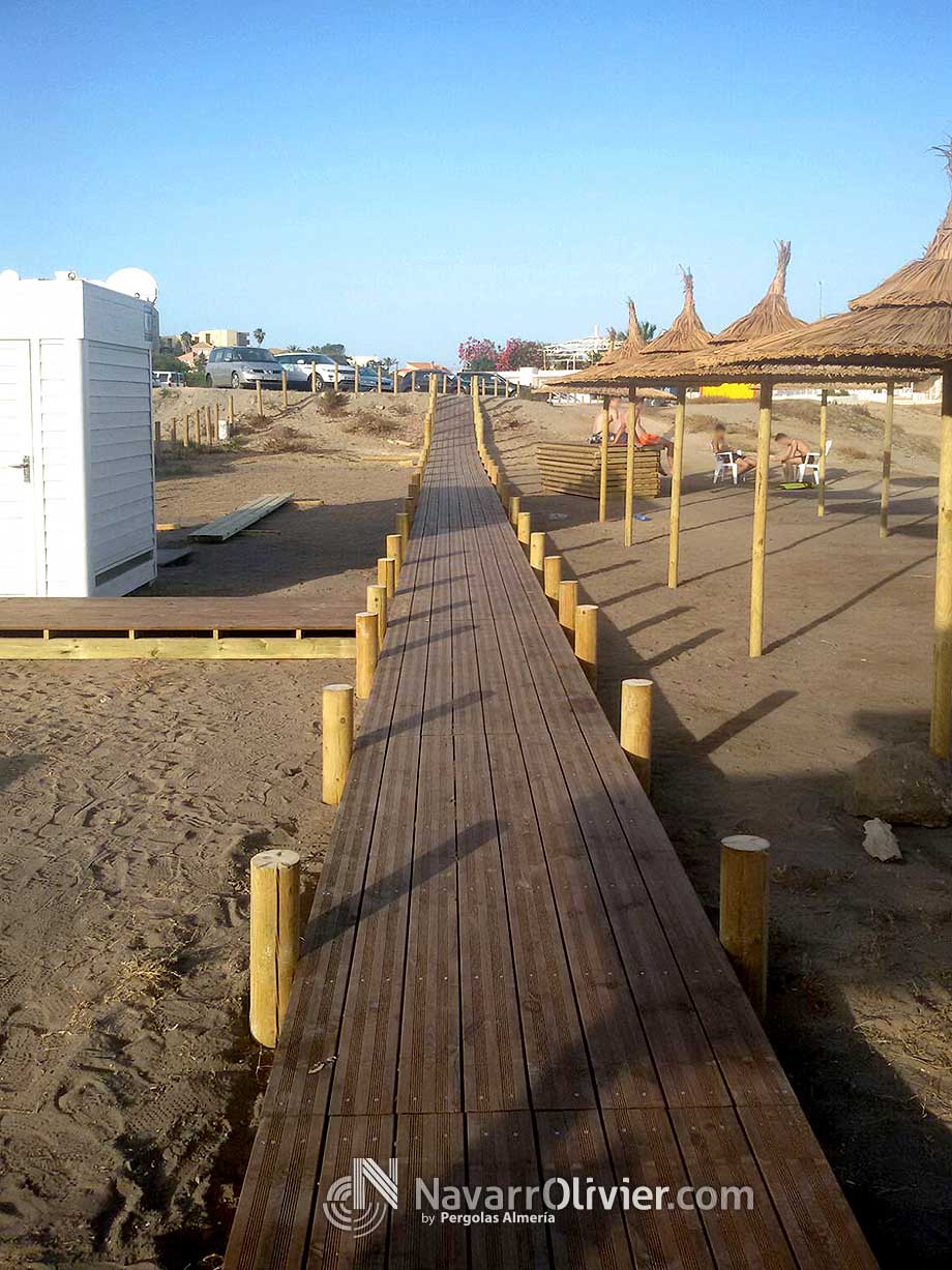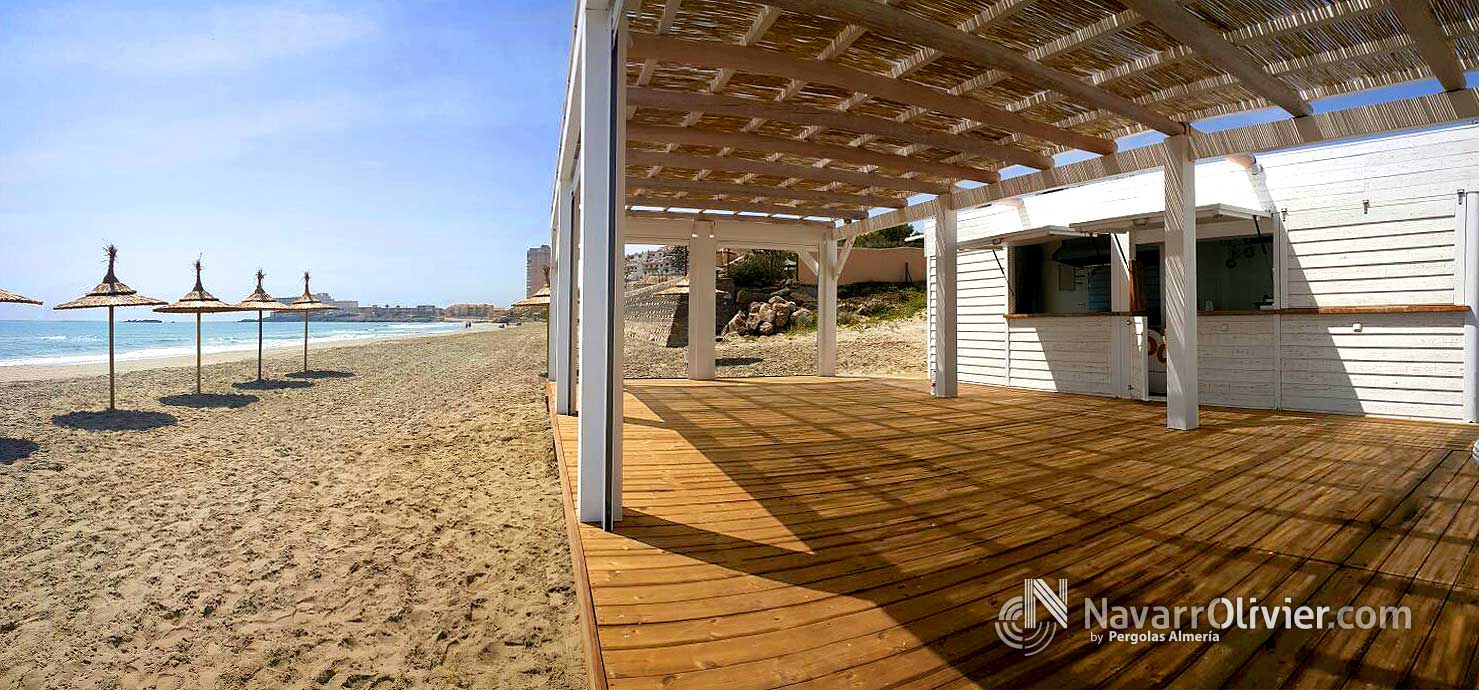 Chiringuito con pérgola de sombraje, tarima anti deslizante ranurada, módulo de aseos accesibles y pasarela pilotada de acceso.