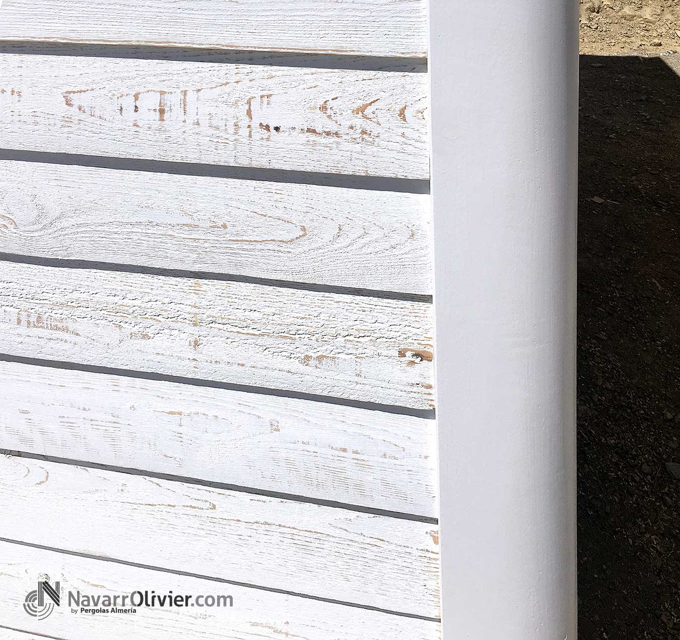 Acabado exterior con pilares redondeados, piel exterior en bardage de madera aserrada solapada con pintura de protección en decape, que le aporta un estilo vintage.