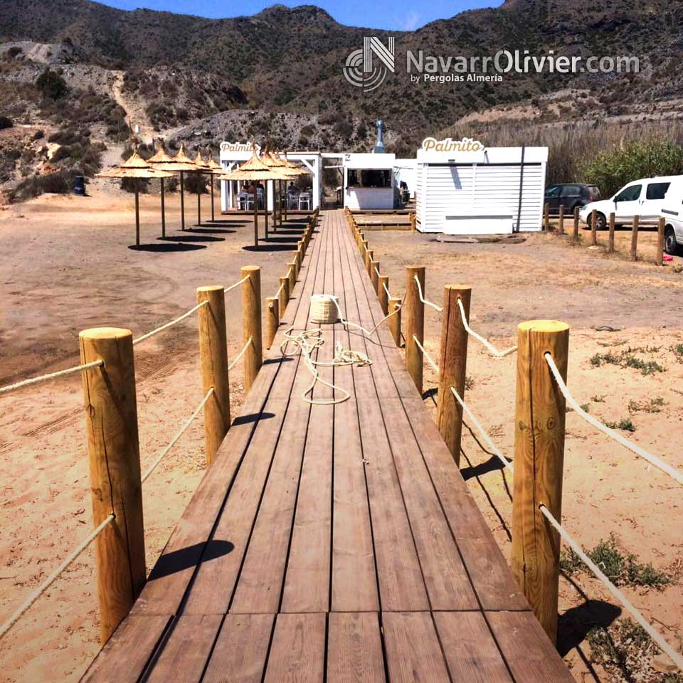 Pasarela de acceso sobre elevada con pilares de palo redondo autoclave encordado con cuerda natural.