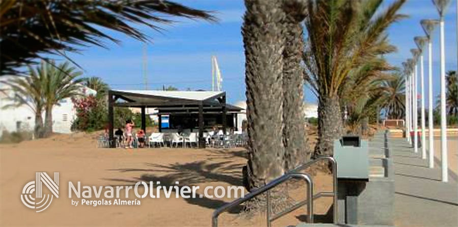 El perímetro de chiringuito y superficie de la terraza cuentan con pavimento en módulos de tarima ranurada anti deslizante tratada en autoclave.