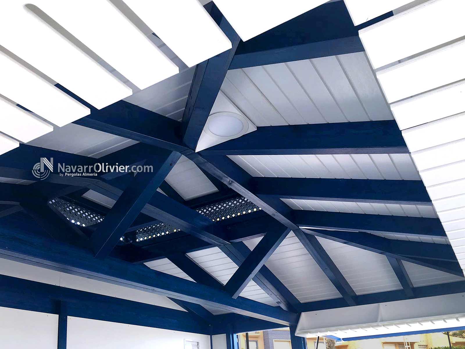 Chiringuito modelo Mojácar, unidad desmontable a tres aguas compuesta por 2 módulos para facilitar el transporte por carretera, coronado por un campanil a cuatro aguas con rejillas de ventilación en acero galvanizado.