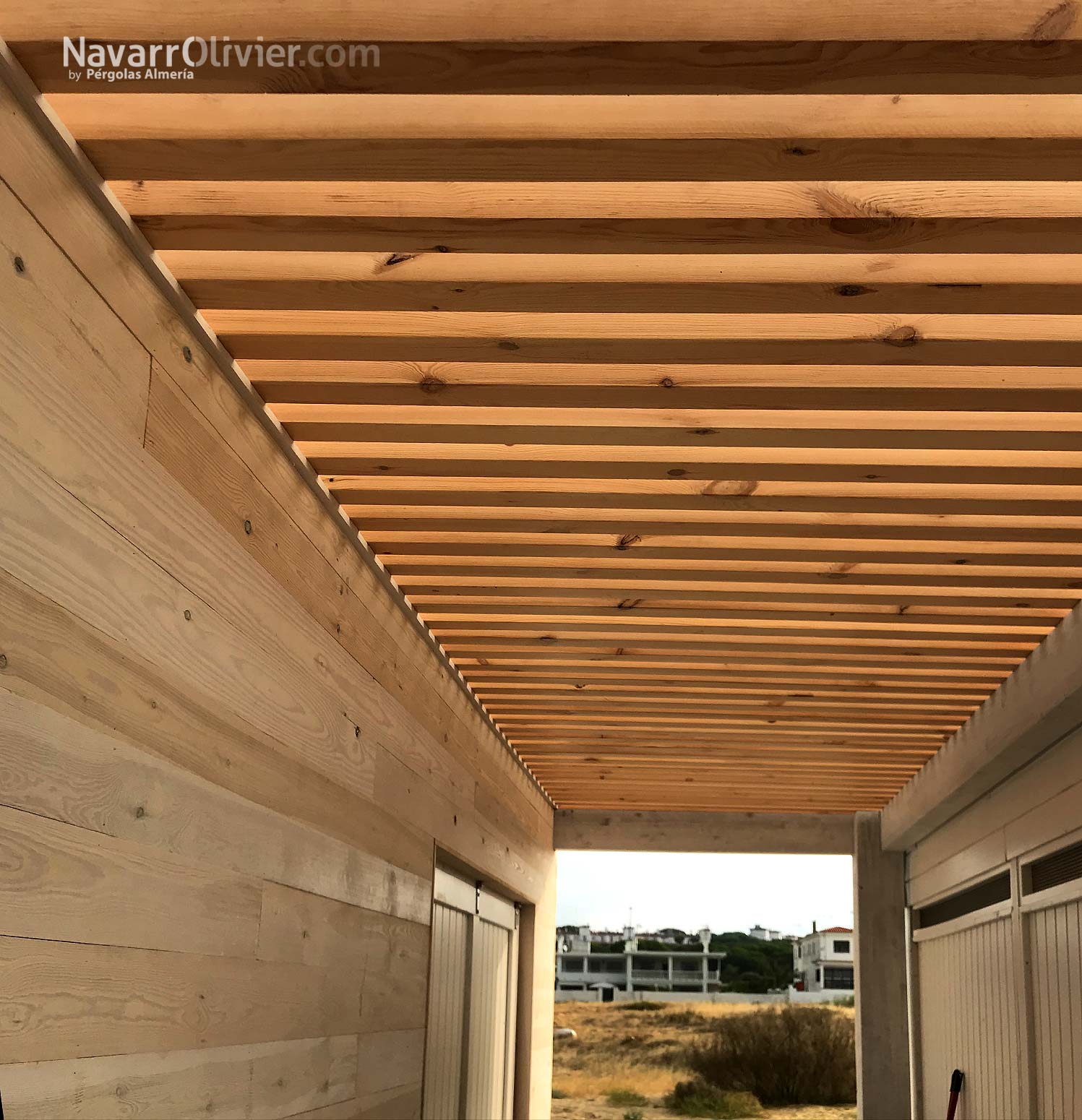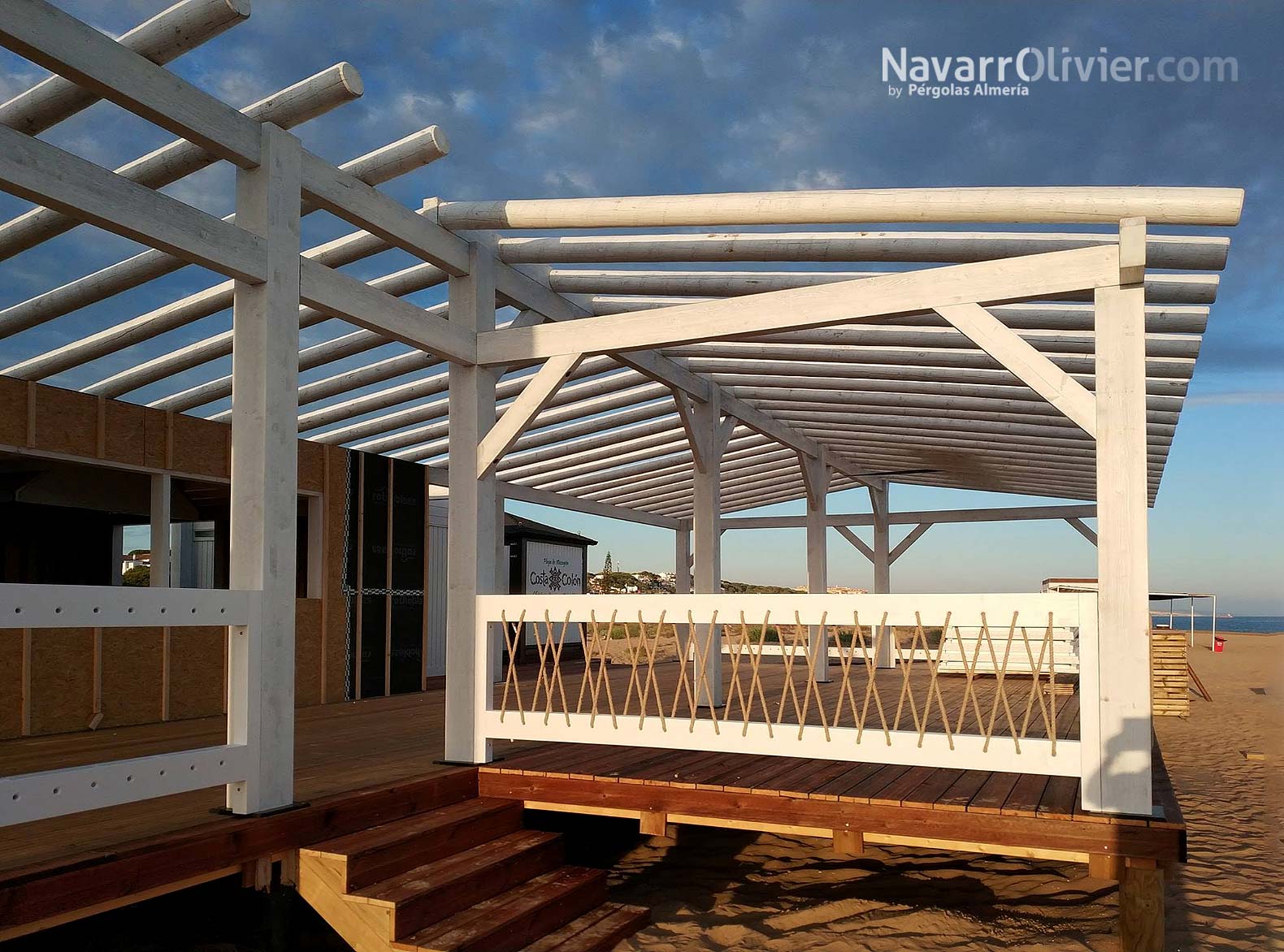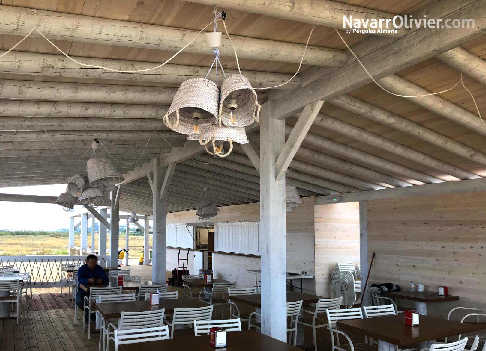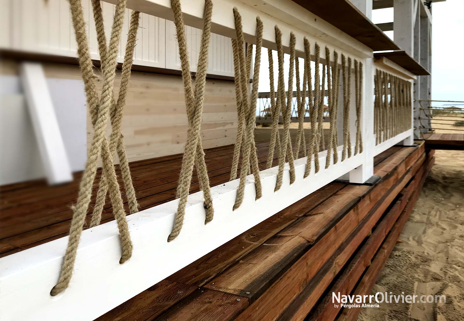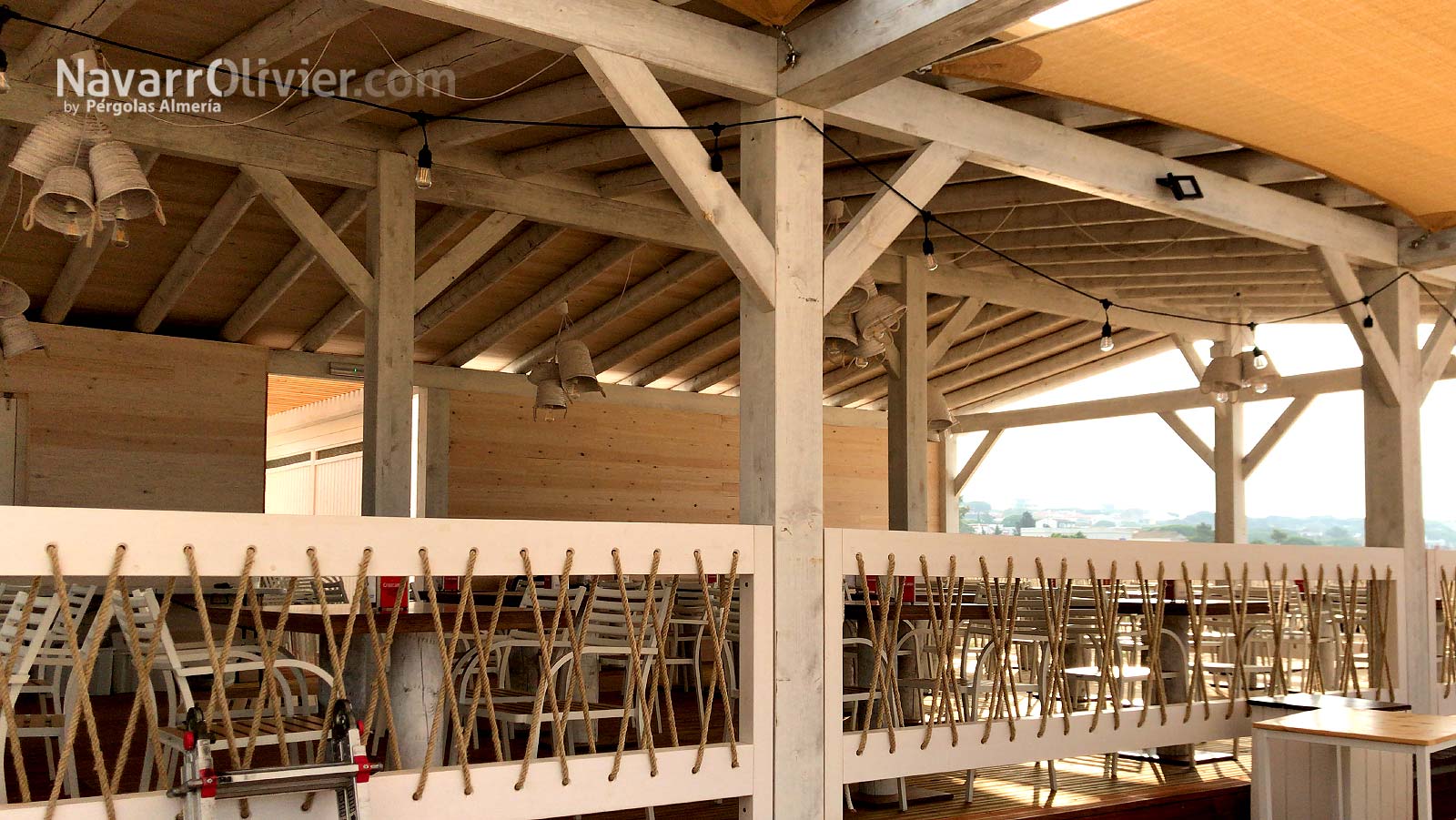 La zona de terraza comedor cuenta con cubierta a 2 aguas con una estructura en madera laminada y tronco calibrado acabados en blanco con pátina vintage y friso en madera aserrada con impermeabilización. La zona de tapeo y transito tienen un sombraje en listones paralelos, el perímetro de la terraza cuenta con una barandilla en madera y cuerda natural.