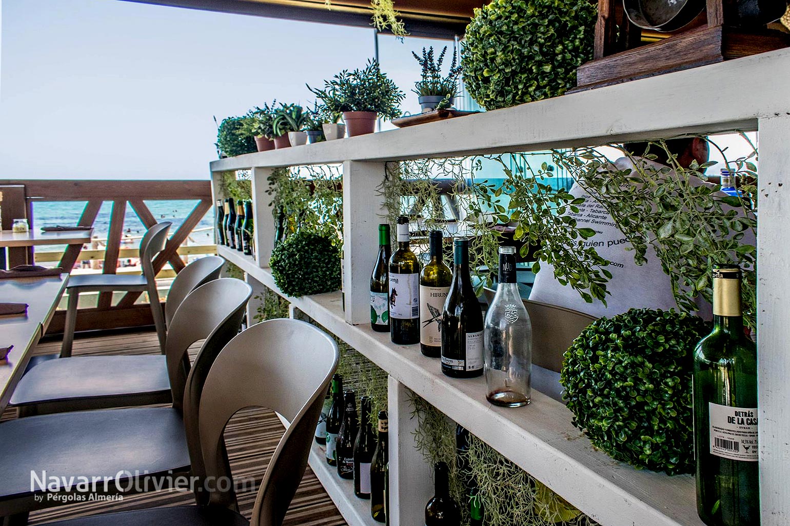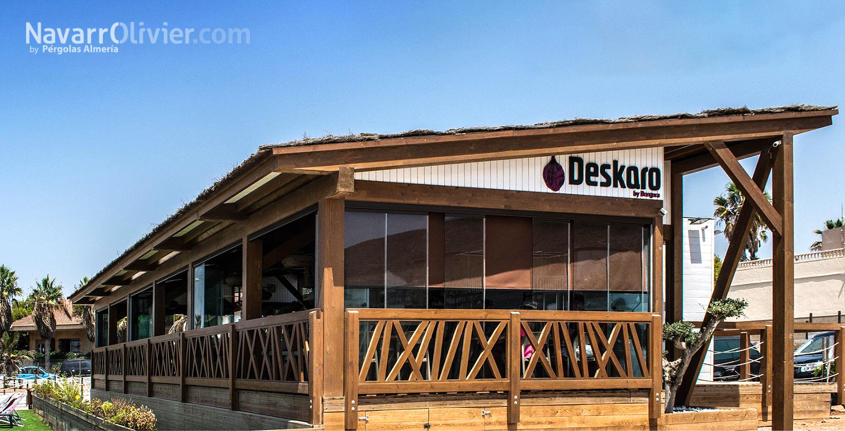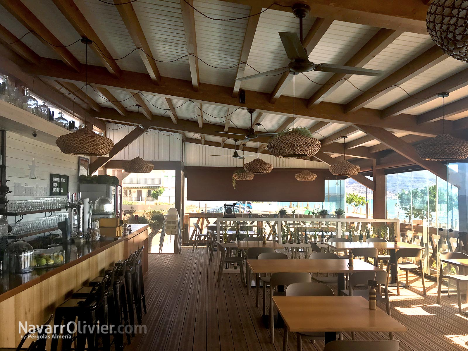 La terraza del restaurante cuenta con una barandilla de diseño en madera tratada, rampas y escaleras de acceso en madera autoclave además de un cerramiento en cortina de cristal.