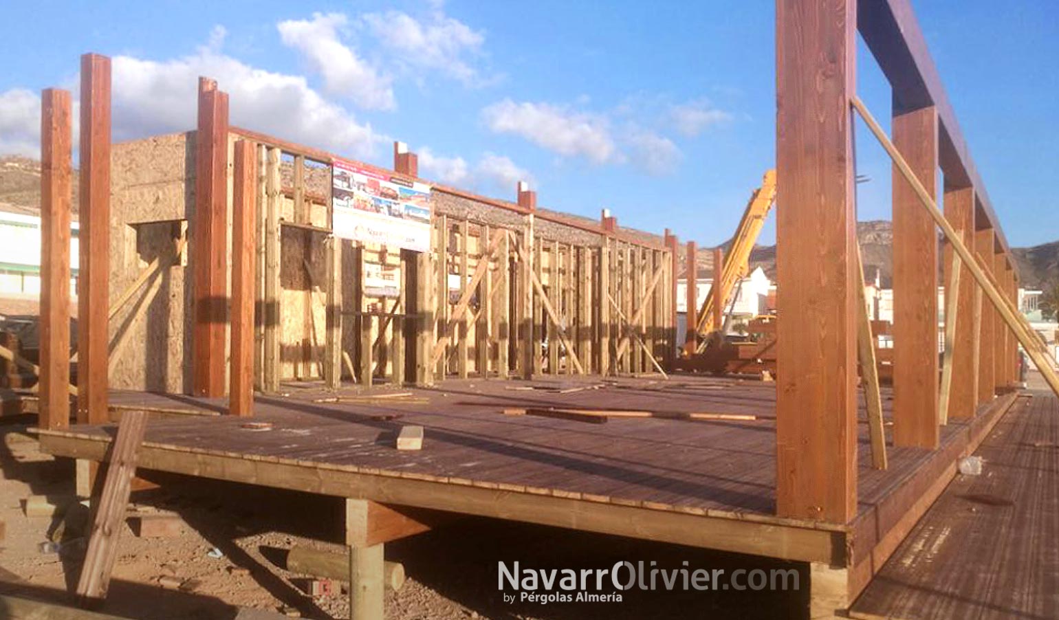 La edificación construida en entramado pesado se asienta sobre la plataforma y consta de una estructura principal fabricada en madera laminada y maciza mecanizada tratada con barniz de poro abierto para su protección.