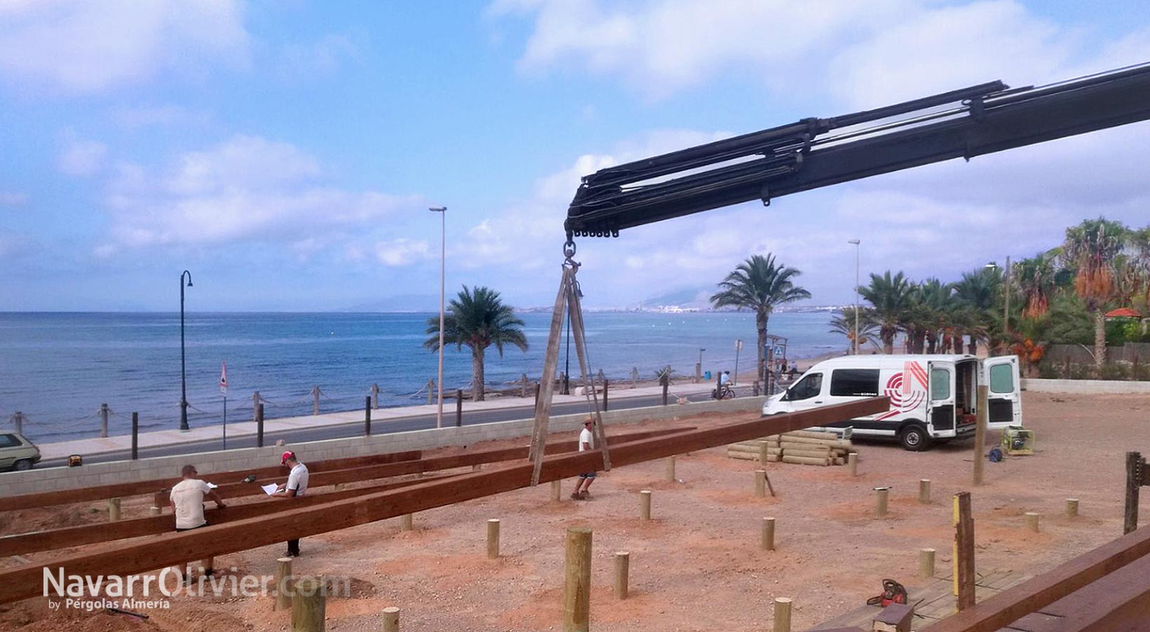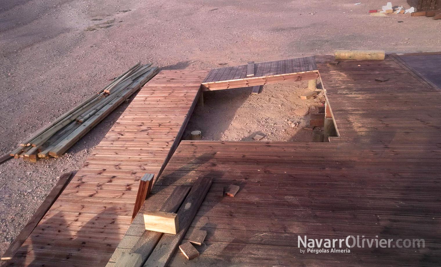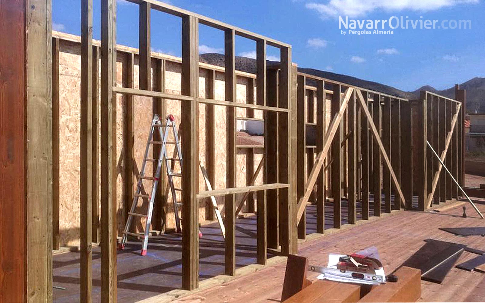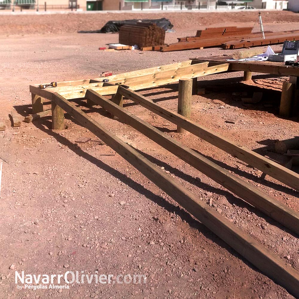 El proyecto de construcción respetuosa con el mediombiente se eleva del suelo en pendiente mediante pilotes de madera, con un entramado de vigas de madera tratada que sirven de forjado generando un vacio sanitario. La superficie de la plataforma cuenta con suelo en tarima tratada en autoclave en la zona de comedor y pavimento en tablero de carrocería en la zona de cocina, barra, almacén y aseos.