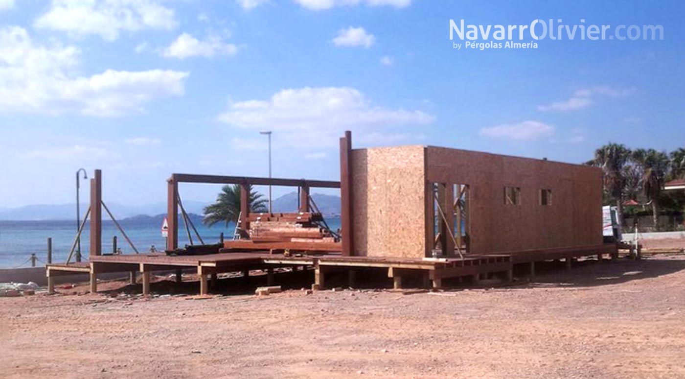 La cubierta construida en tablero marino impermeabilizado con pendiente a un agua esta rematada en brezo natural decorativo. Los muros del chiringuito fabricados con entramado de madera tienen un revestimiento interior en tablero hidrófugo con melamina sanitaria, en el exterior tablero estructural osb con acabado exterior en madera aserrada en blanco decapé.
