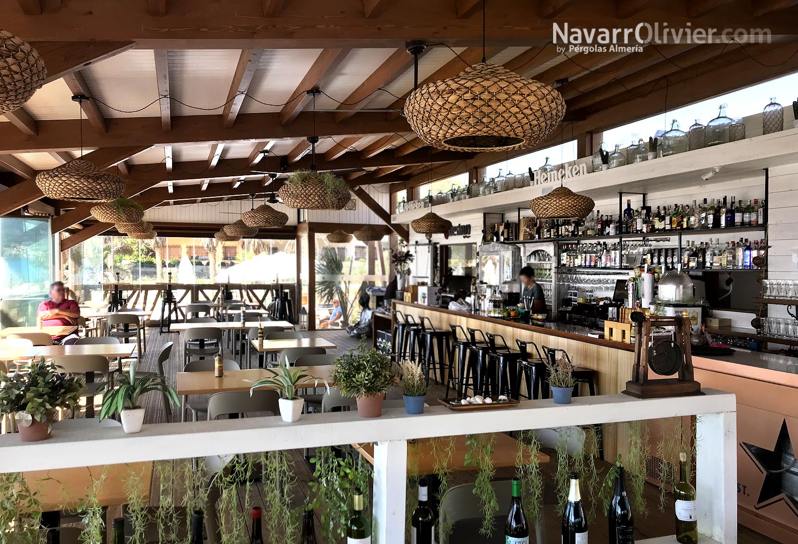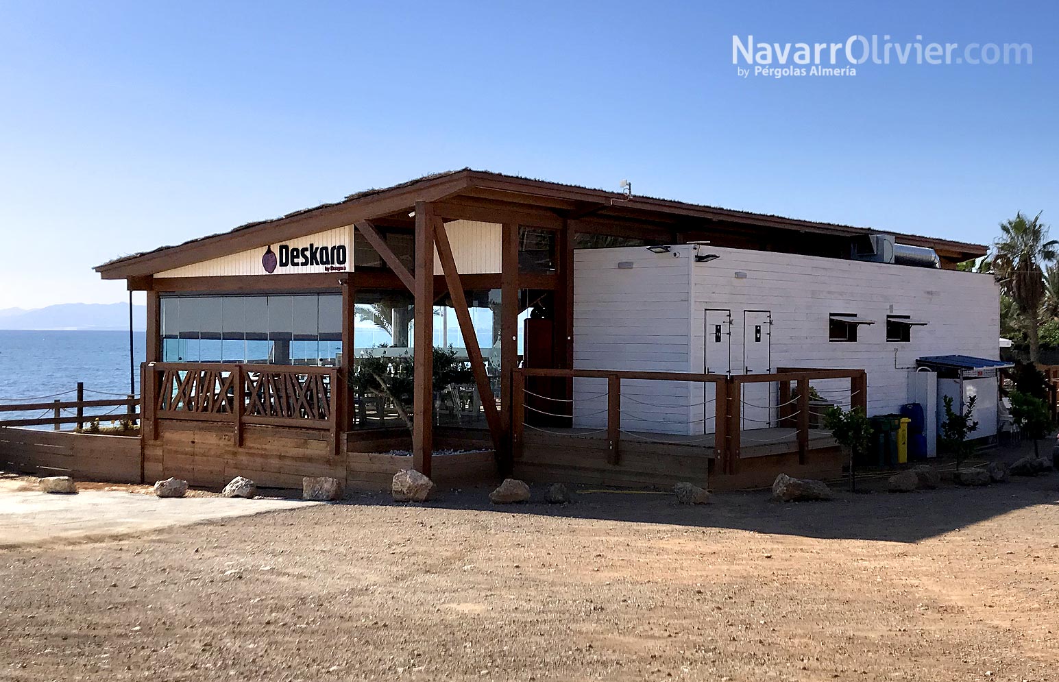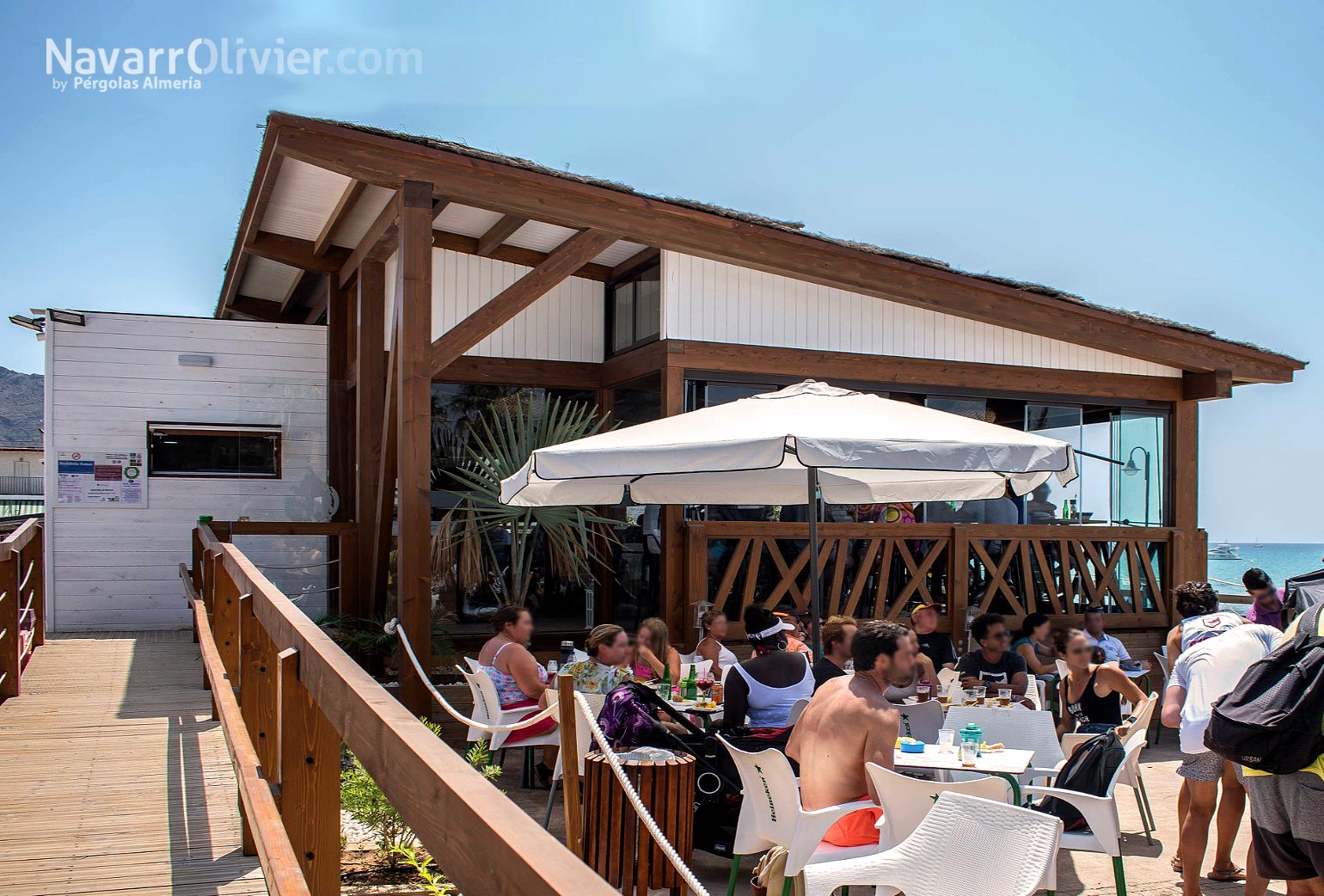 La construcción realizada en madera para exterior sobre pilotes cilíndricos de pino tratado en autoclave destaca por diseño y decoración que lo convierten en lugar único para disfrutar de su oferta de ocio y gastronomía.