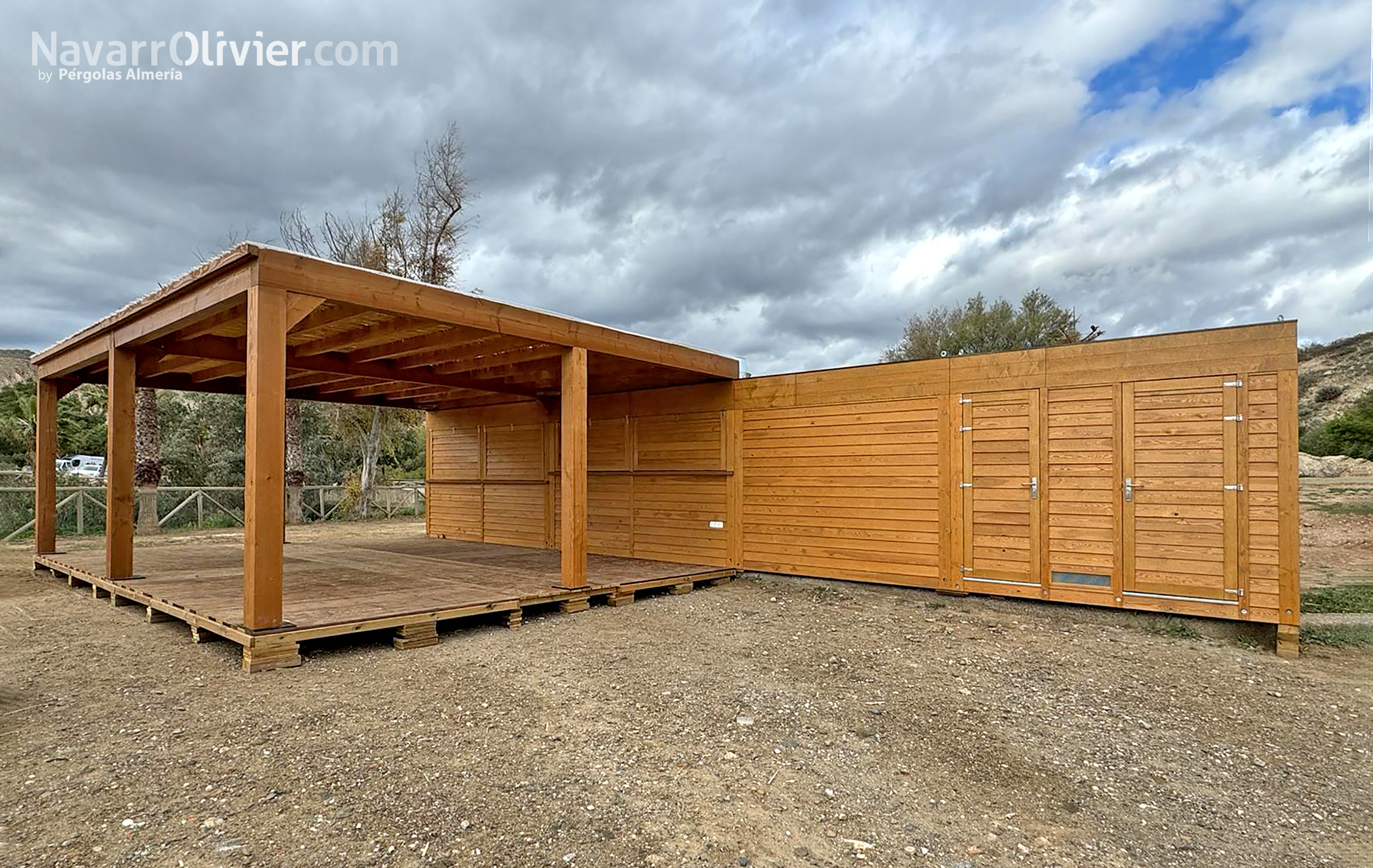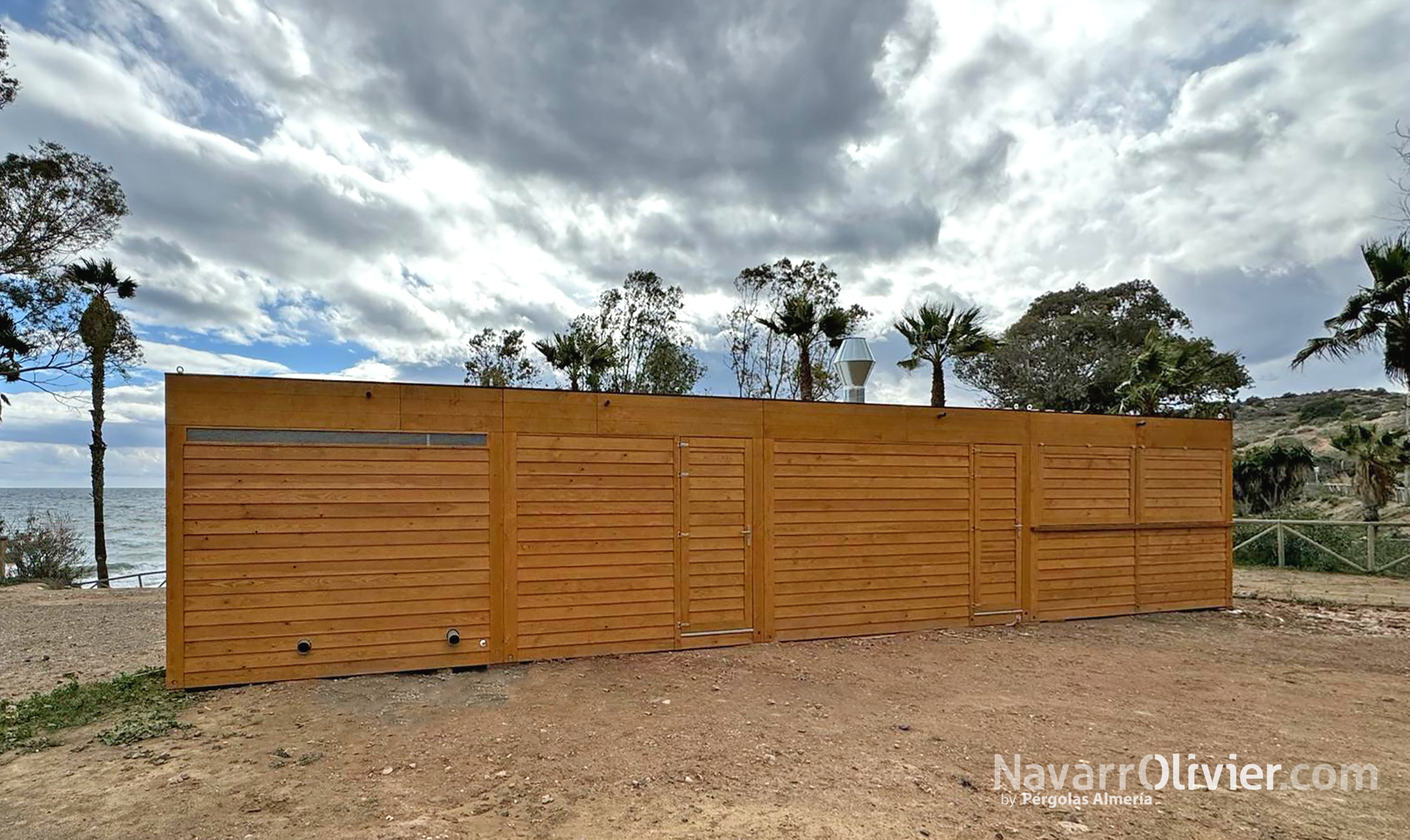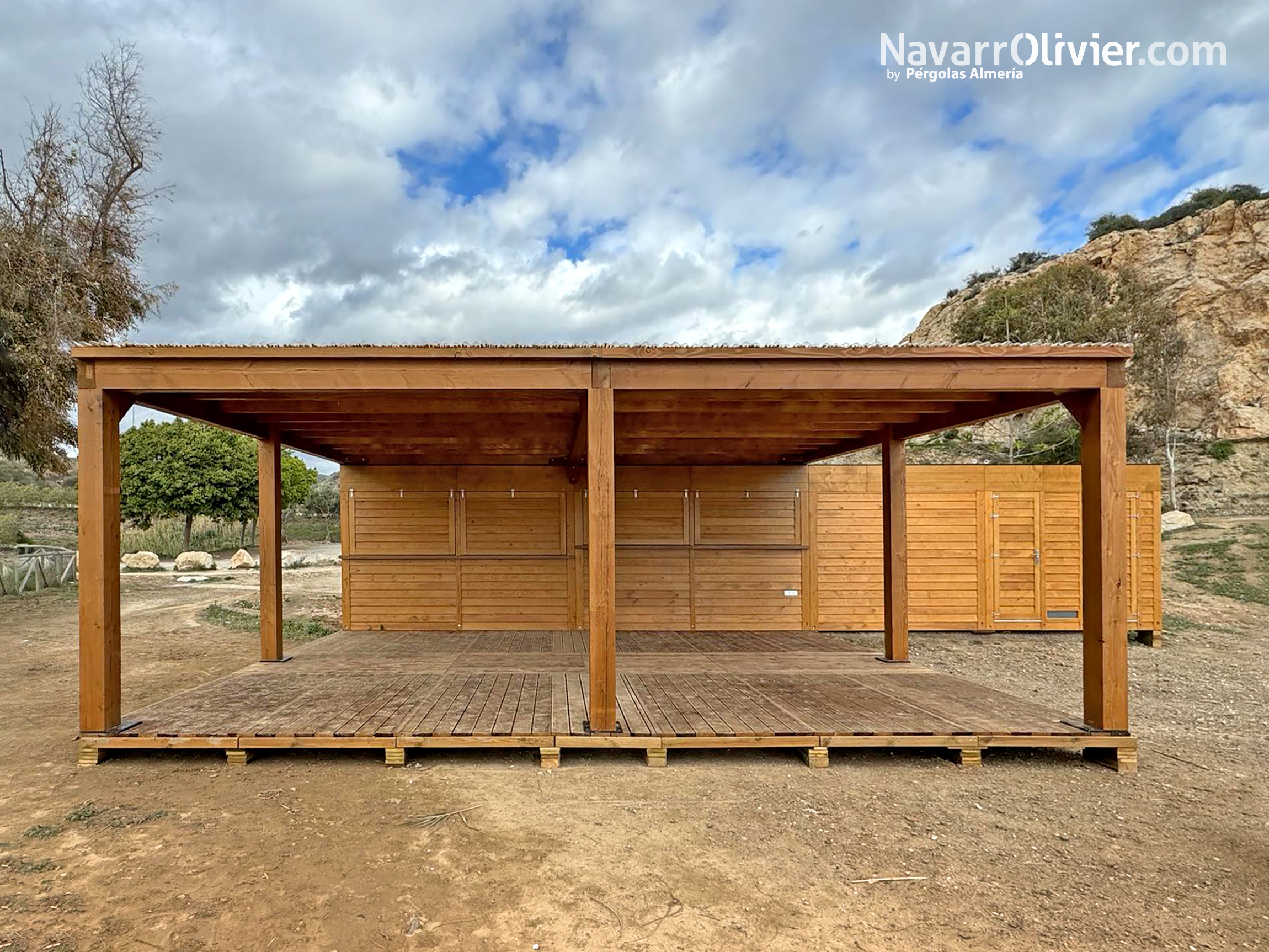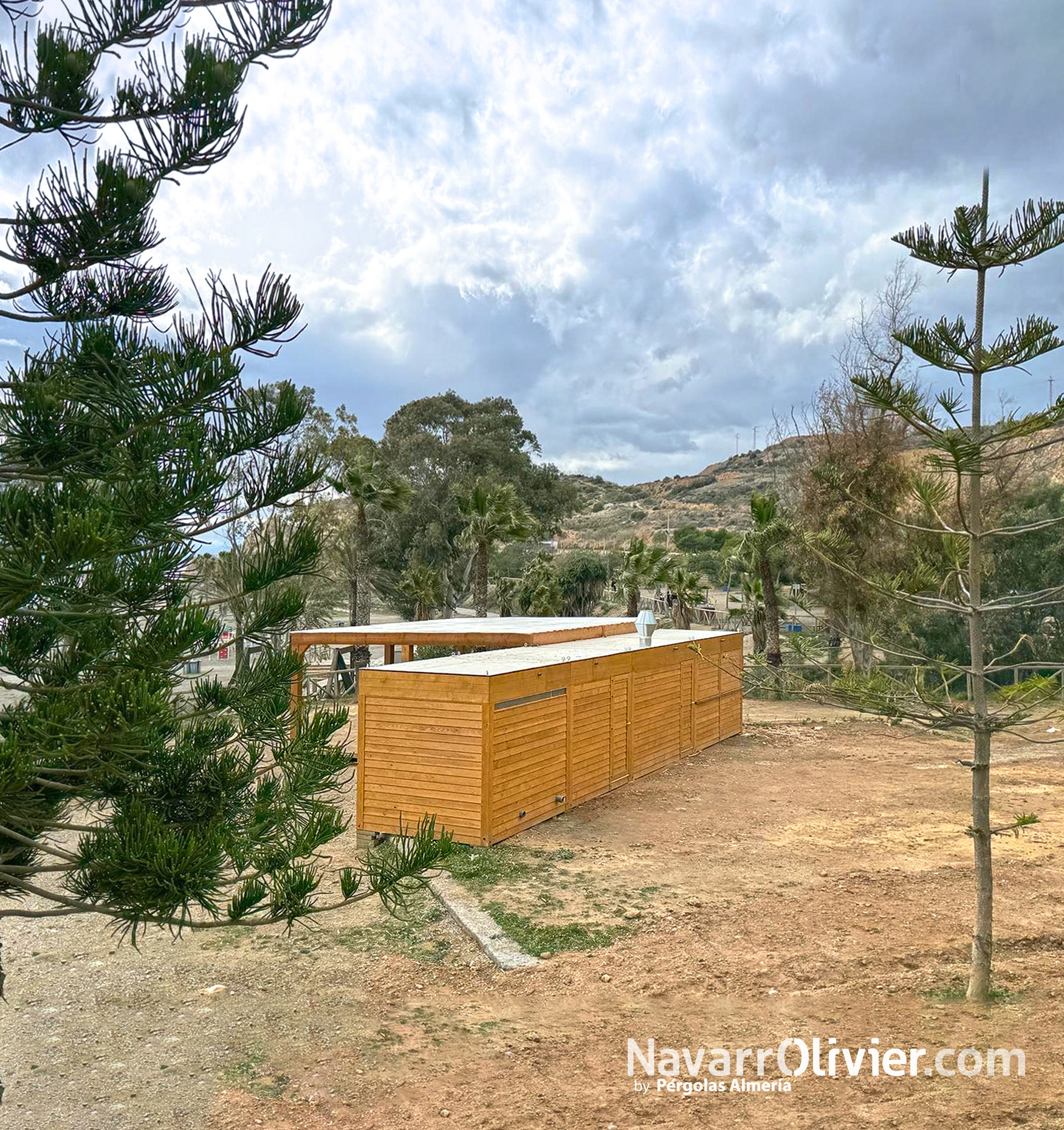 La terraza del chiringuito cuenta con tarima autoclave y pérgola de sombraje que protege a los clientes del sol y la lluvia.
