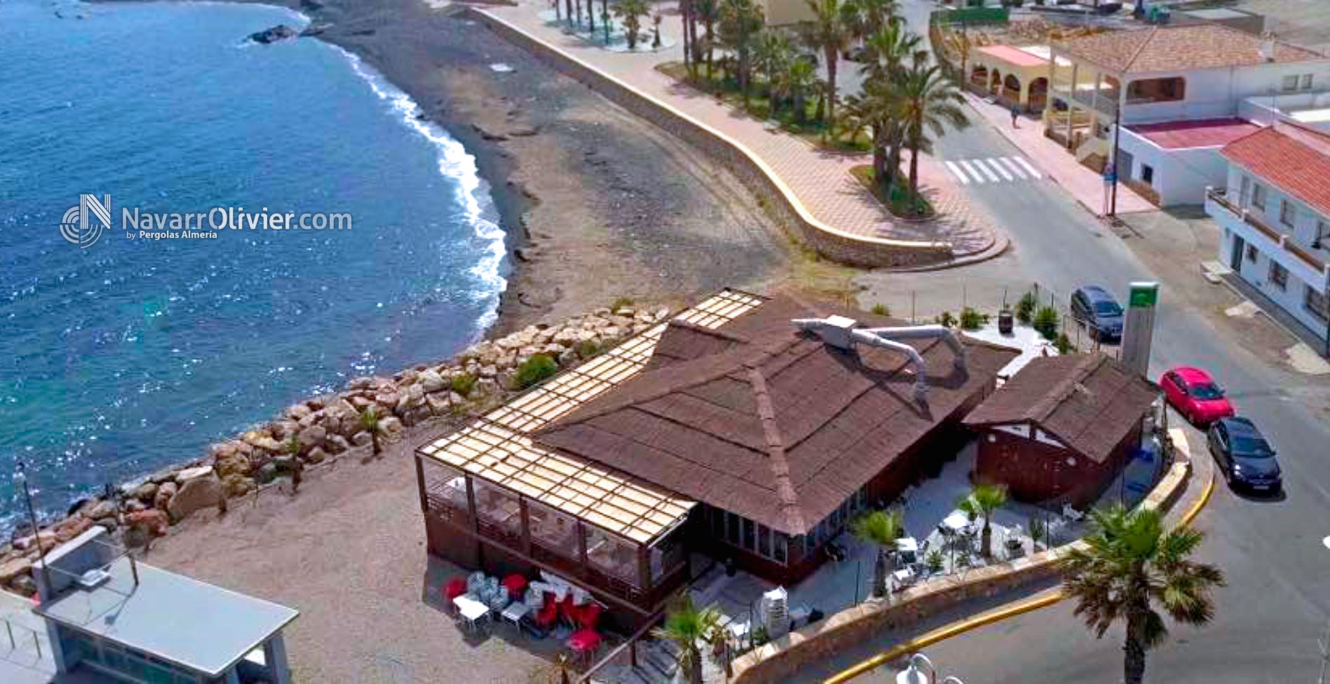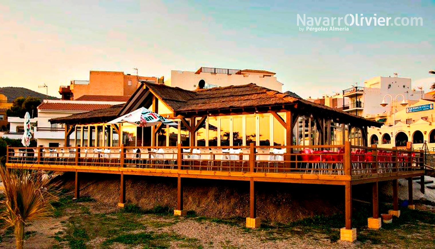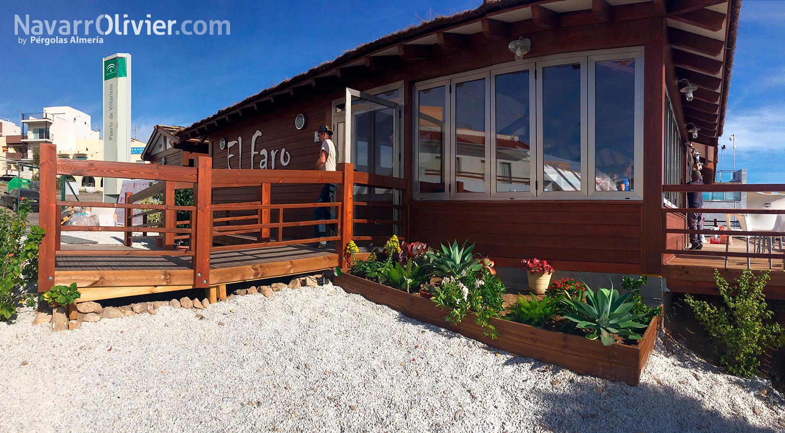 El restaurante construido en madera para exterior abre sus puertas durante todo el año en un excelente punto panorámico junto a la bocana del puerto de Villaricos, Almería.