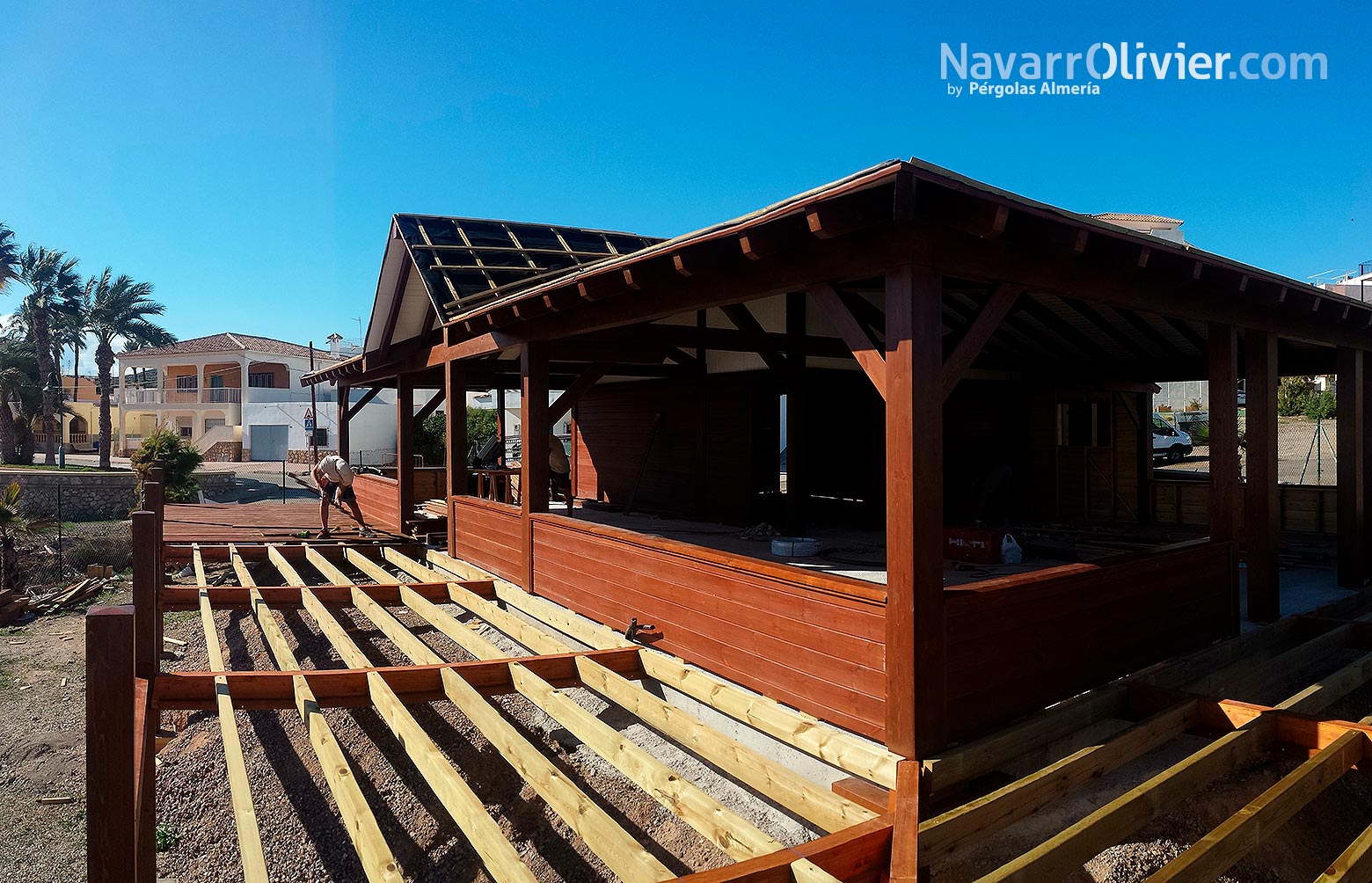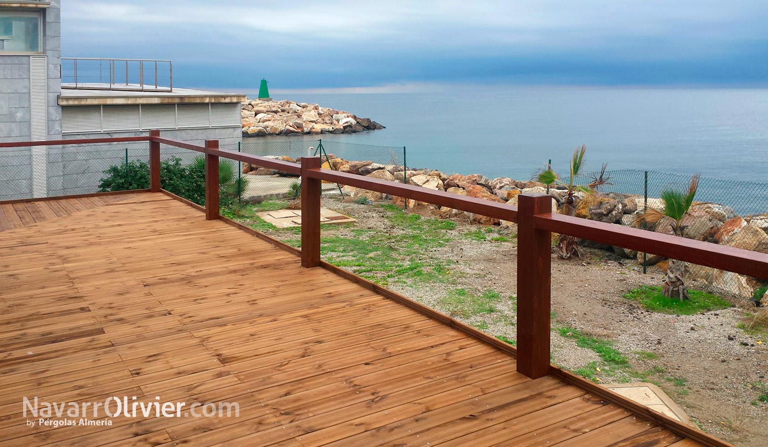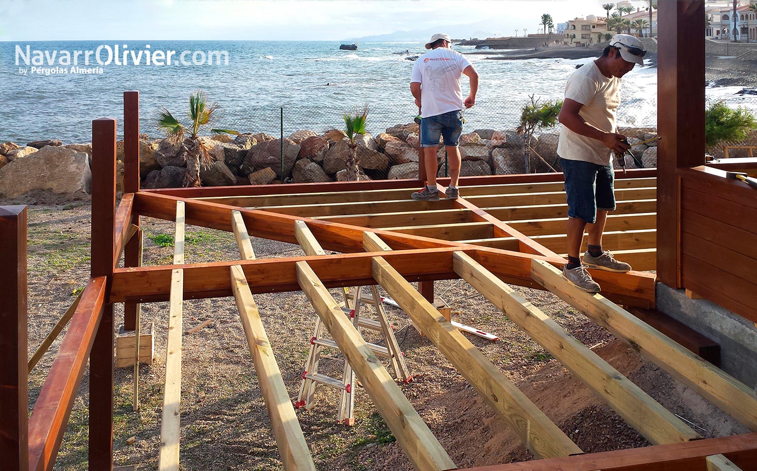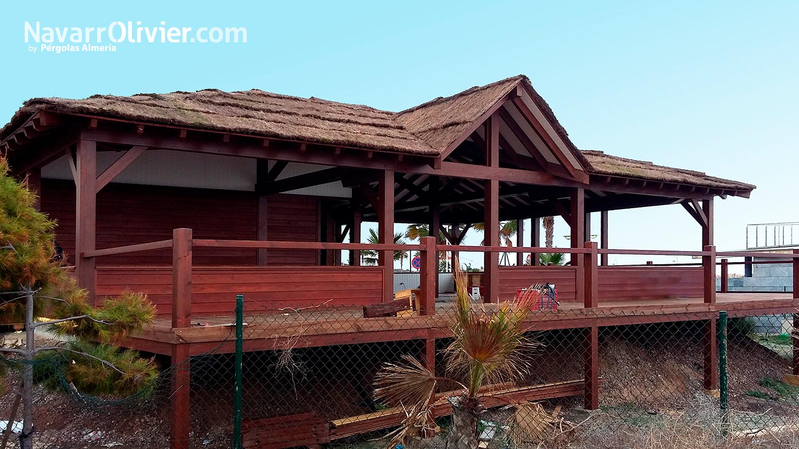 El chiringuito cuenta ademas con una terraza exterior elevada sobre pilares de madera que sortean el desnivel del terreno, su construcción cuenta con un entramado de vigas de madera tratada con pavimento en tarima ranurada en autoclave clase IV.