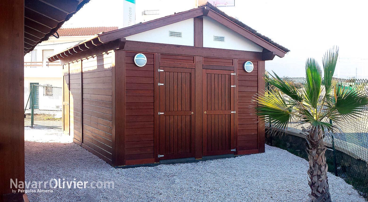 La edificación cuenta con zona de cocina, barra y un amplio comedor con cerramiento en cristal ademas de la terraza exterior y una construcción a 2 aguas con un sistema constructivo similar destinada a los aseos accesibles y almacén.