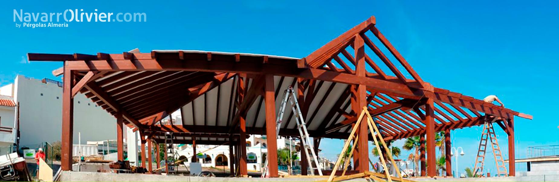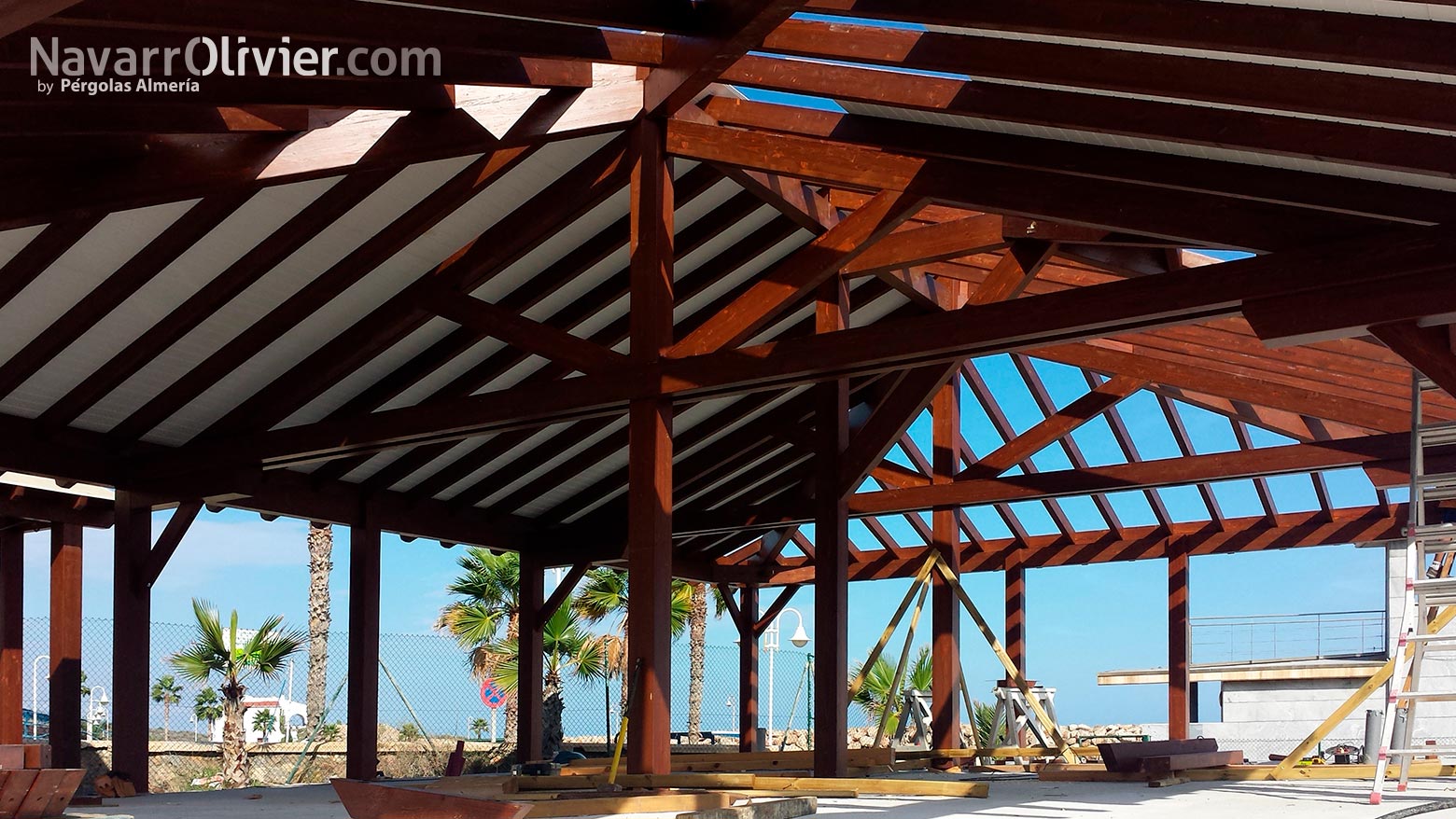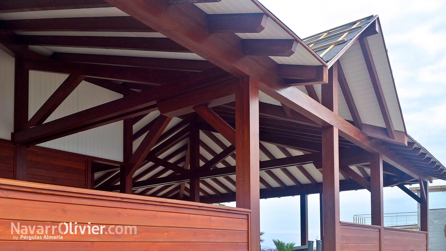 La estructura cuenta con una cubierta poligonal en madera laminada y maciza con friso en tablero fenólico acabado en blanco que mejora la luminosidad interior y pone en valor la estética de de la carpintería interior. El exterior de la misma cuenta con un recubrimiento en brezo natural.