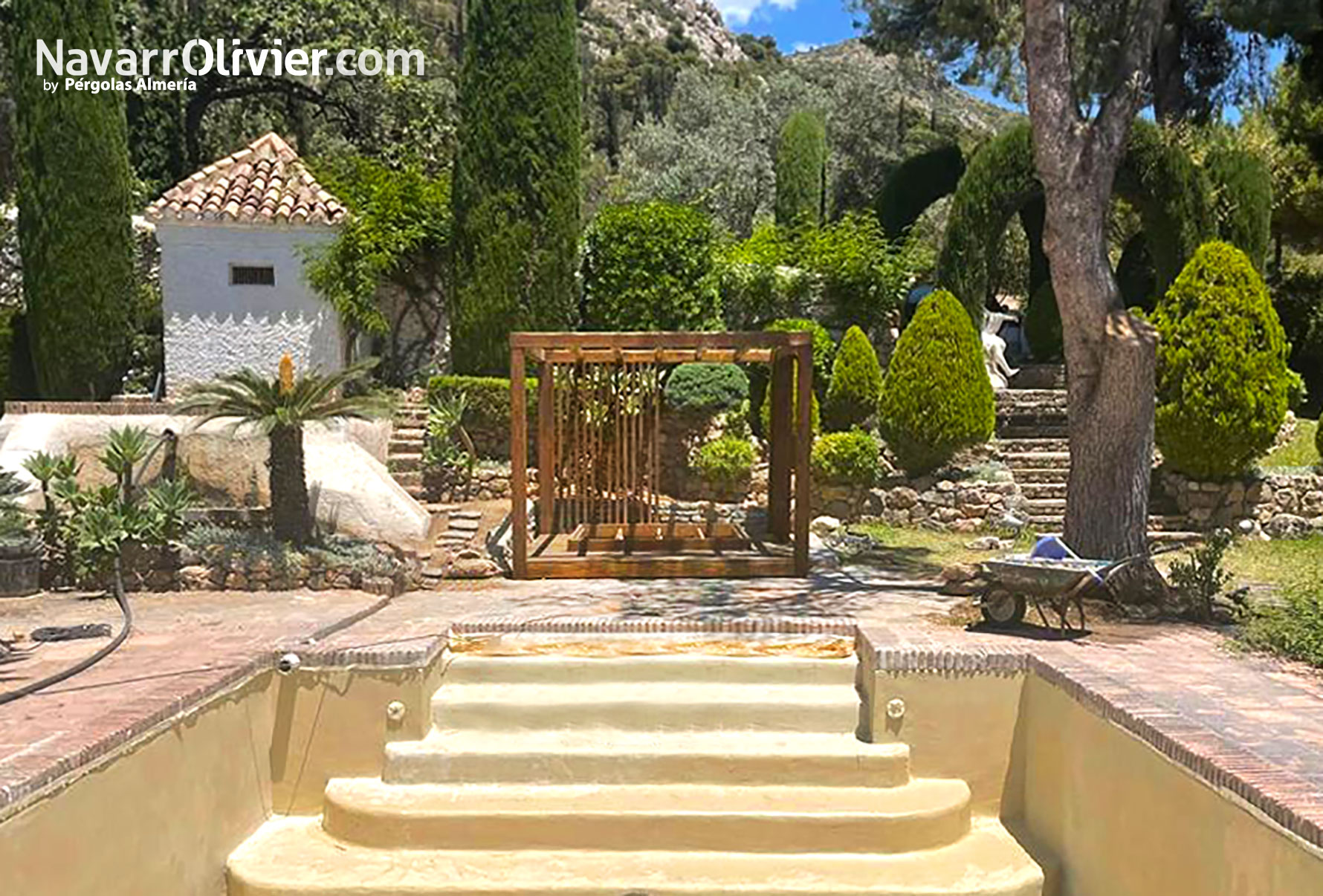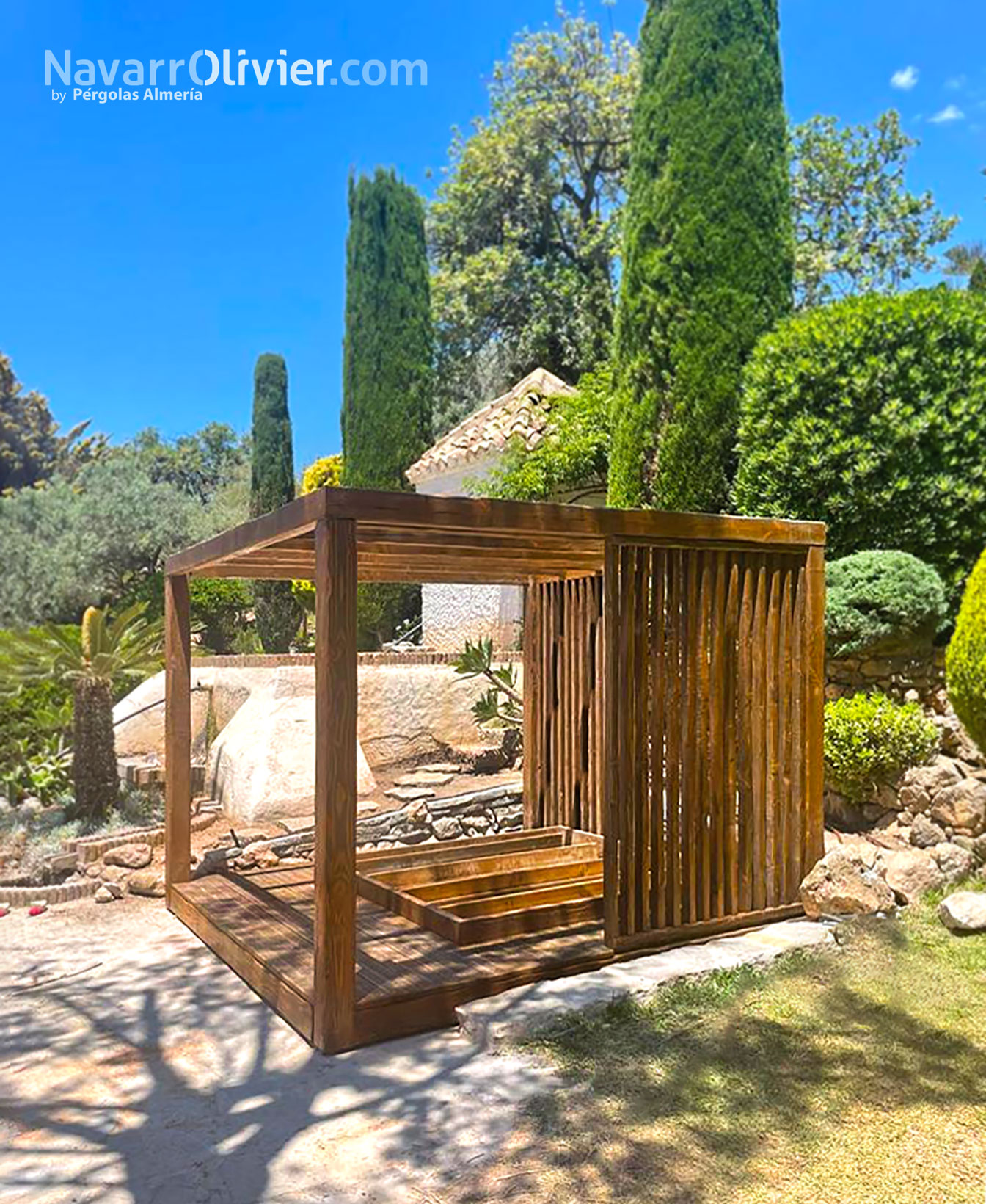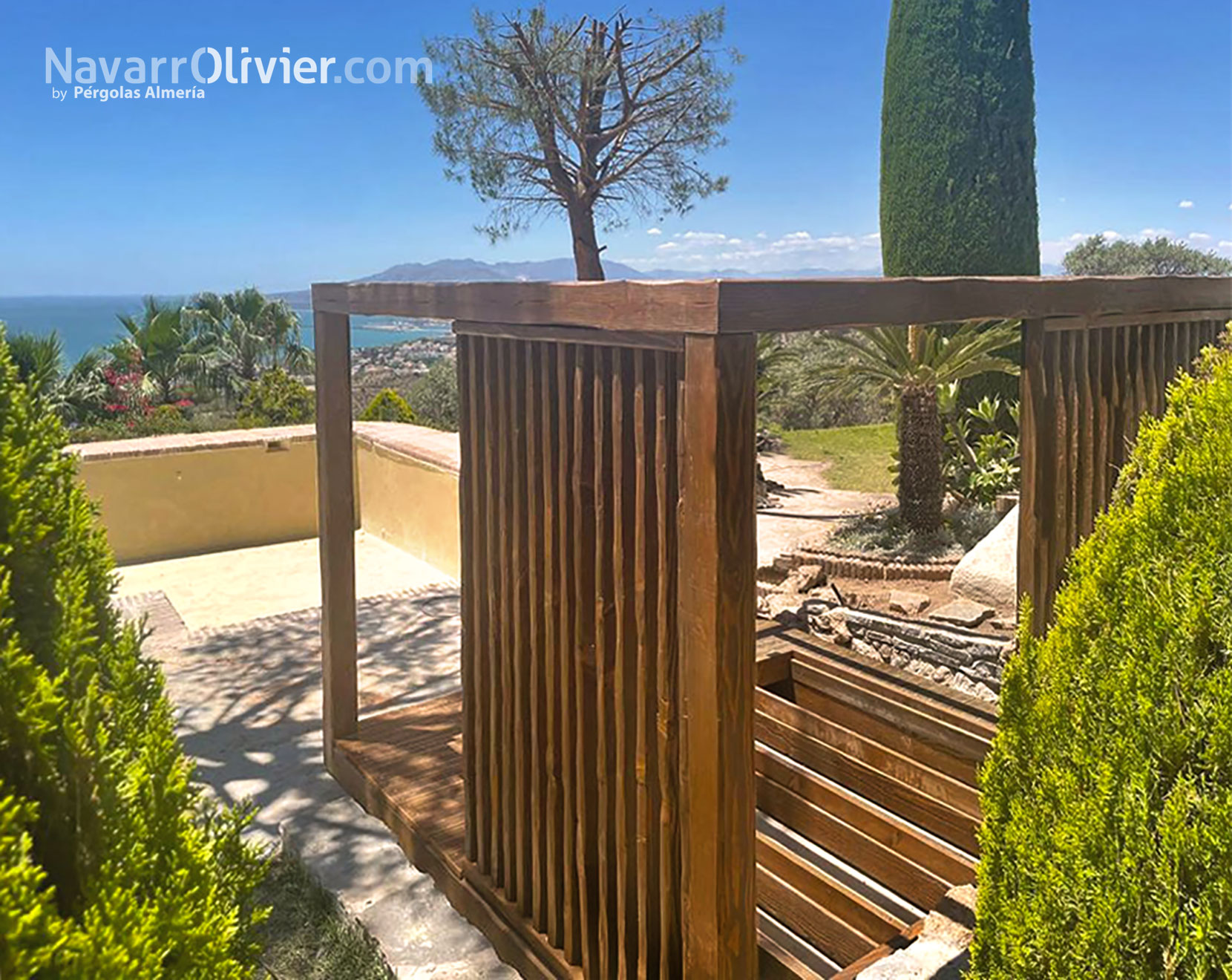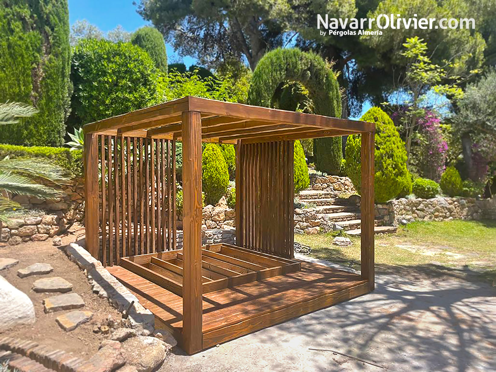 La estructura de sombraje está compuesta por cuatro pilares principales de madera maciza de acabado rústico con dos zonas de vigas verticales paralelas que filtran aportan privacidad y estética.
