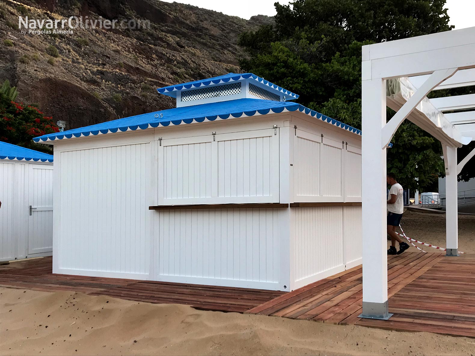 El conjunto de hostelería cuenta con un chiringuito de 20 m2 configurado con cocina y Barra. El chiringuito construido en madera para exterior acabado en blanco con cubierta a 4 aguas y lucernario superior cuenta además con instalación eléctrica oculta en la cámara de aire de sus muros y está preparado para hostelería.