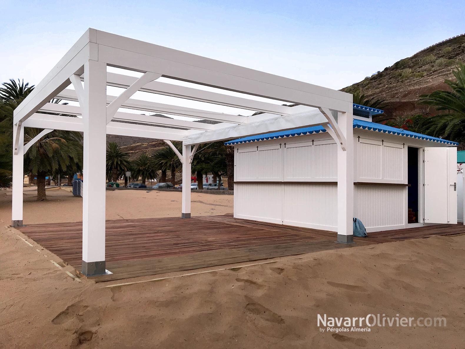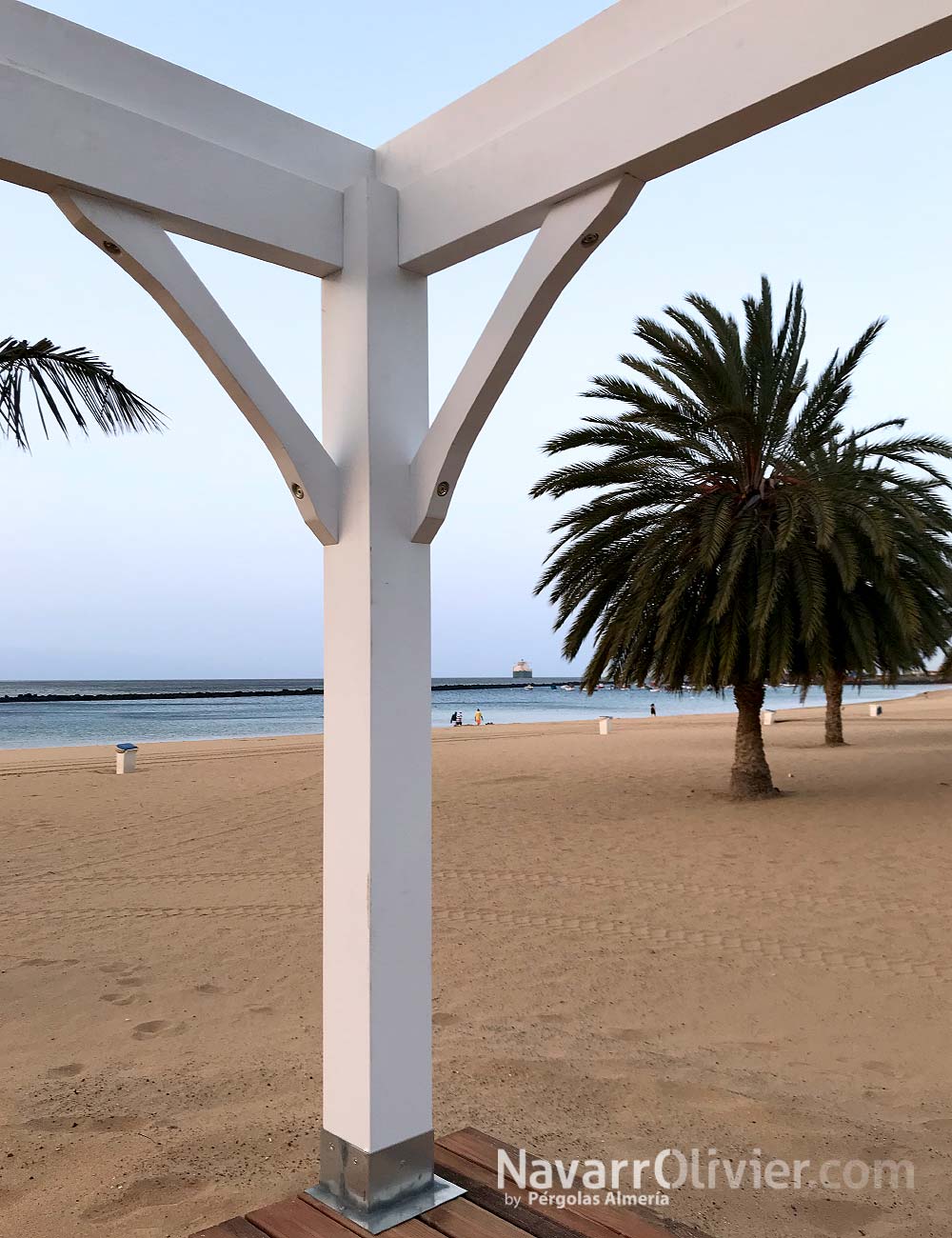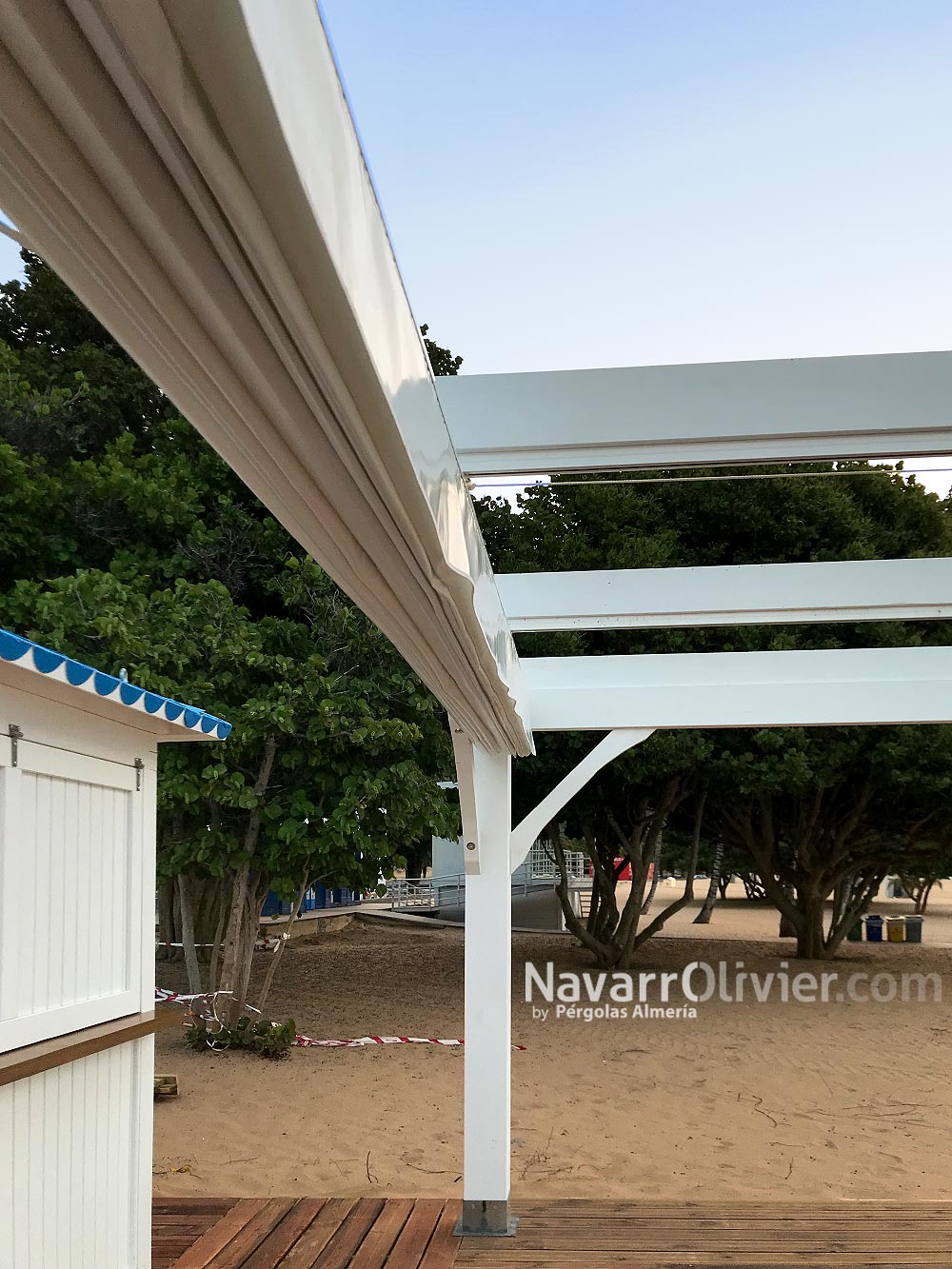 La pérgola fabricad en madera laminada acabada en blanco cuenta con toldo de palillería y está fijada a la terraza mediante anclajes en acero inox 316.