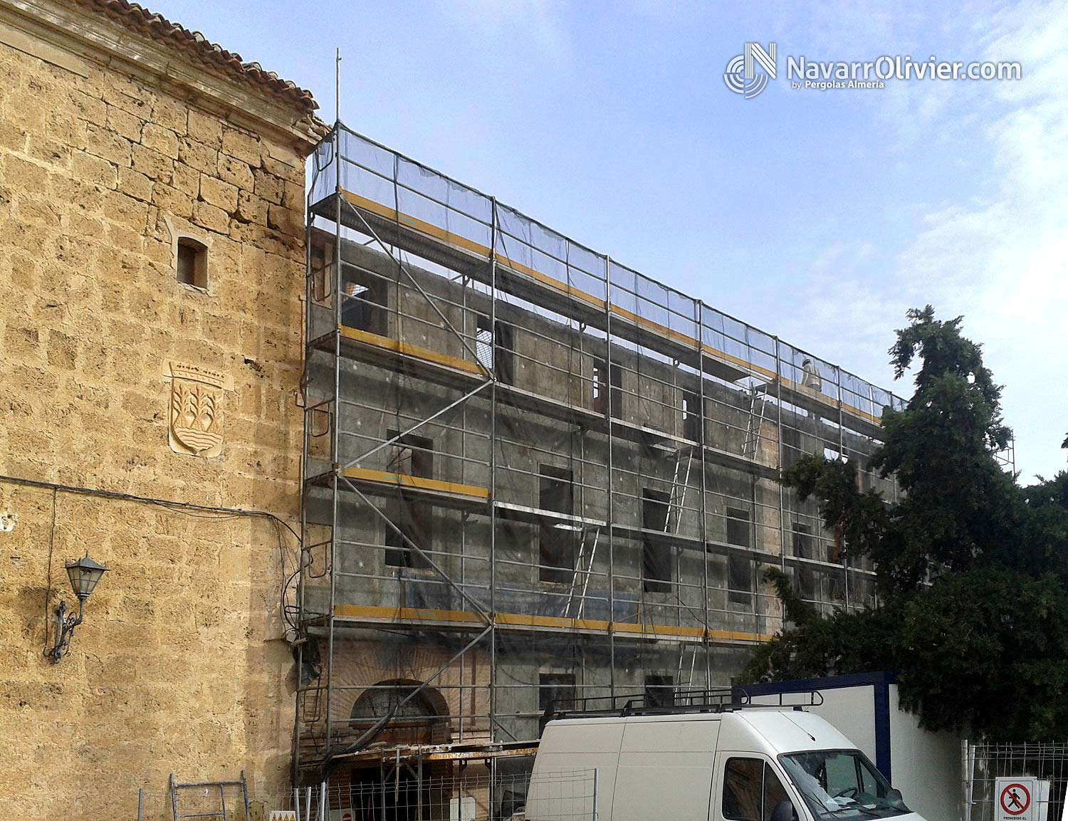 En el año 2012 nuestra empresa en colaboración con la constructora albaida comenzaron la rehabilitaciín y restauración de la construcción. Tras la consolidación de muros se acometio el montaje de la estructura principal de la cubierta la misma se hacienta ahora sobre un zuncho reforzado de hormigon en el cual se instalarón los estrivos de acero que soportan las vigas de gran sección, el friso se realizo en panel sandwich con machihembrado visto desde el exterior, acabado exterior en teja árabe envejecida para integrarse con las cubiertas existentes.