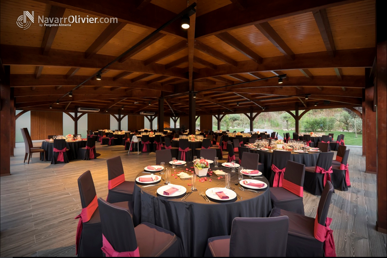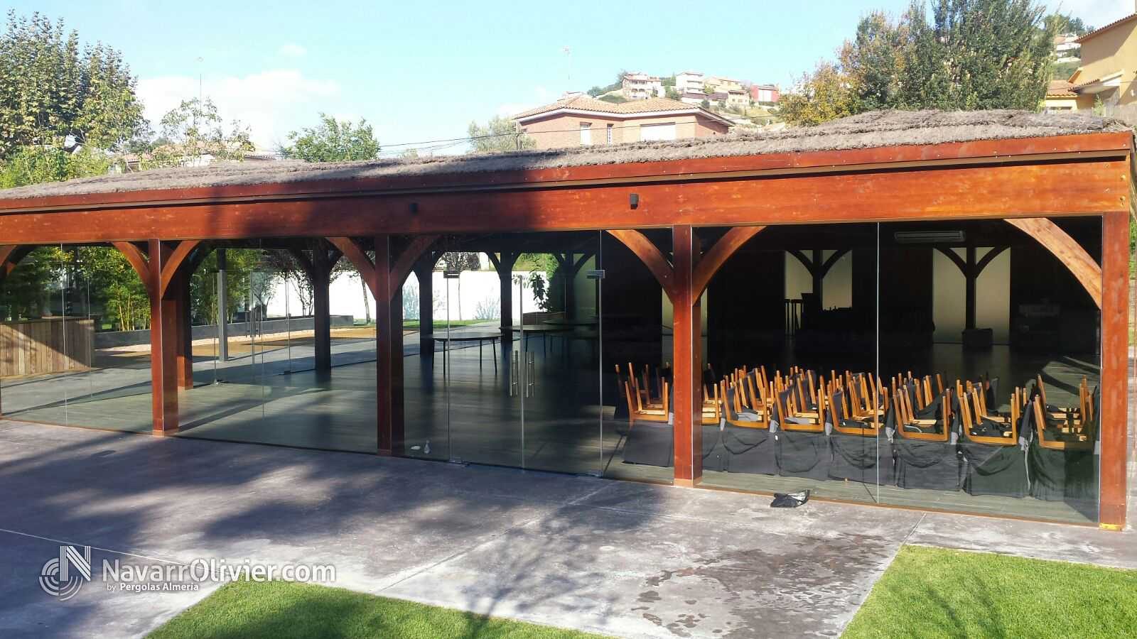 Construcción en madera estructural de cubierta de grandes luces en vigas de madera laminada curva. Estructura en madera estructural laminada con cubierta tipo cúpula con pilares centrales de apoyo en ipn. Dado el uso de la construcción como salón de celebraciones y eventos se requería un gran espacio diáfano que permita diferentes decoraciones y configuraciones así también como una eficiente aislación térmica y acústica para lo cual se opto por panel sandwich compuesto de friso de madera machihembrada vista, núcleo de poliuretano de 120 mm y estructura exterior en tablero hidrófugo impermeabilizado con tela asfáltica sellada por calor acabado exterior en brezo decorativo. Para el cerramiento perimetral se opto por cortina de cristal que permite continuidad con el jardín en caso de que la celebración se realiza en la temporada estival. Masía Mas Llombart es un excelente ejemplo de eficiencia y funcionalidad aplicado a la construcción de estructuras en madera estructural.