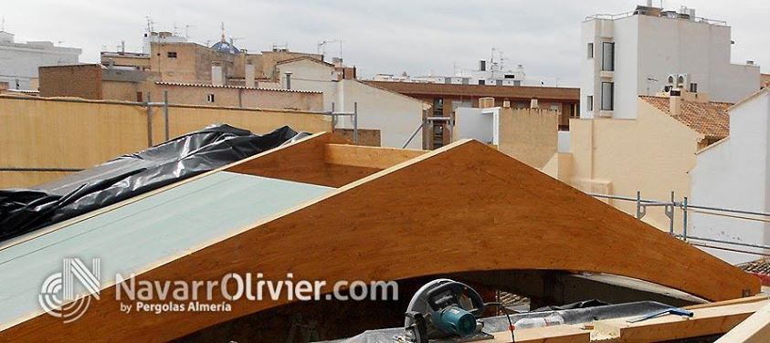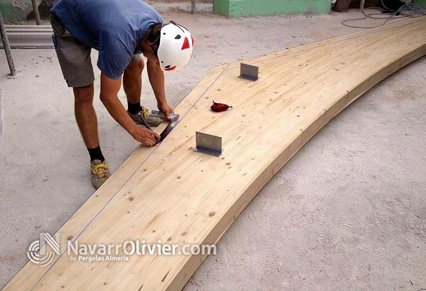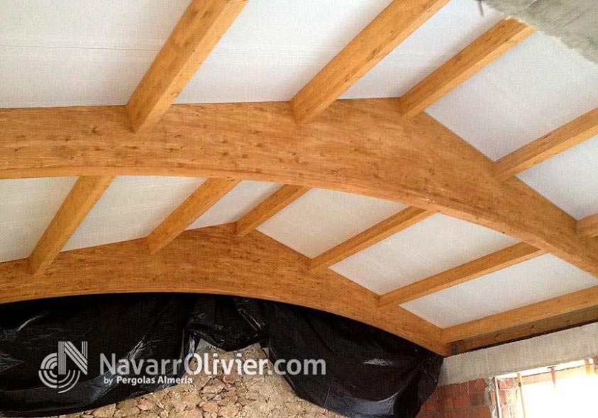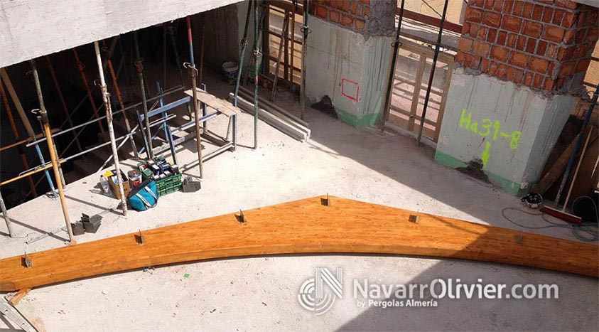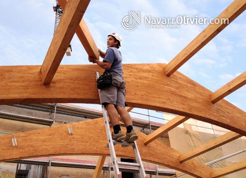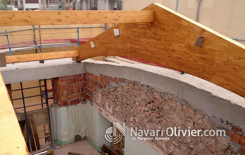 Estructura principal en cerchas de madera laminada encolada en forma de flecha con correas unidas mediante estribos ocultos.
