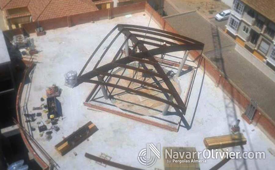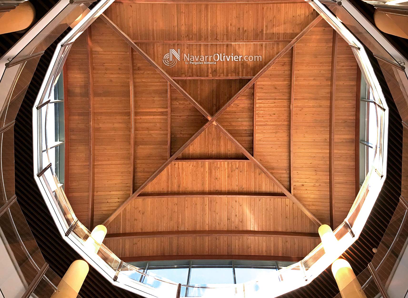 Cúpula semi esférica ó bóveda vaída de 10 m de radio sobre pilares extra plomados de obra con herrajes metálicos de sugesión, atado de las correas a las vigas principales mediante estribos ocultos de aluminio. Friso en madera machihembrada de pino rojo. Aislamiento exterior en cobre.