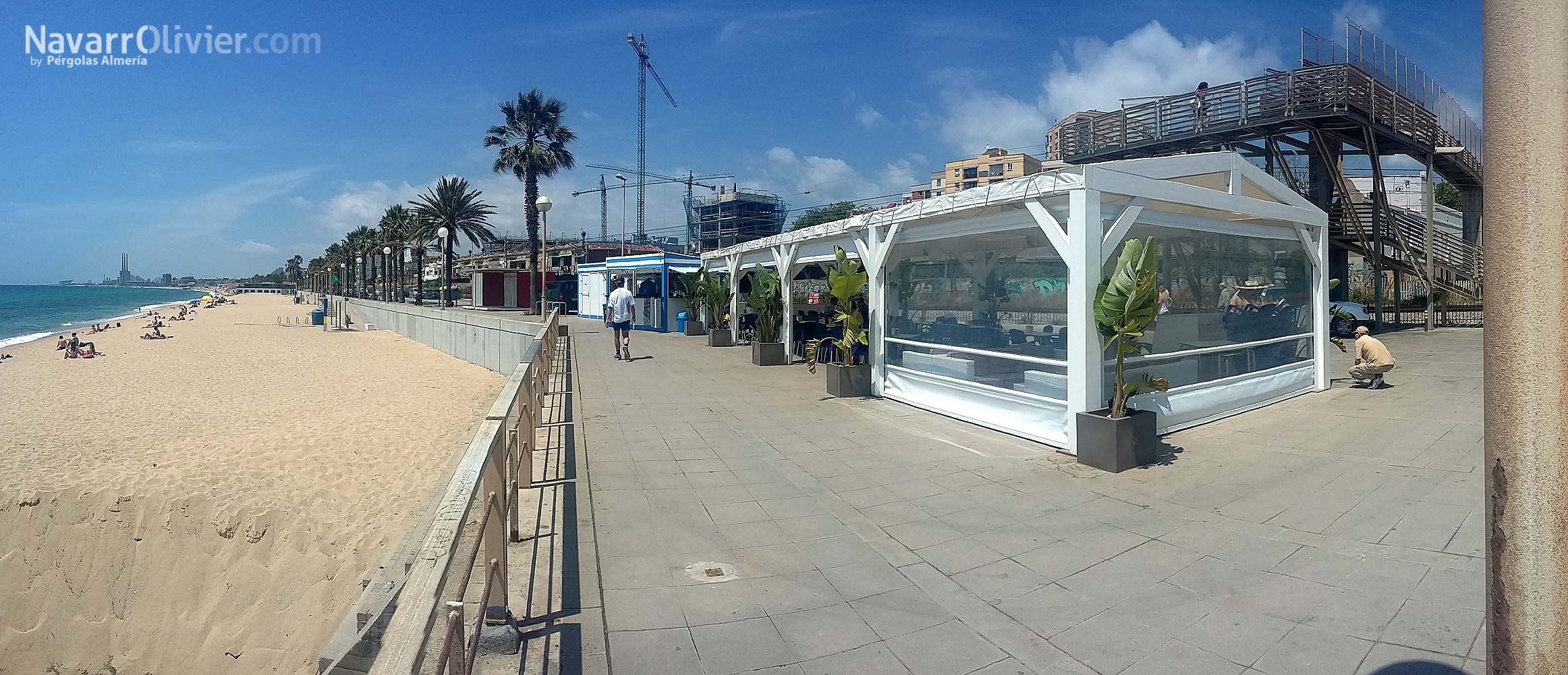 Las instalaciones cuentan con módulo de aseos accesibles para personas con movilidad reducida equipados ademas con cambiadores de bebes. El chiringuito modelo Castelldefels, de 20 m2 ha sido configurado con cocina y zona de bar. Su amplia terraza cubierta con una pérgola de madera para exterior cuenta además con un cerramiento enrrollables que protege de la brisa sin perjudicar las vistas.