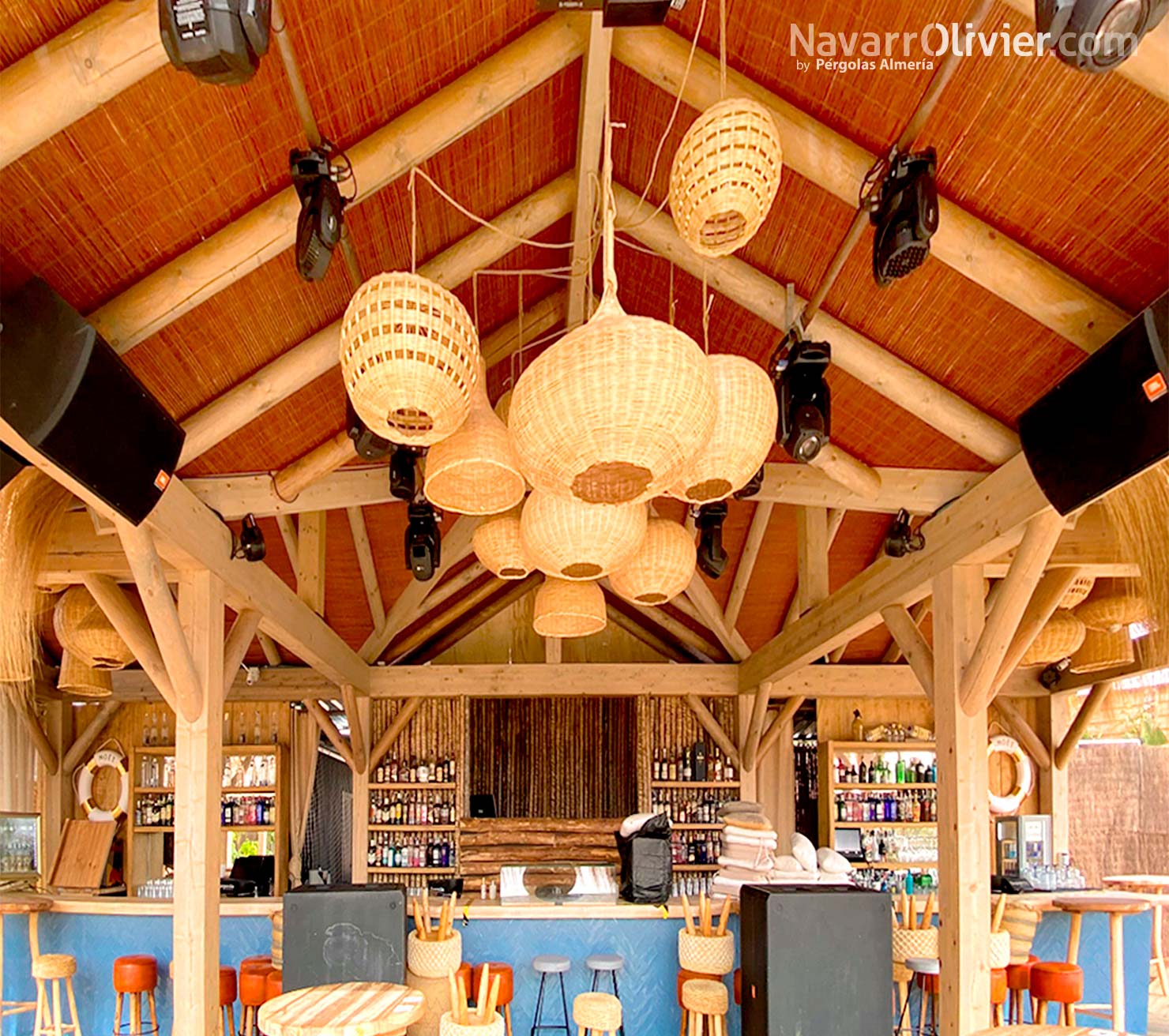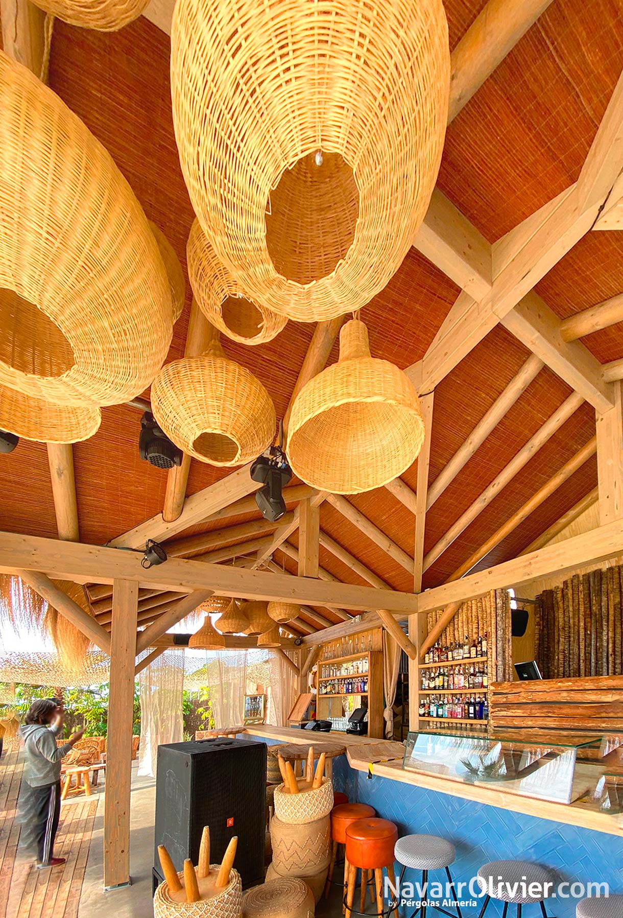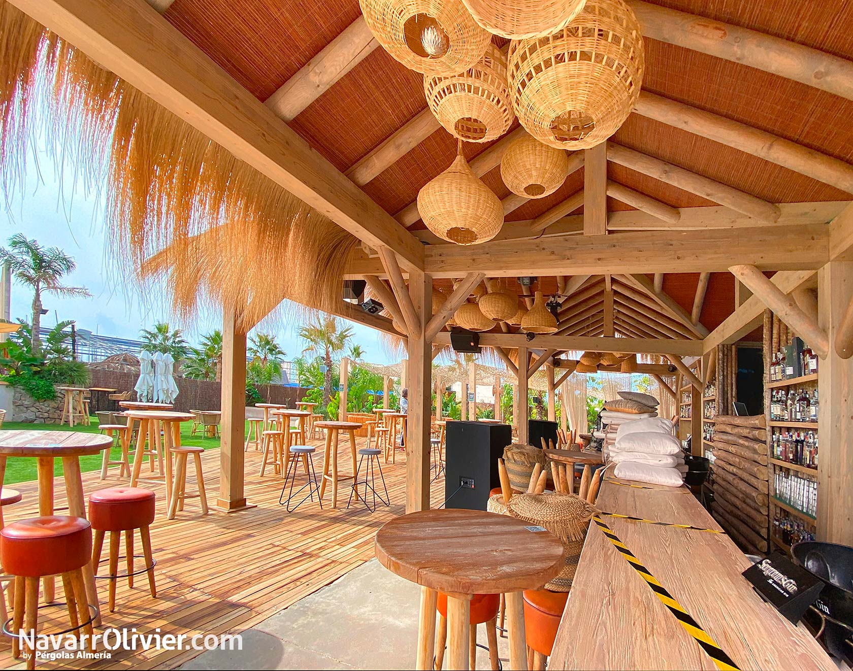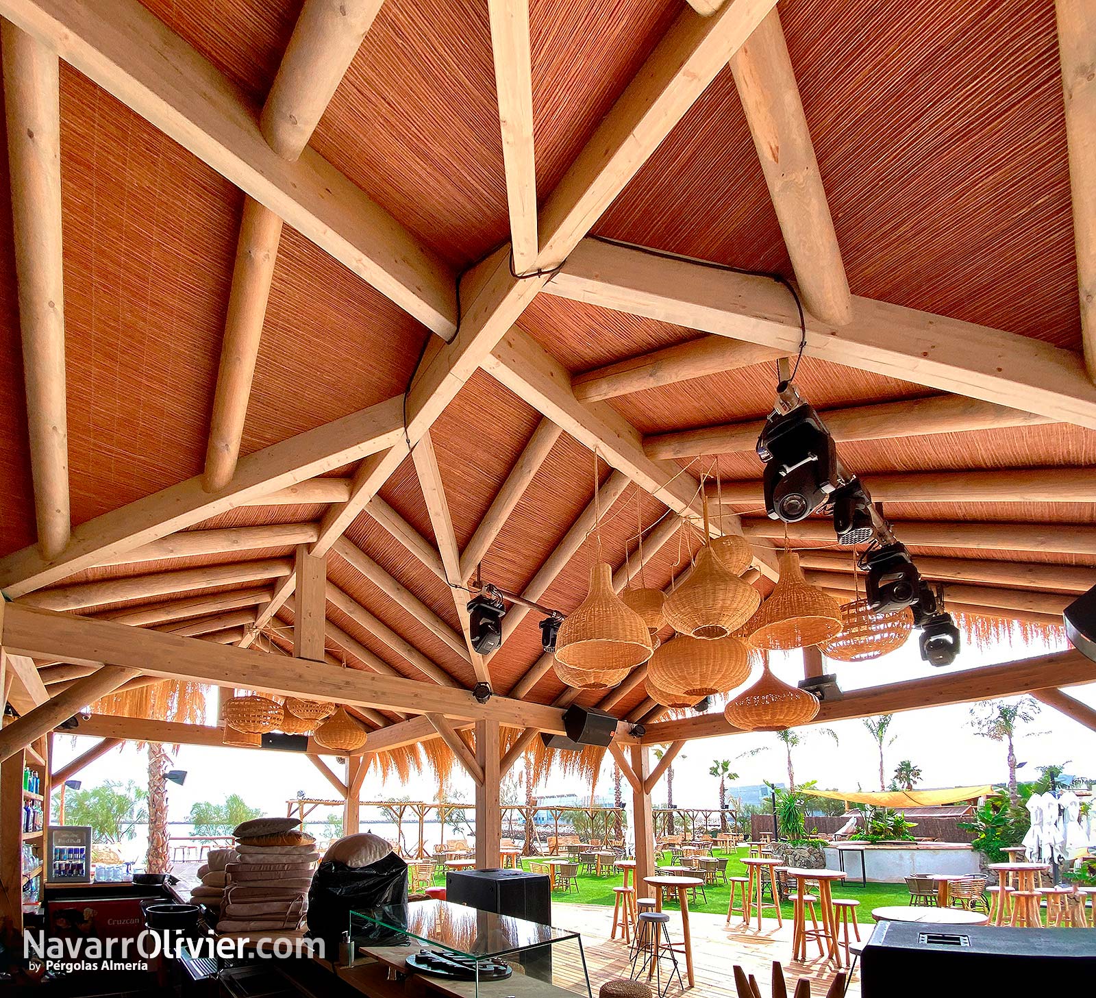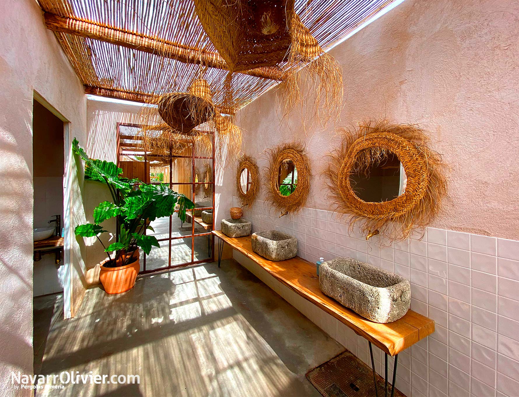 Para este proyecto se buscaba una estética natural para crear un espacio abierto protegido del sol destacando entre los elementos constructivos las fibras naturales.