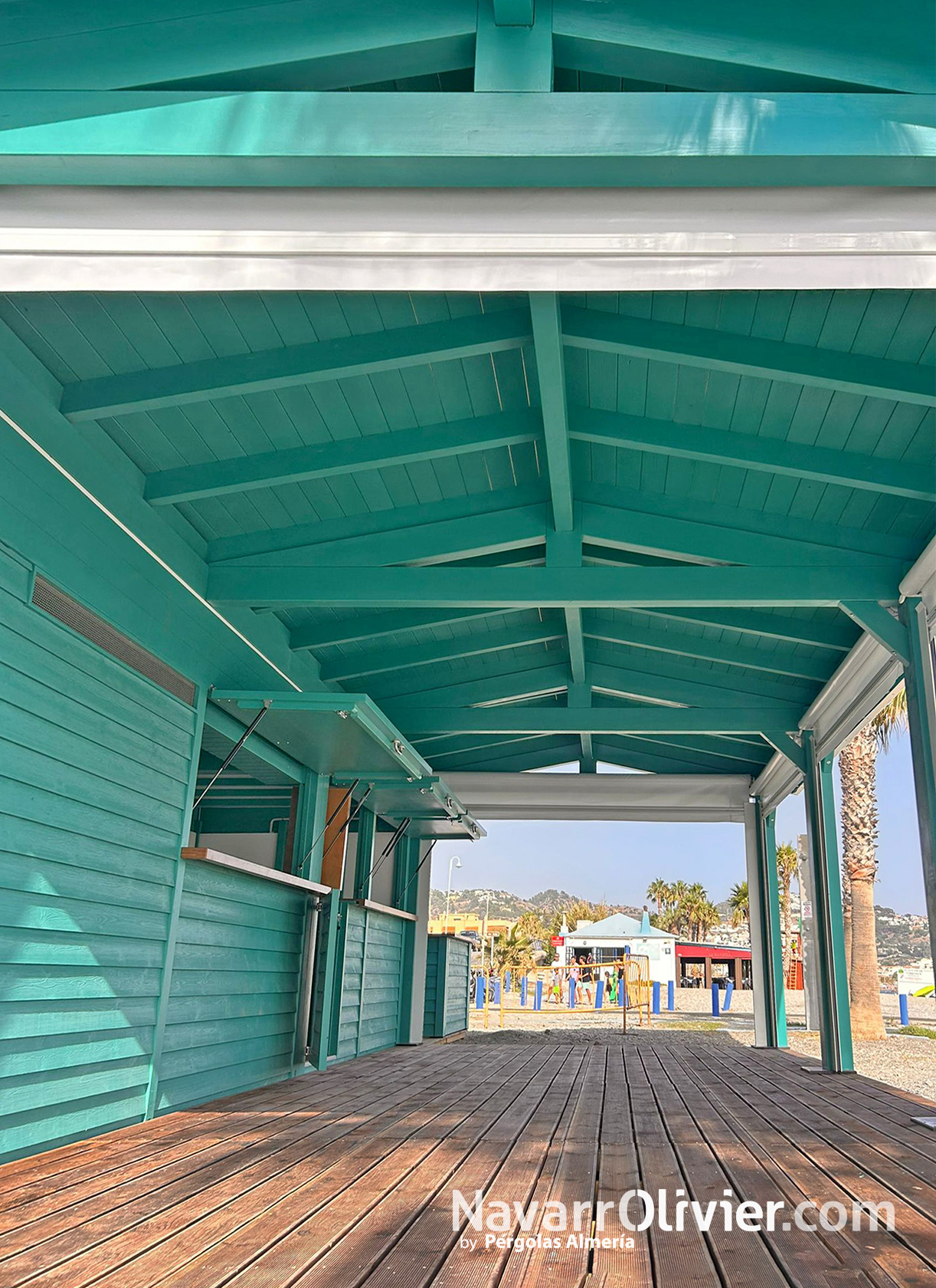 El chiringuito Mercato Beach, cuenta además una terraza cubierta por pérgola a 2 aguas de madera laminada con cerramiento de toldos enrrollables, montada sobre deck de tarima autoclave.