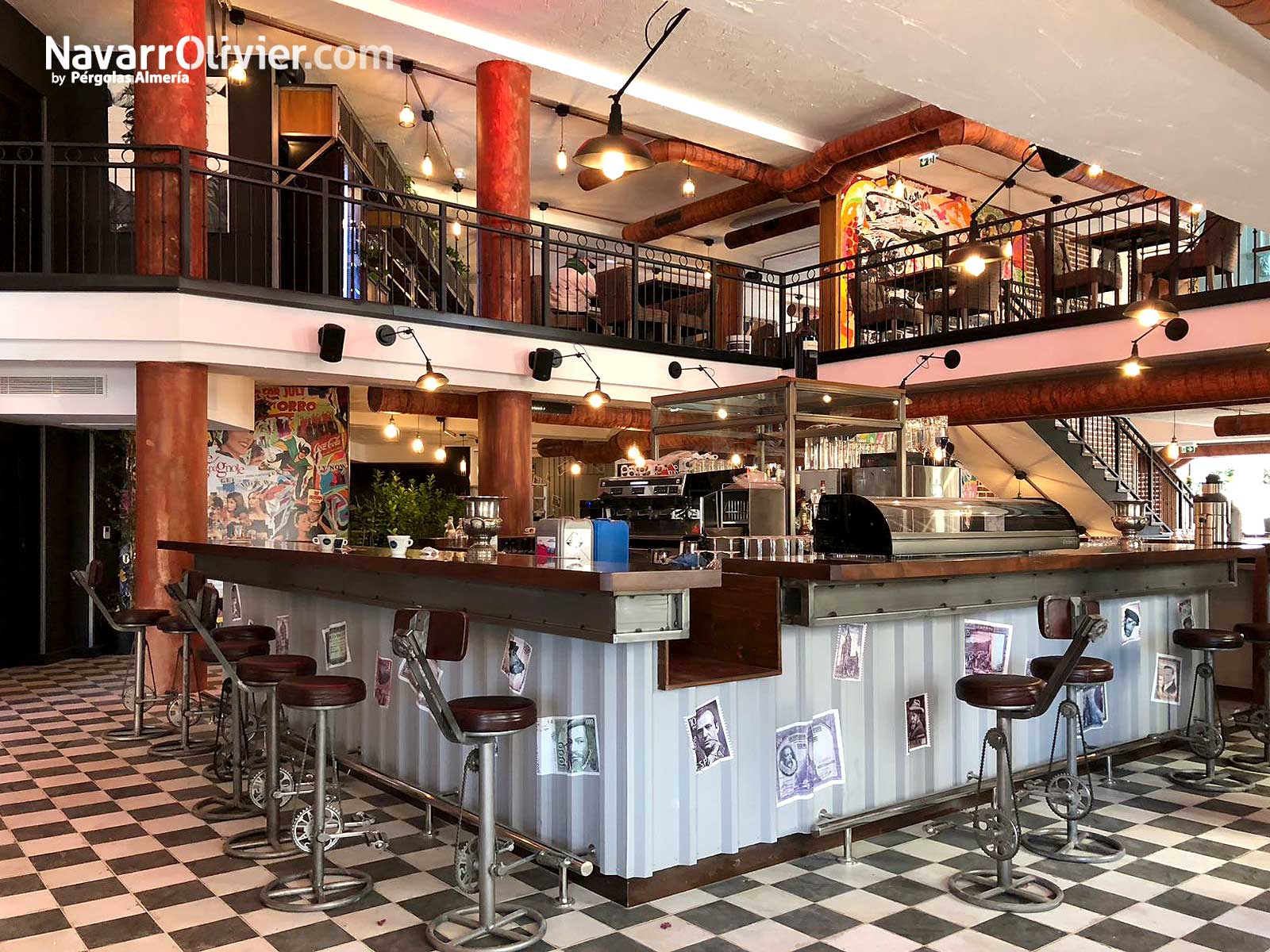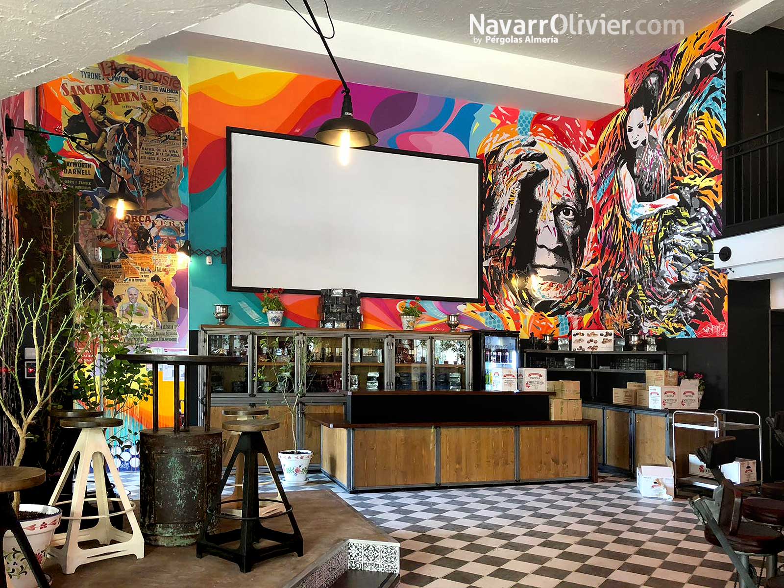 Su ecléctico interiorismo se inspira en un film hispano-frances «làuberge espagnole», el local de 980 m2 combina estilo industrial vintage con el street art que viste sus muros.