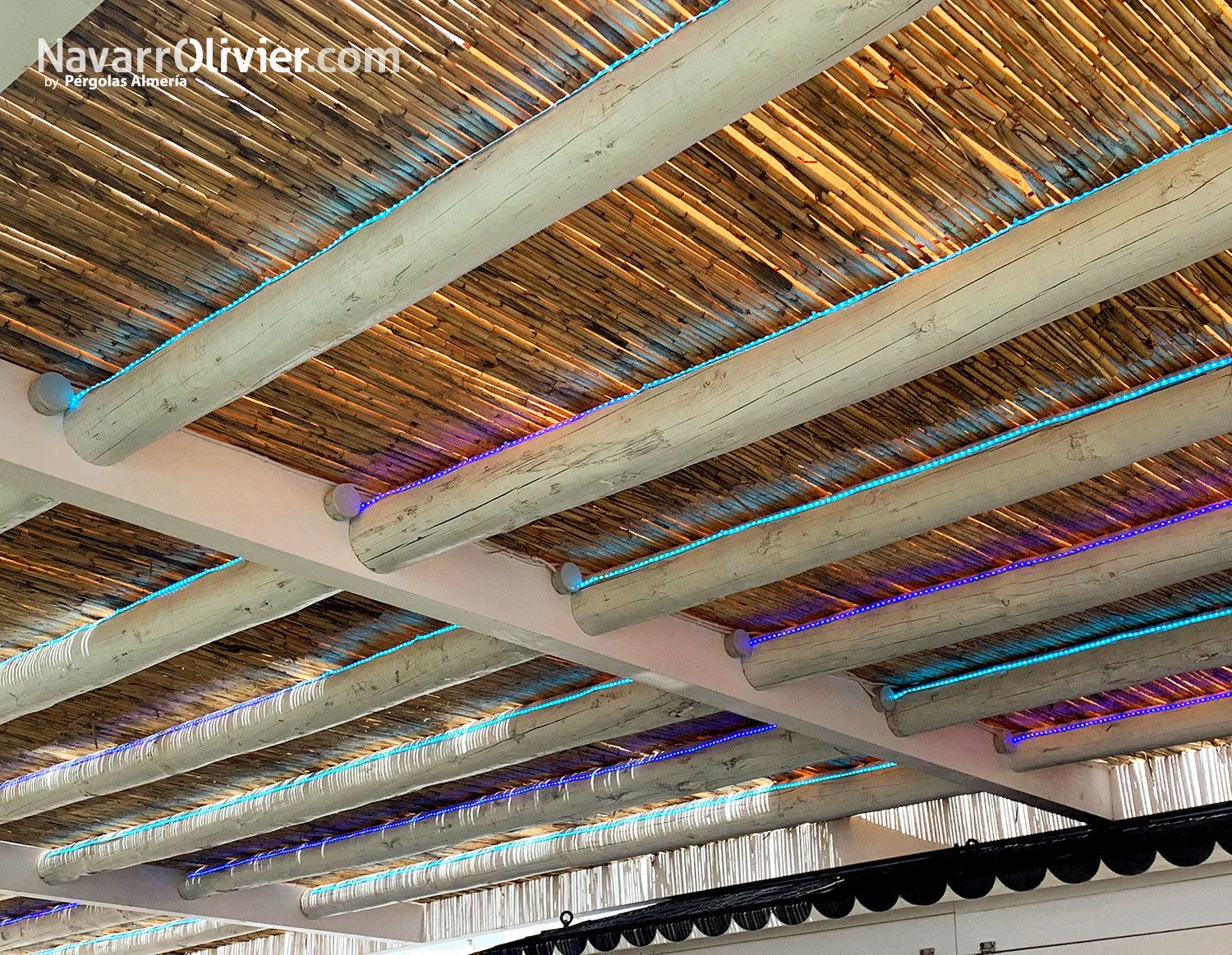 Terraza equipada con pérgola construida en madera lamina y tronco calibrado acabados en blanco, cubierta en cañizo natural equipada con iluminación decorativa en LED rgb con control DMX.