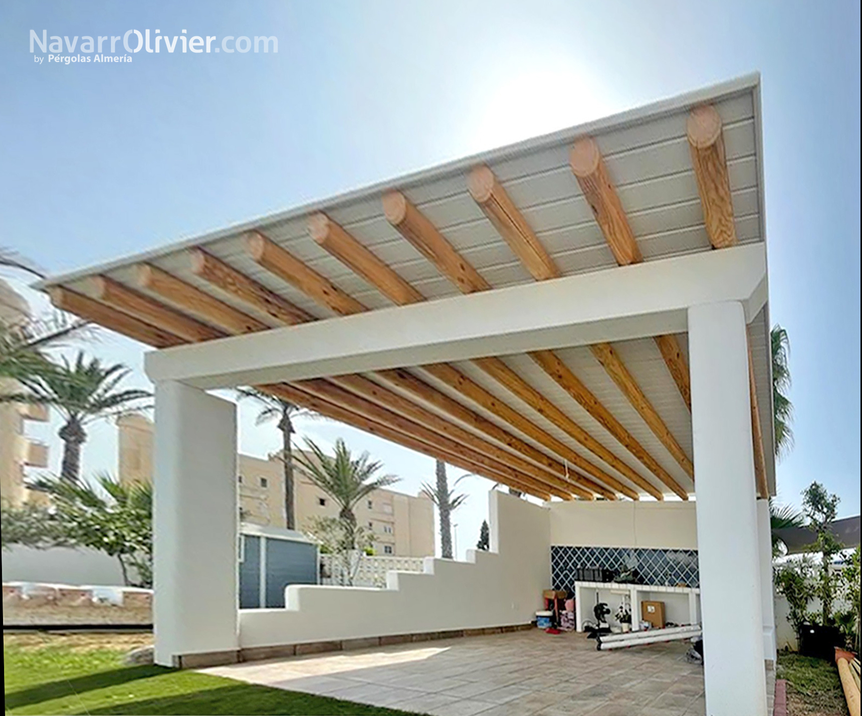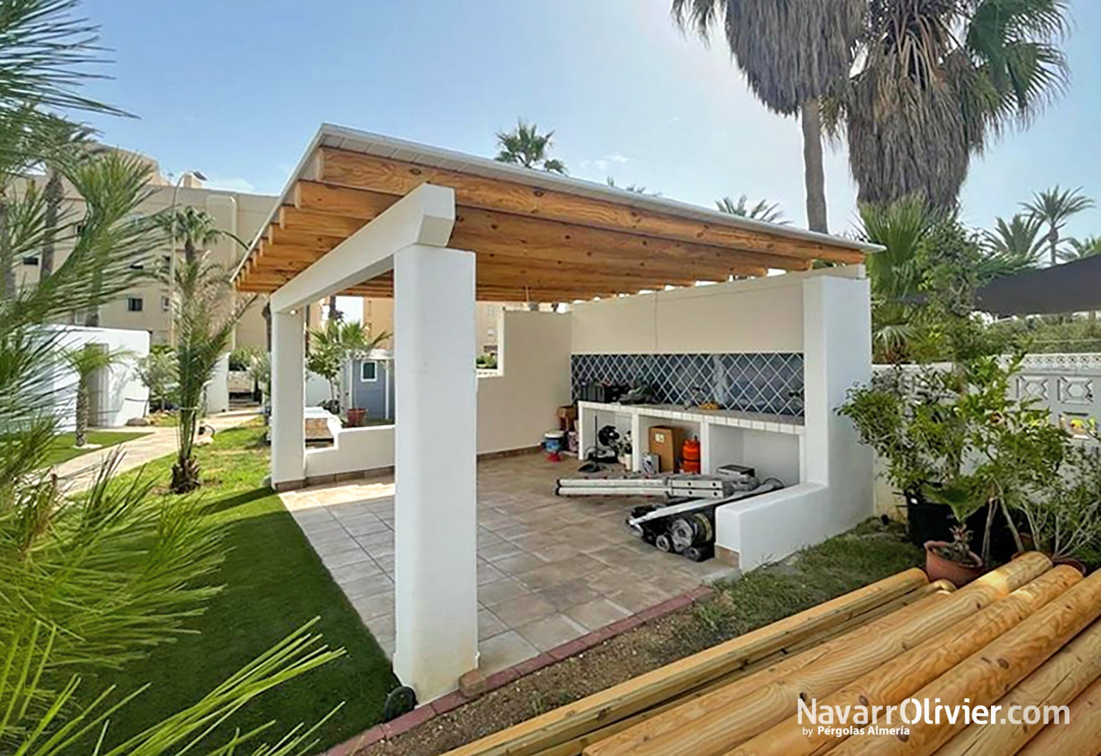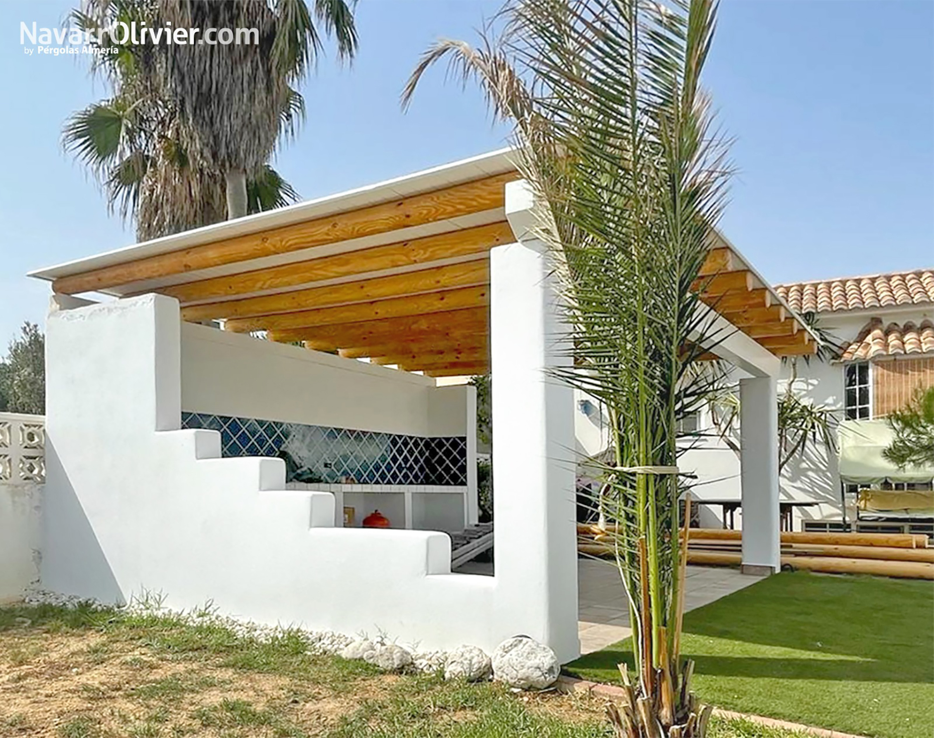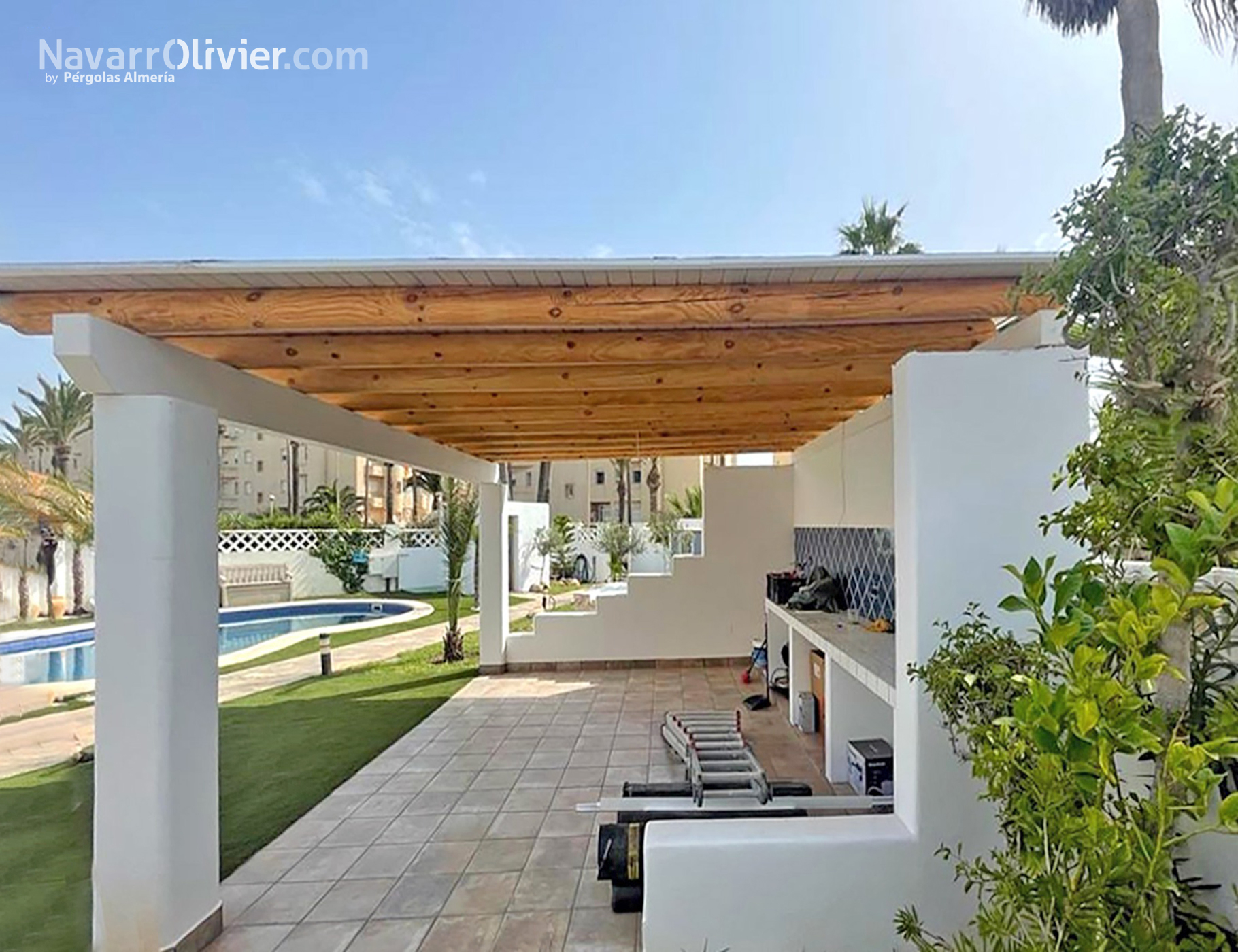 La estructura adosada al muro y los pilares de obra, está compuesta por una jácena de madera laminada y cabios de palo calibrado de pino, ambos tratados para exterior.