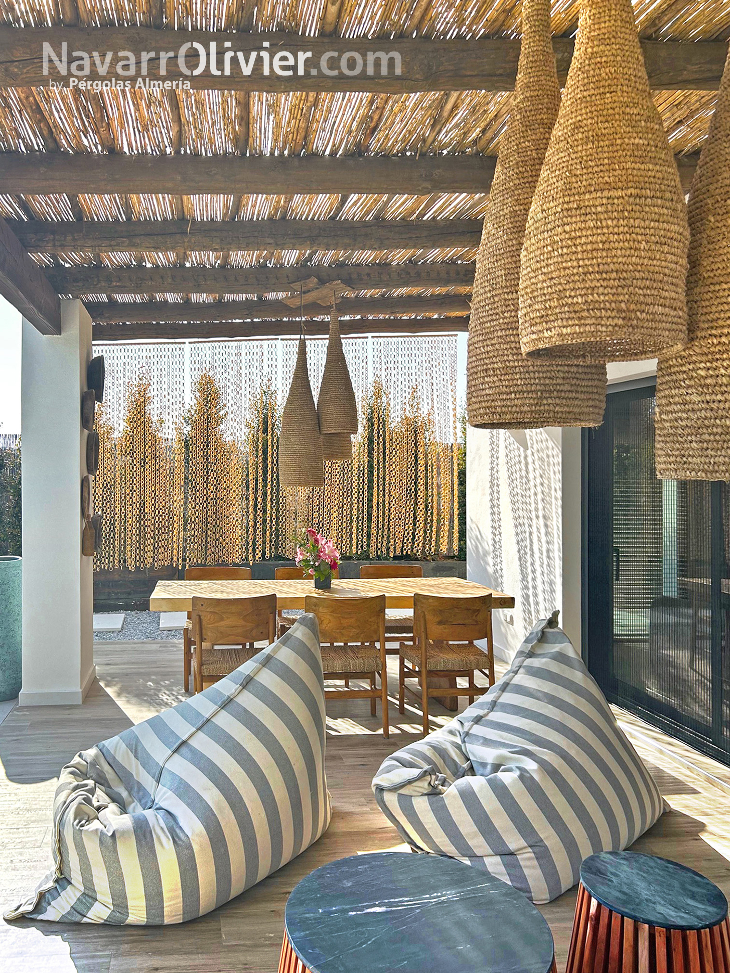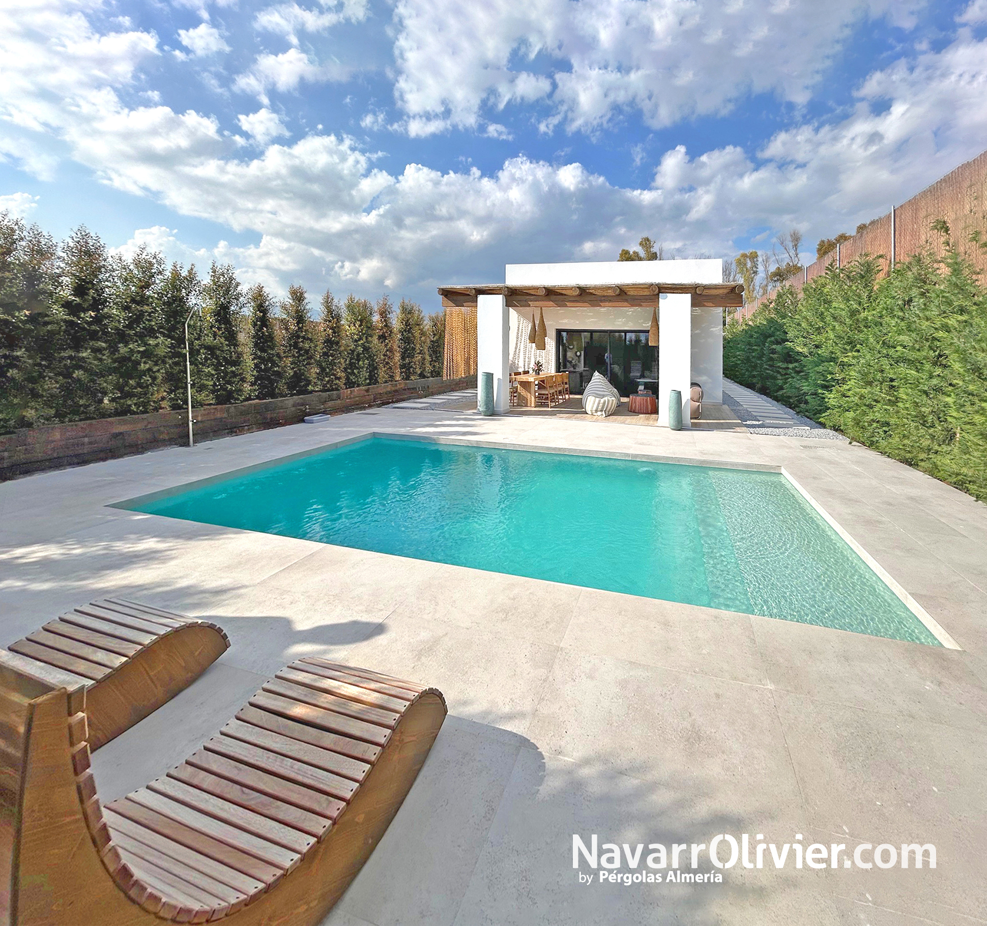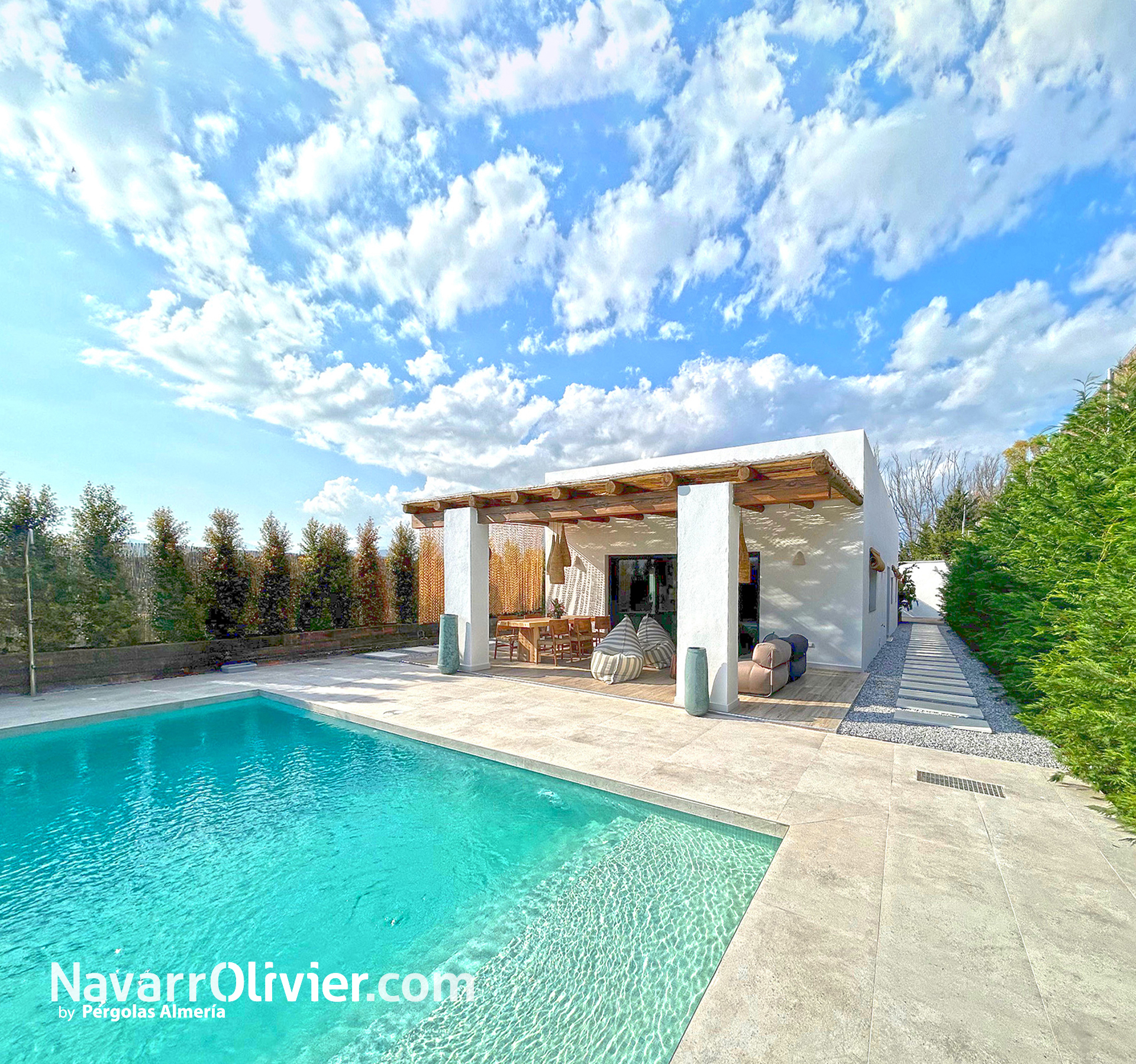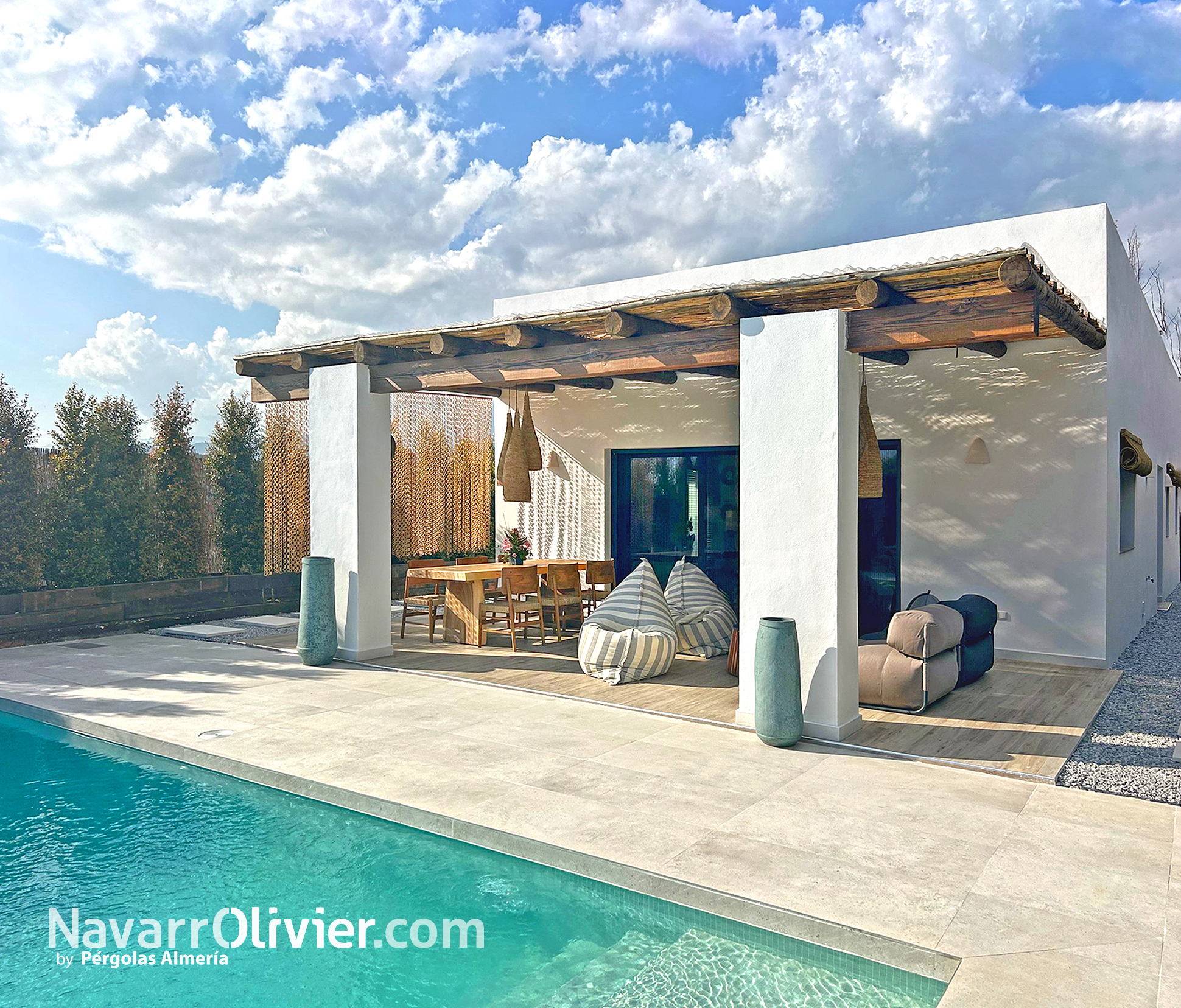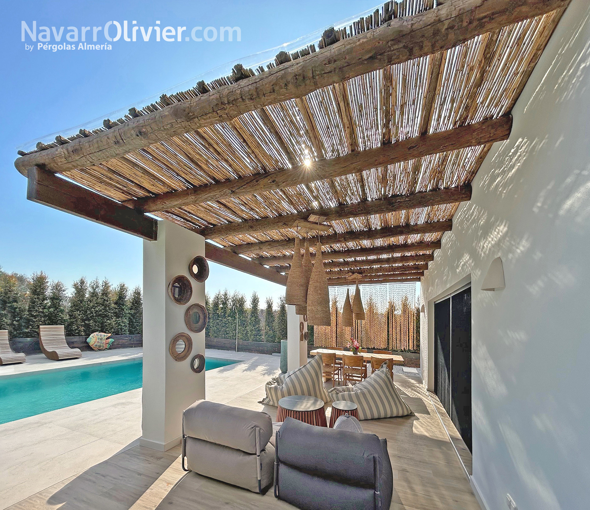 Pérgola adosada natural para jardín con piscina en Nueva Andalucía, Marbella, Málaga.