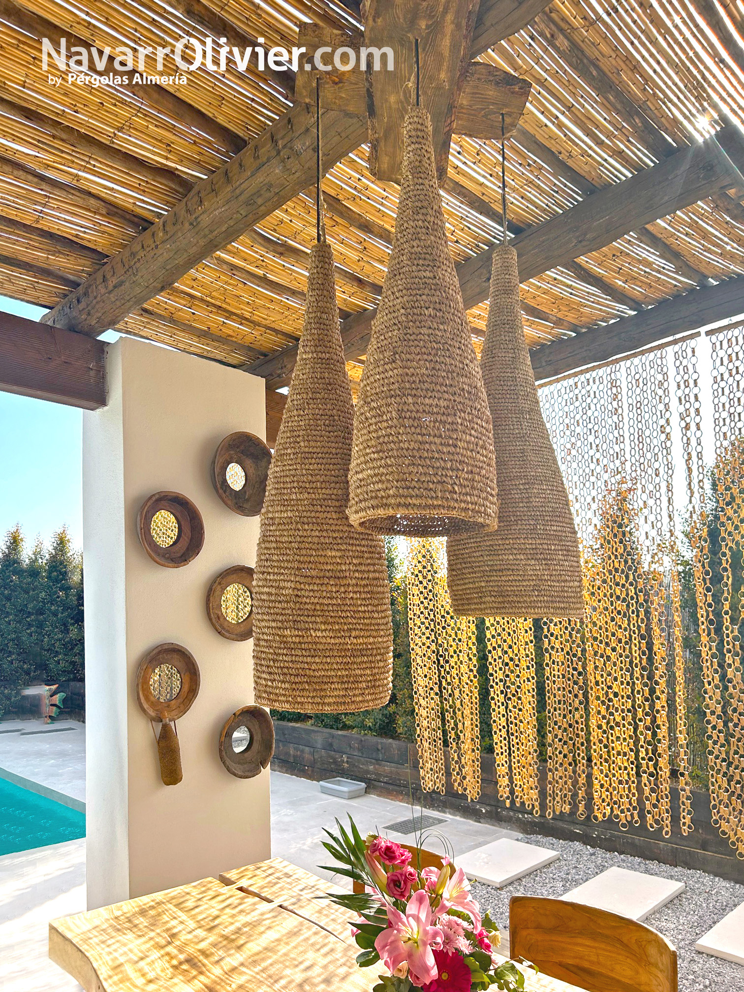 Pérgola de madera, tronco y caña en Nueva Andalucía, Marbella, Málaga.